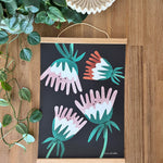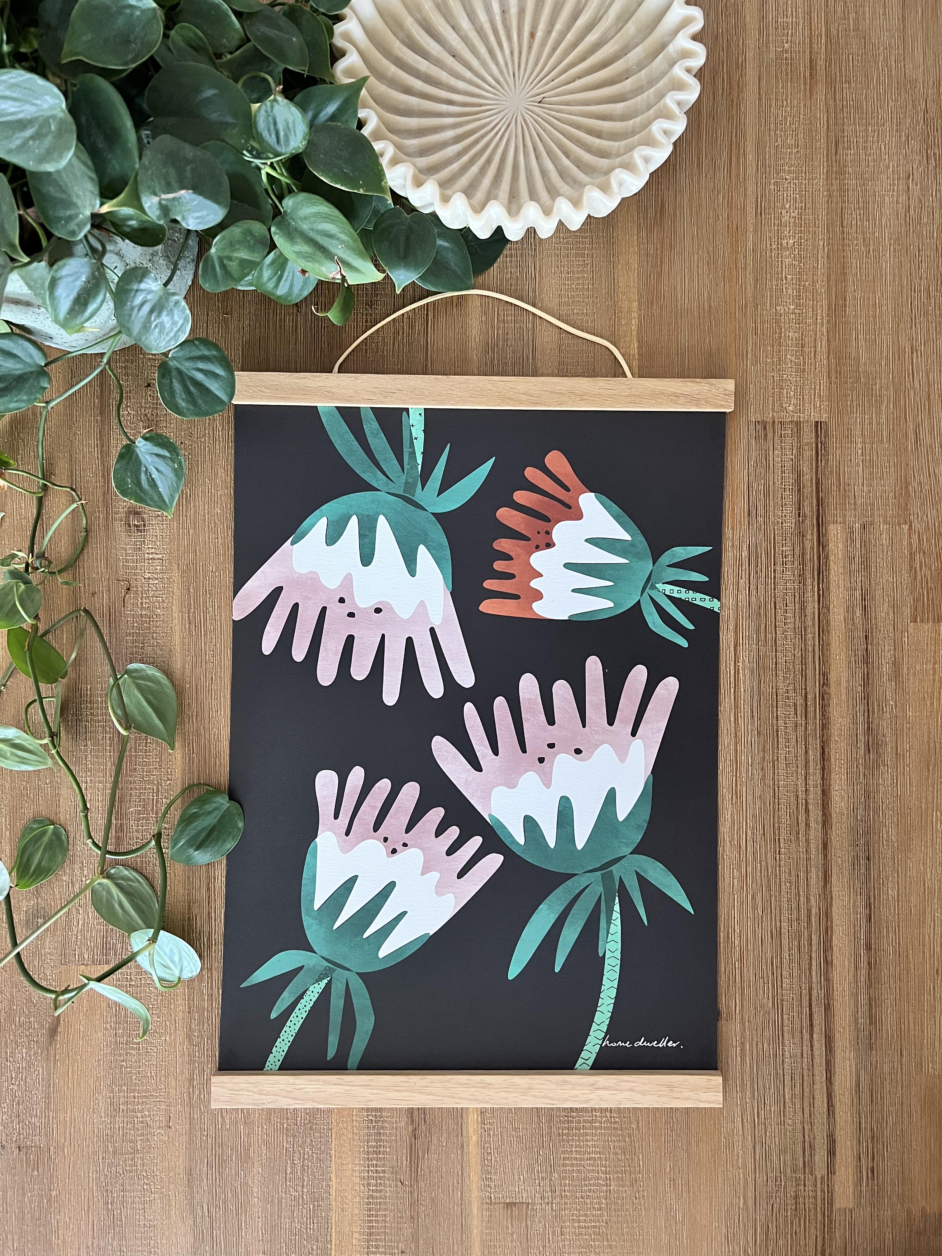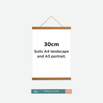 Just clamp your art between the two wood bars on top and bottom and it's ready to hang!