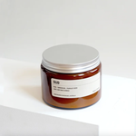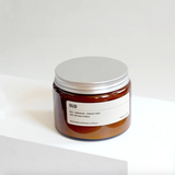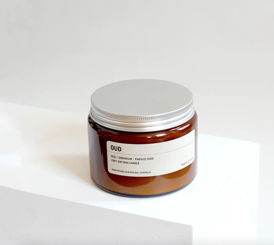 Natural 100% soy wax candle set in an amber glass jar, topped with an aluminium screw top lid.
