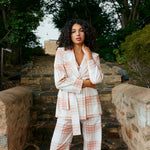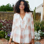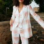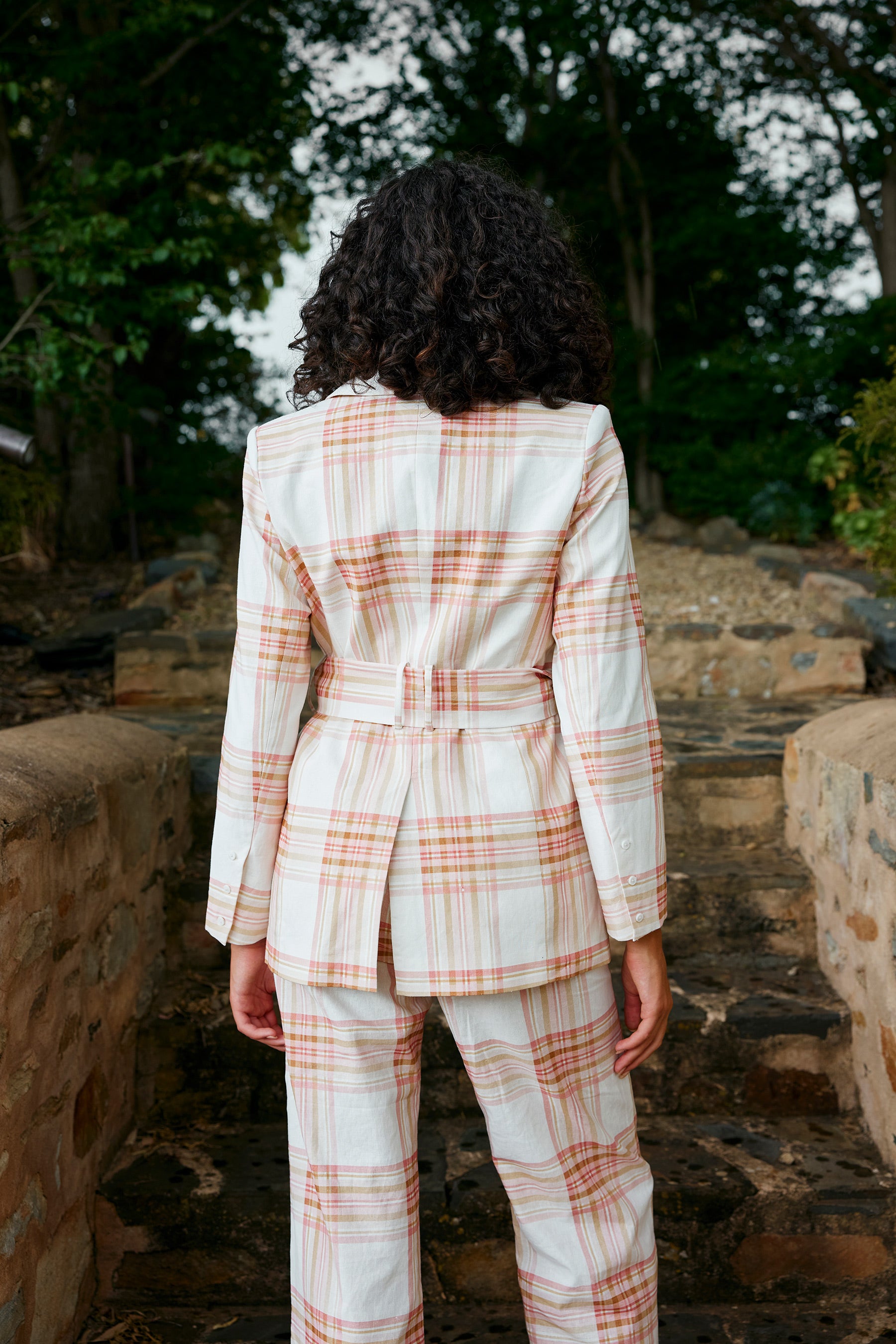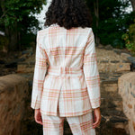Make a statement in this effortlessly elegant plaid blazer. Crafted in a soft, neutral-toned check pattern, this tailored piece features a classic lapel, structured shoulders, and a belted waist for a flattering, cinched silhouette. Perfect for layering over matching trousers or pairing with denim for a refined yet relaxed look.