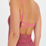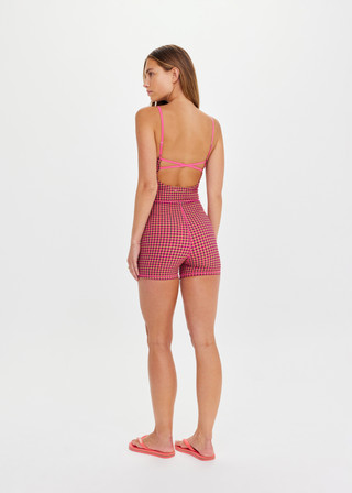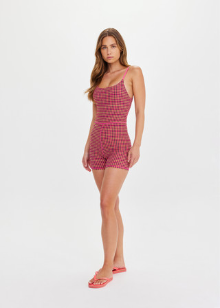 A nostalgic check with a modern twist, the Aliki Kiva Bodysuit, a part of The Upside's 'Sweat to Swim' range.