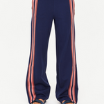 A navy wide-leg pant finished with textured stripes in pink, gold and navy.