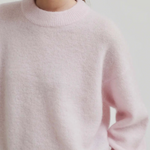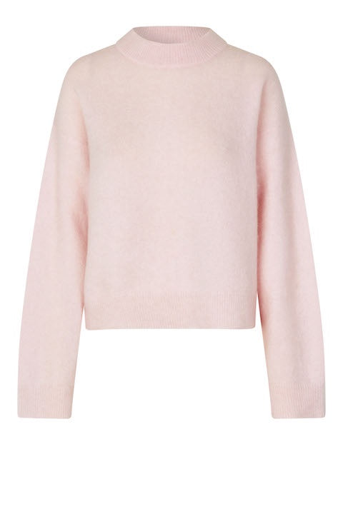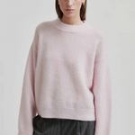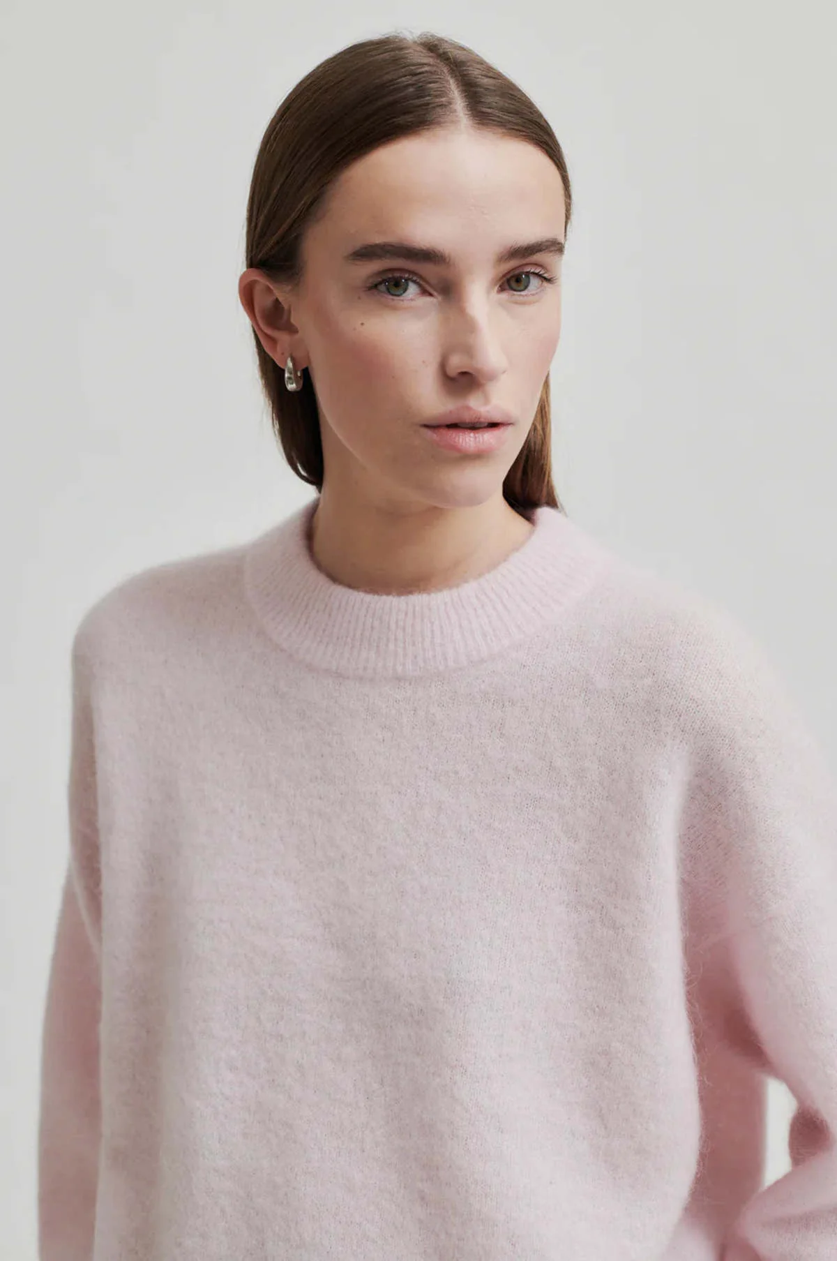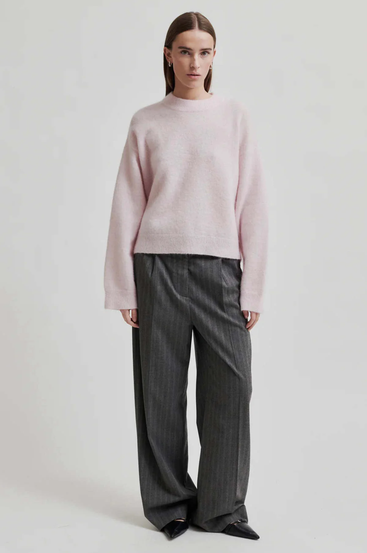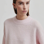 Second Female slouchy pullover. Made in a soft and stretchy mohair blend with fluffy quality. Featuring a round neckline and dropped shoulders with long sleeves. Ribbed neck, cuffs and bottom hem. Wide fit with sloped side seams that add extra shape to the relaxed silhouette.