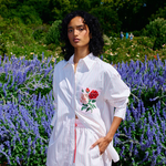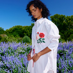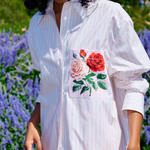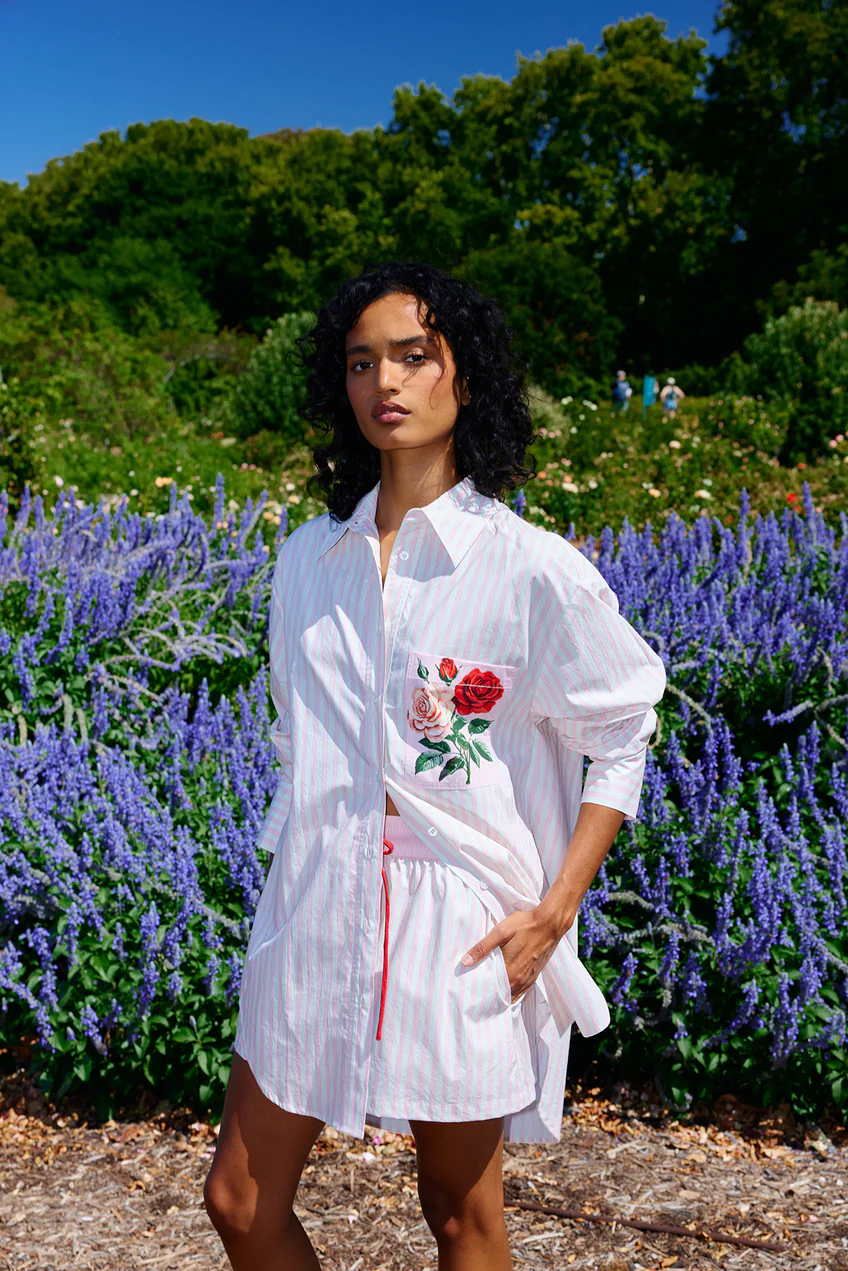 Aston Studio's signature Buddy Shirt is reimagined in a soft Baby Stripe, with a rose placement print pocket detail. With a relaxed silhouette and long sleeves, the Buddy is a versatile staple that seamlessly enhances any look.