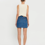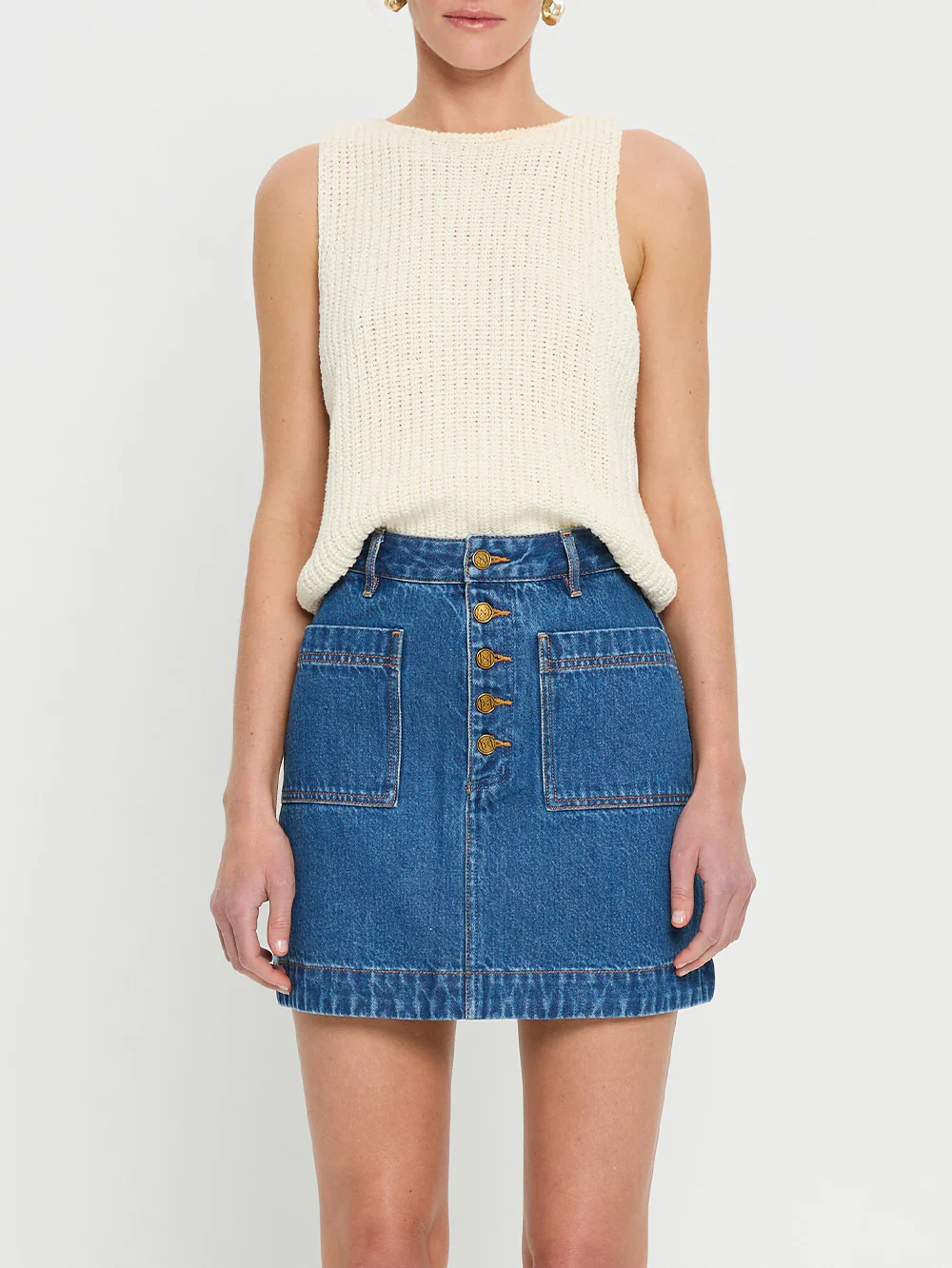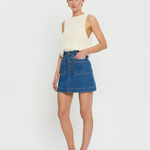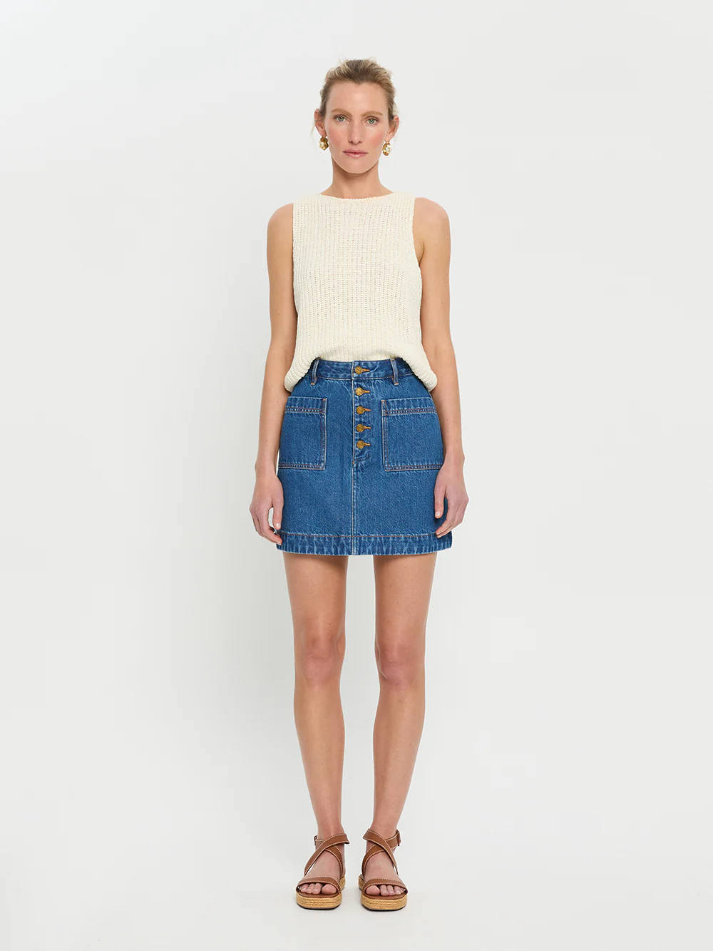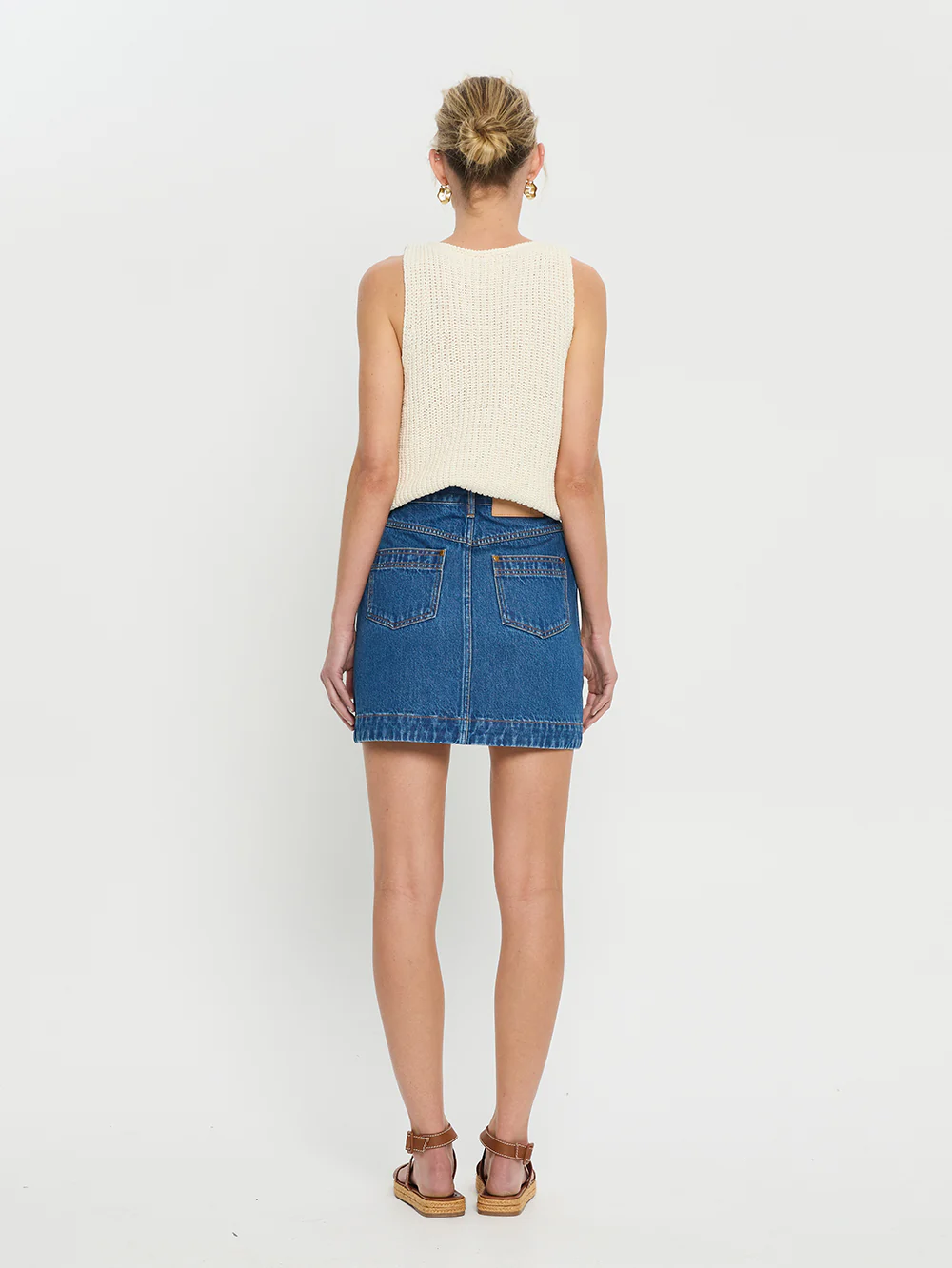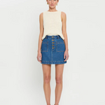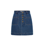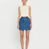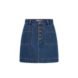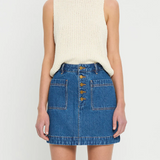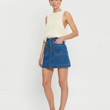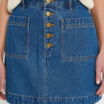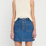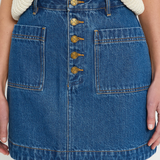 The Cameron Denim Mini Skirt features contrast topstitching, front fold over pockets, complete with antique brass logo hardware.