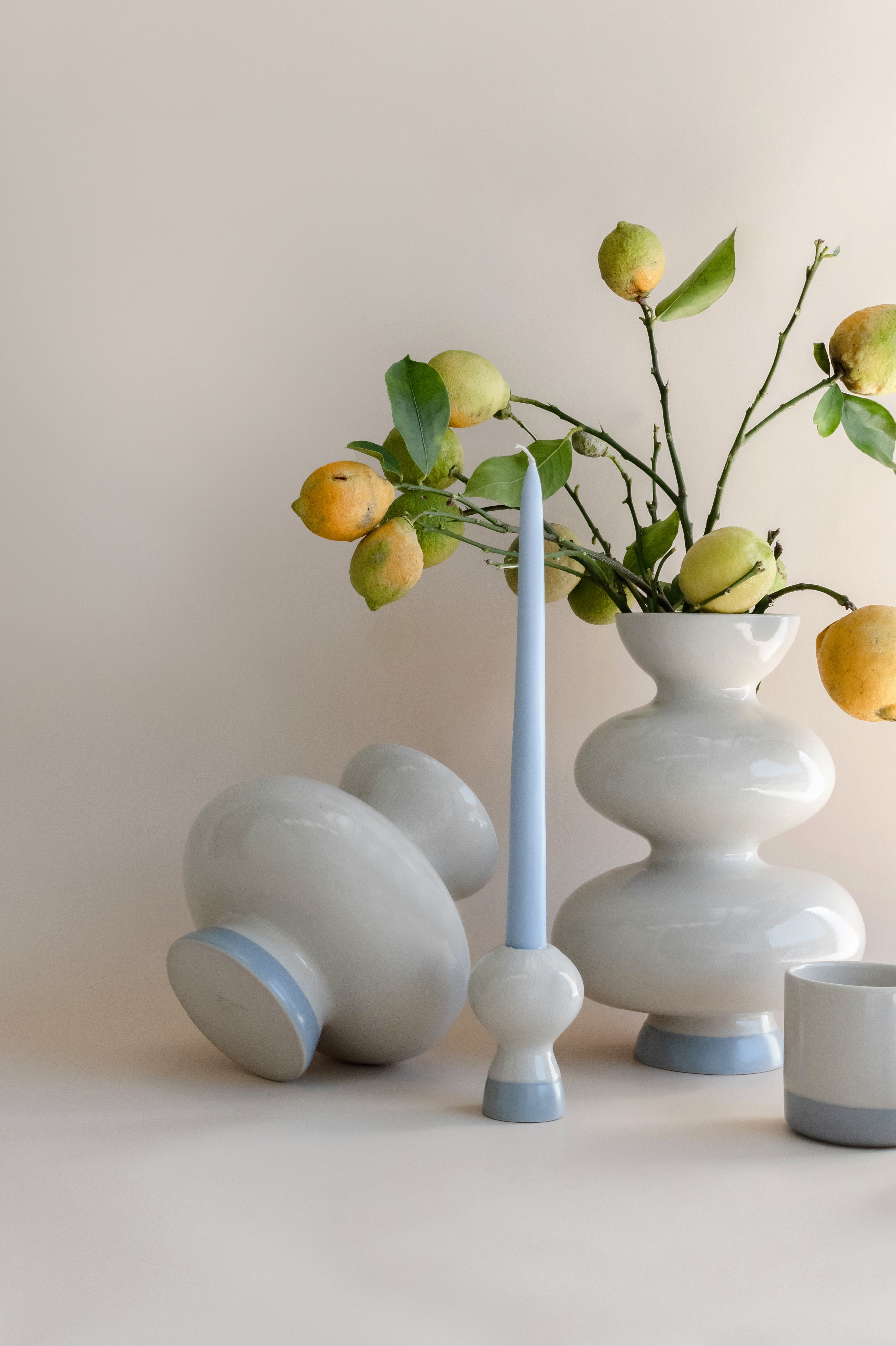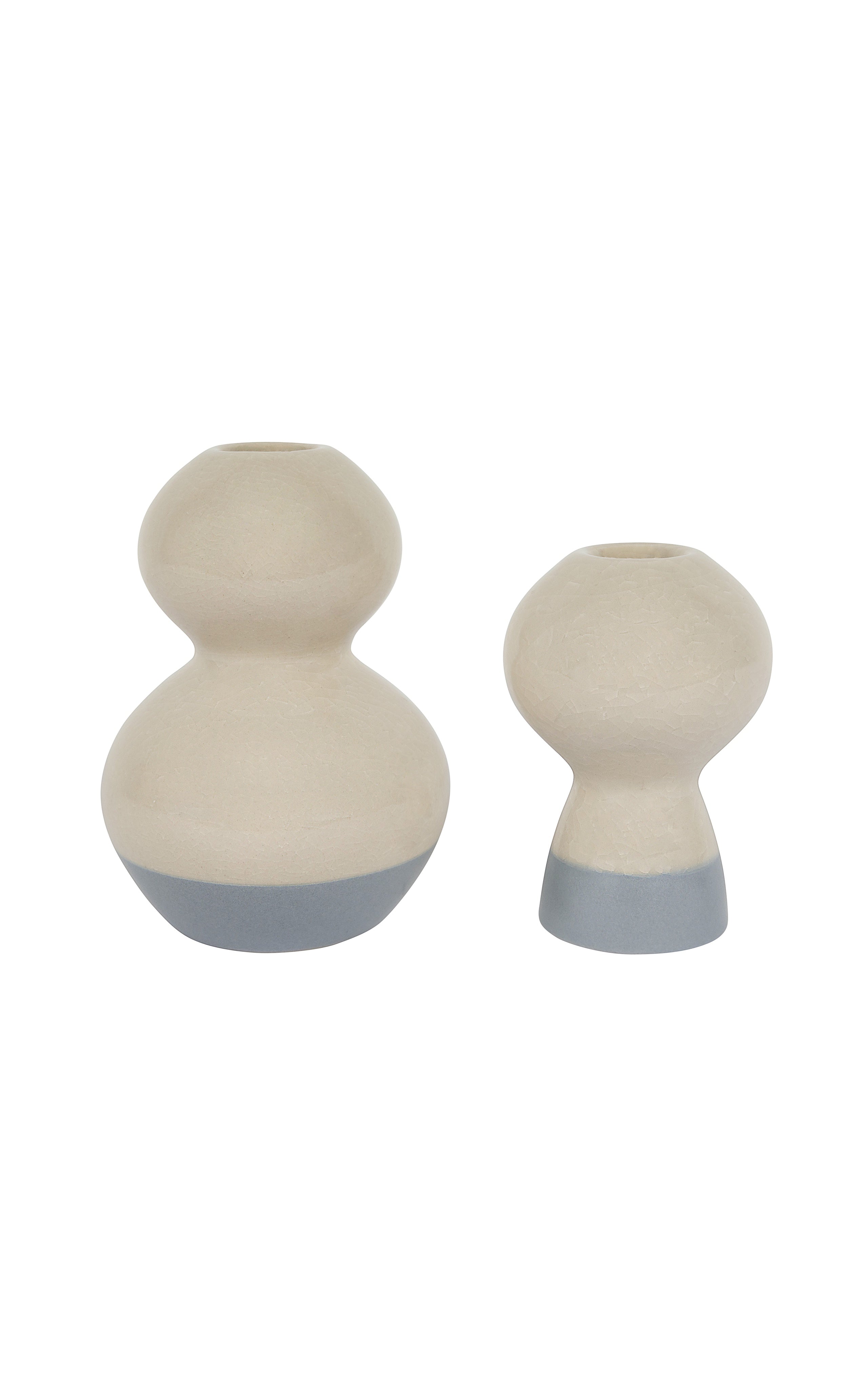 Our intention for this glaze is to bring about a calm & grounding atmosphere while highlighting the beauty in the fractures caused by extreme pressure. The surface of this incredible glaze is covered with millions of tiny fractures covering the form. This surface texture is widely known as a crackle glaze and is caused by a thermal expansion mismatch between body and glaze during the firing process. As the kiln atmosphere begins to cool, the thin layer of glaze is constricted and begins to shatter, creating a wave of hairline features to wash across the piece. The soft matte grey band to the base of the form, while being signature to Marloe Marloe works, also allows for contrast in visual texture.