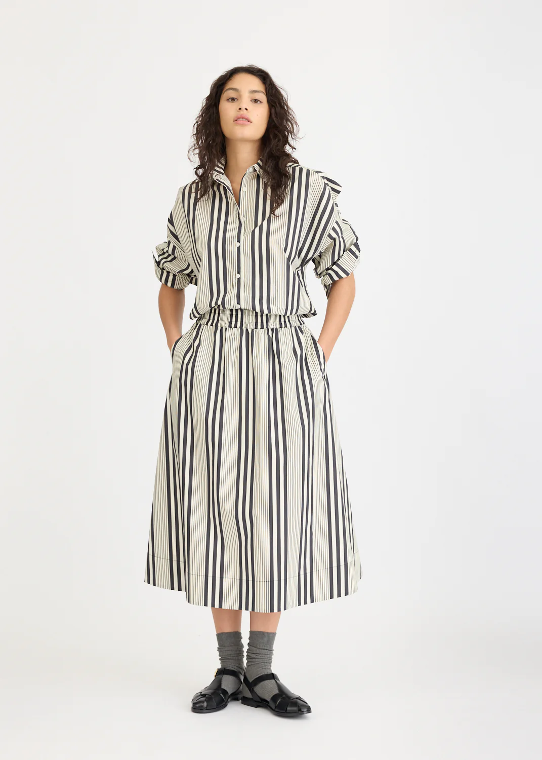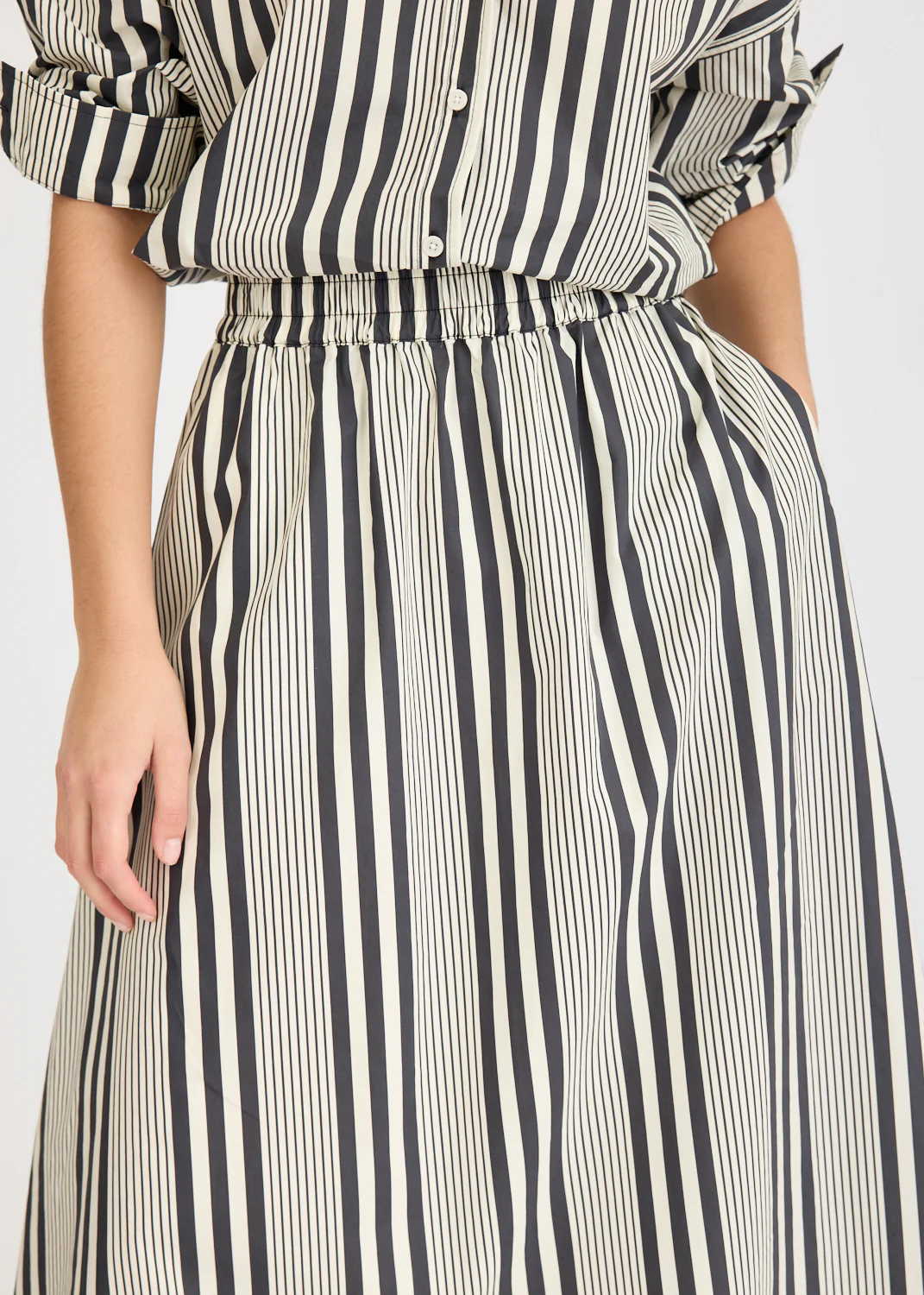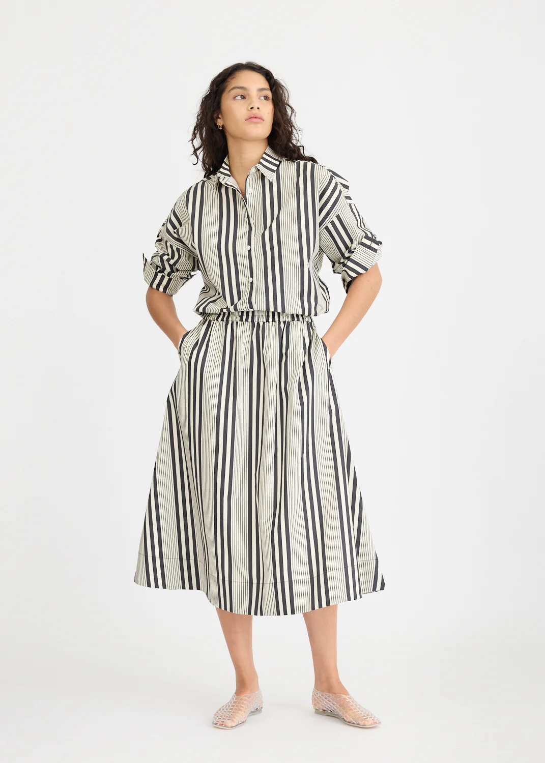An effortless staple designed to work back with everything. The Chiara Skirt in Black and Ivory Stripe is cut from 100% organic cotton with yarn-dyed fabric for lasting colour and everyday ease.