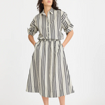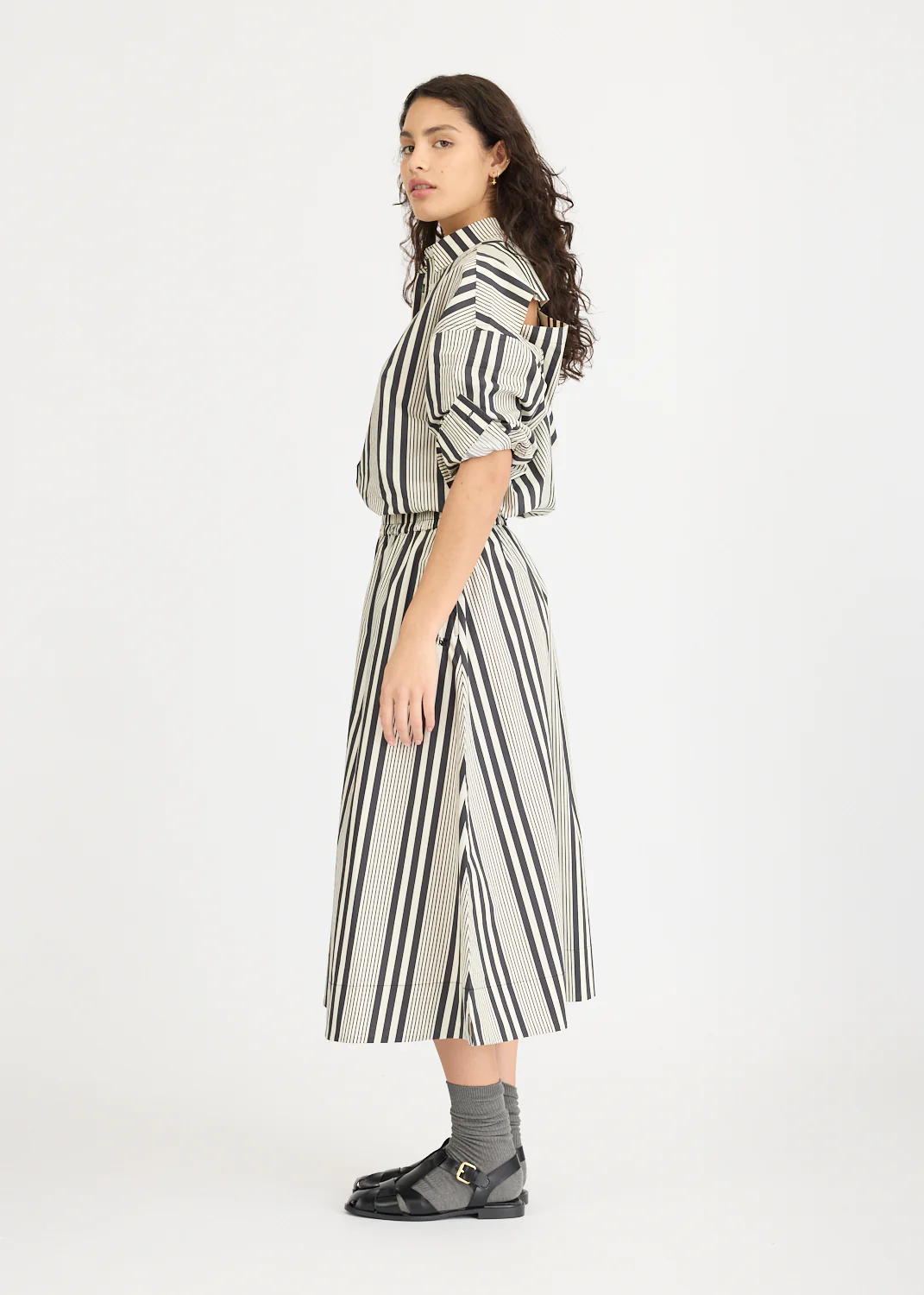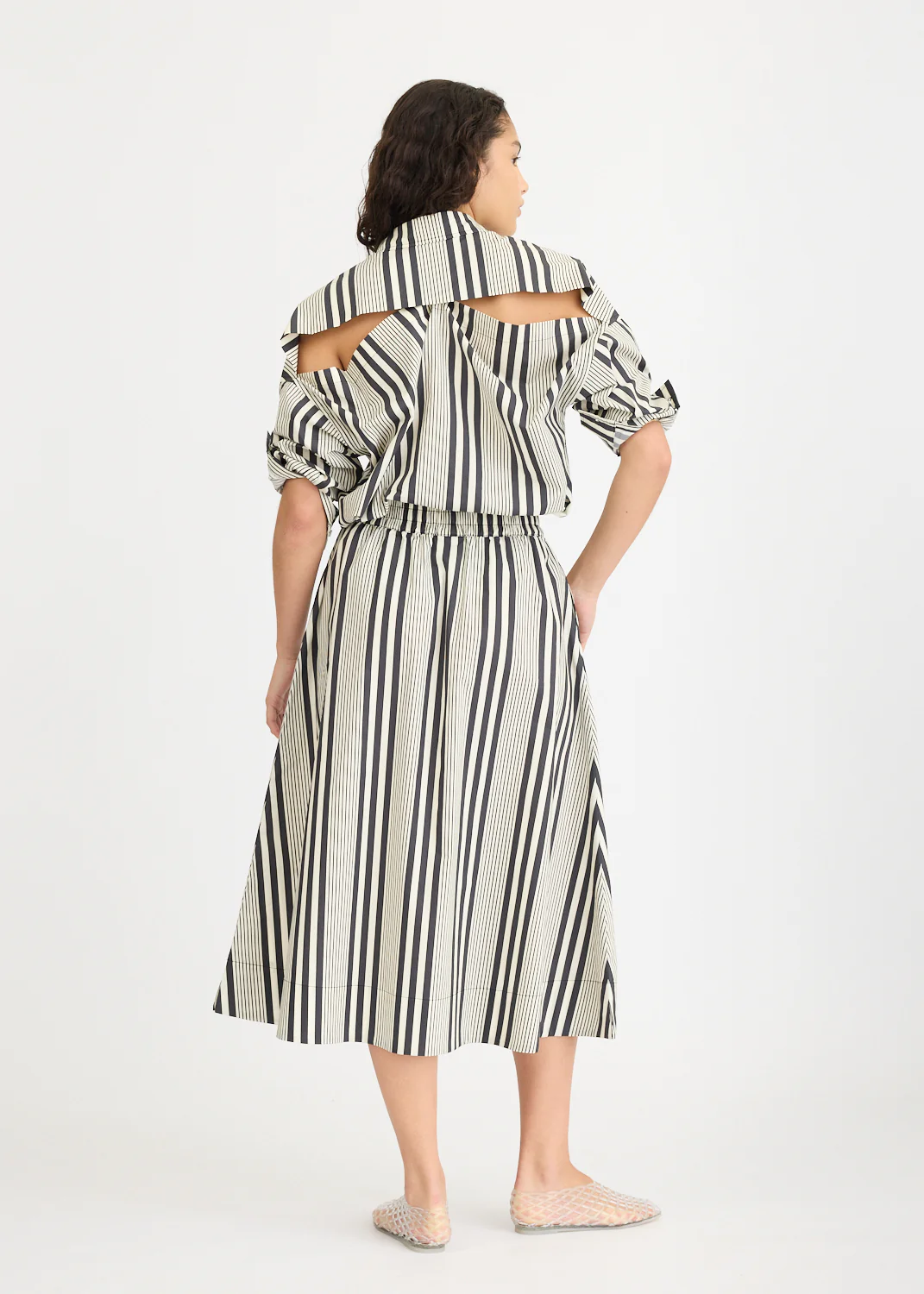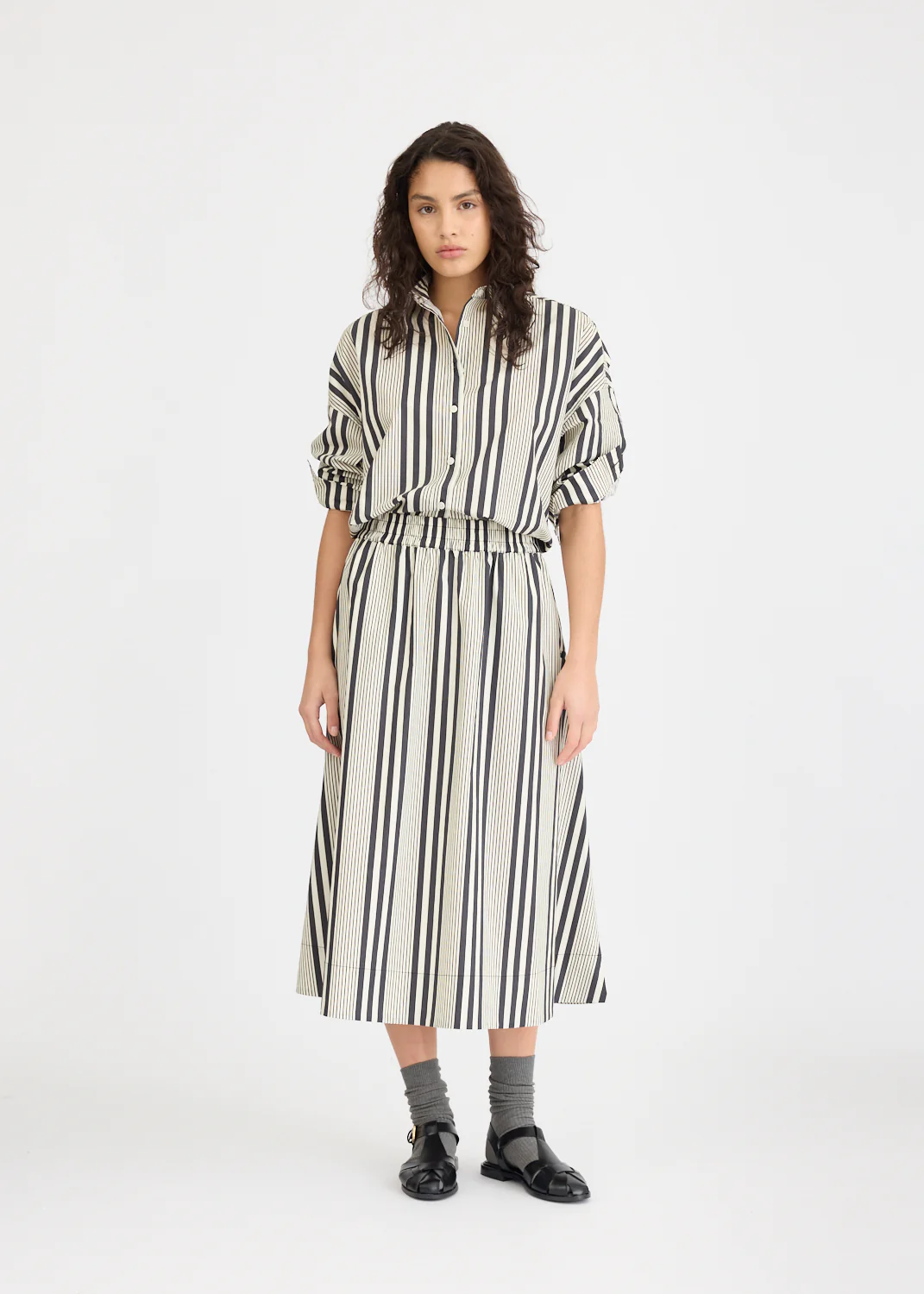 An effortless staple designed to work back with everything. The Chiara Skirt in Black and Ivory Stripe is cut from 100% organic cotton with yarn-dyed fabric for lasting colour and everyday ease.