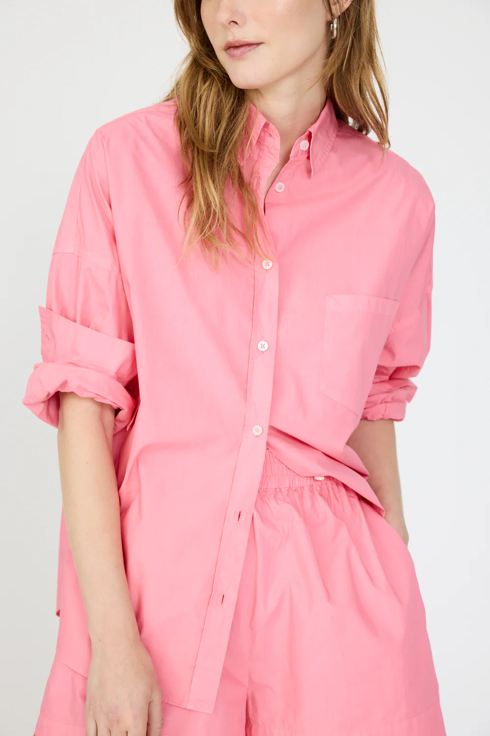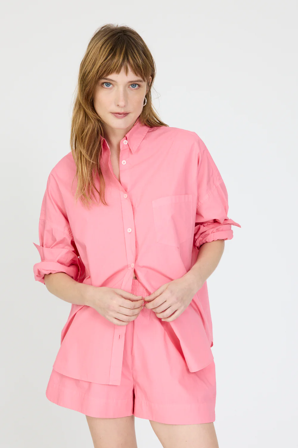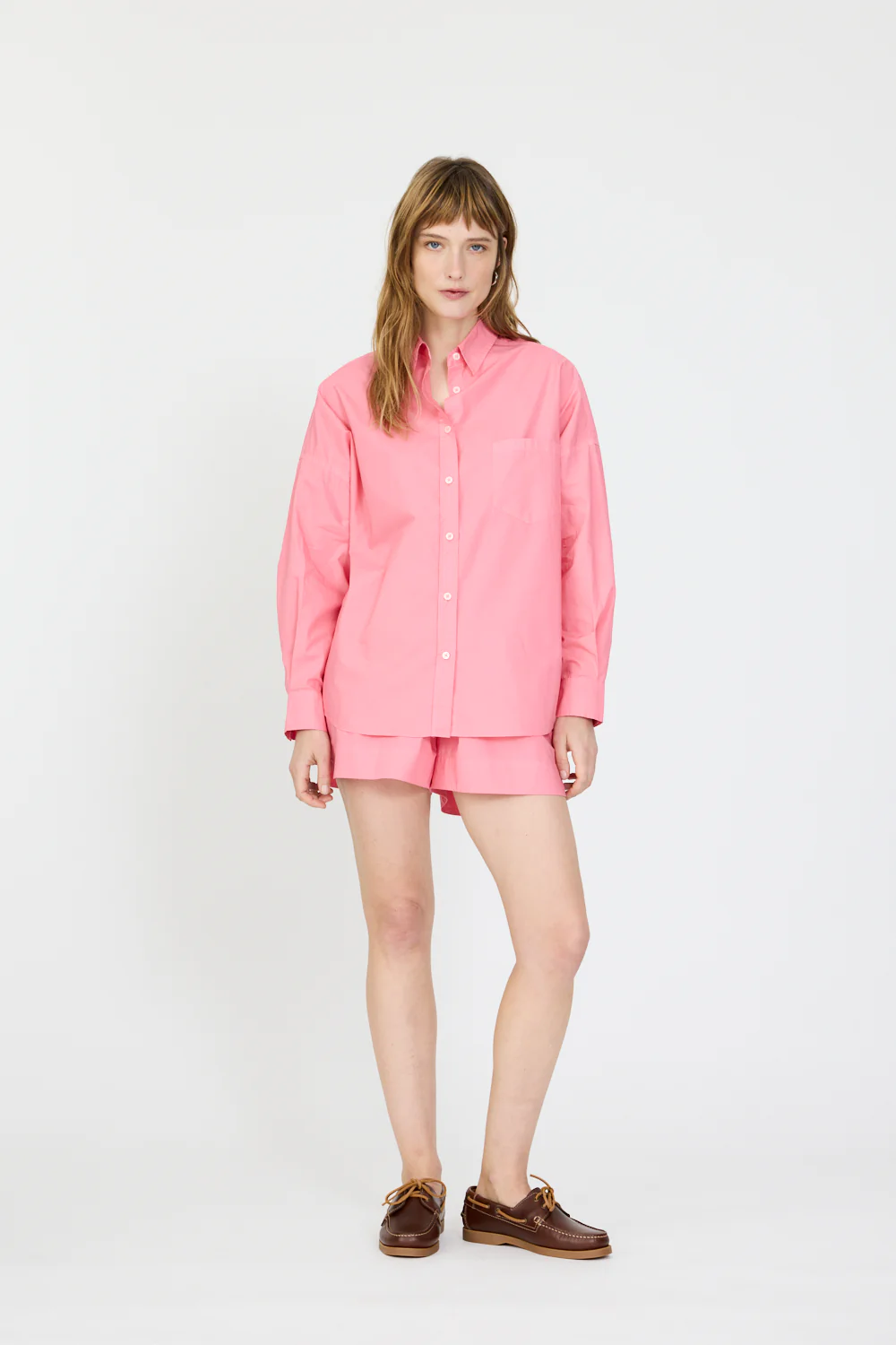 LMND's Signature Classic button-up shirt is a wardrobe staple. Made from 100% cotton, it has a chest pocket. Drop shoulders for the slightly loose silhouette is perfect for layering under knitwear or with the matching Chiara shorts.
