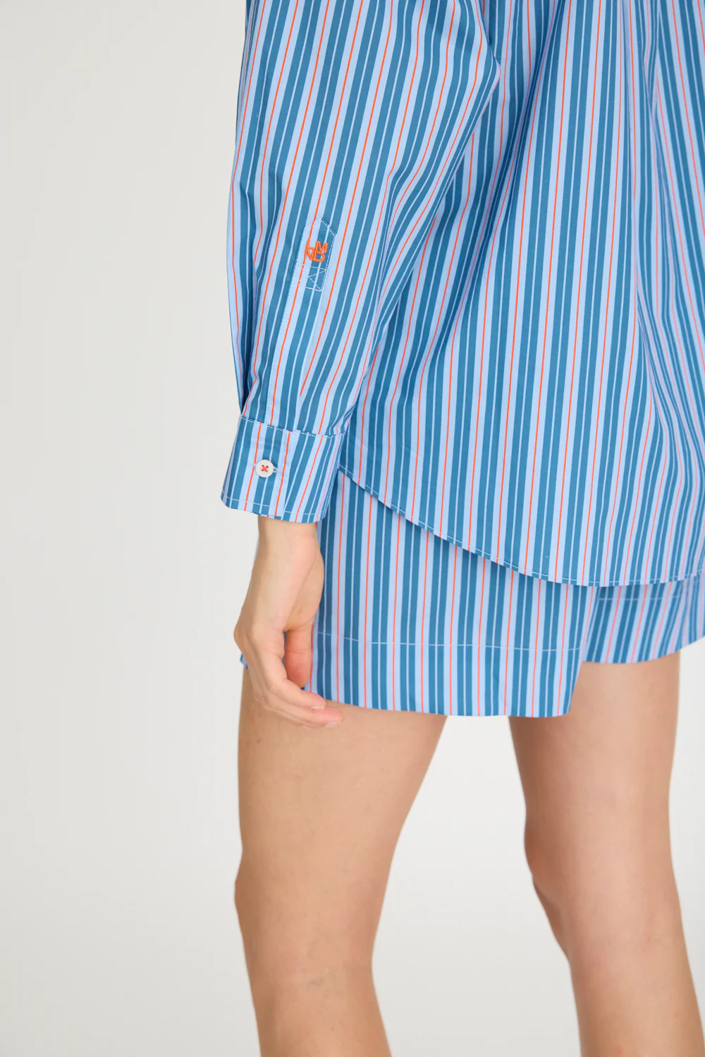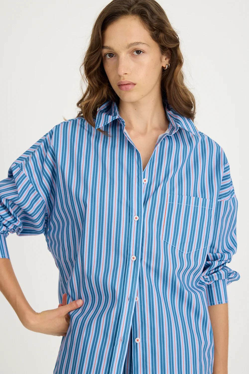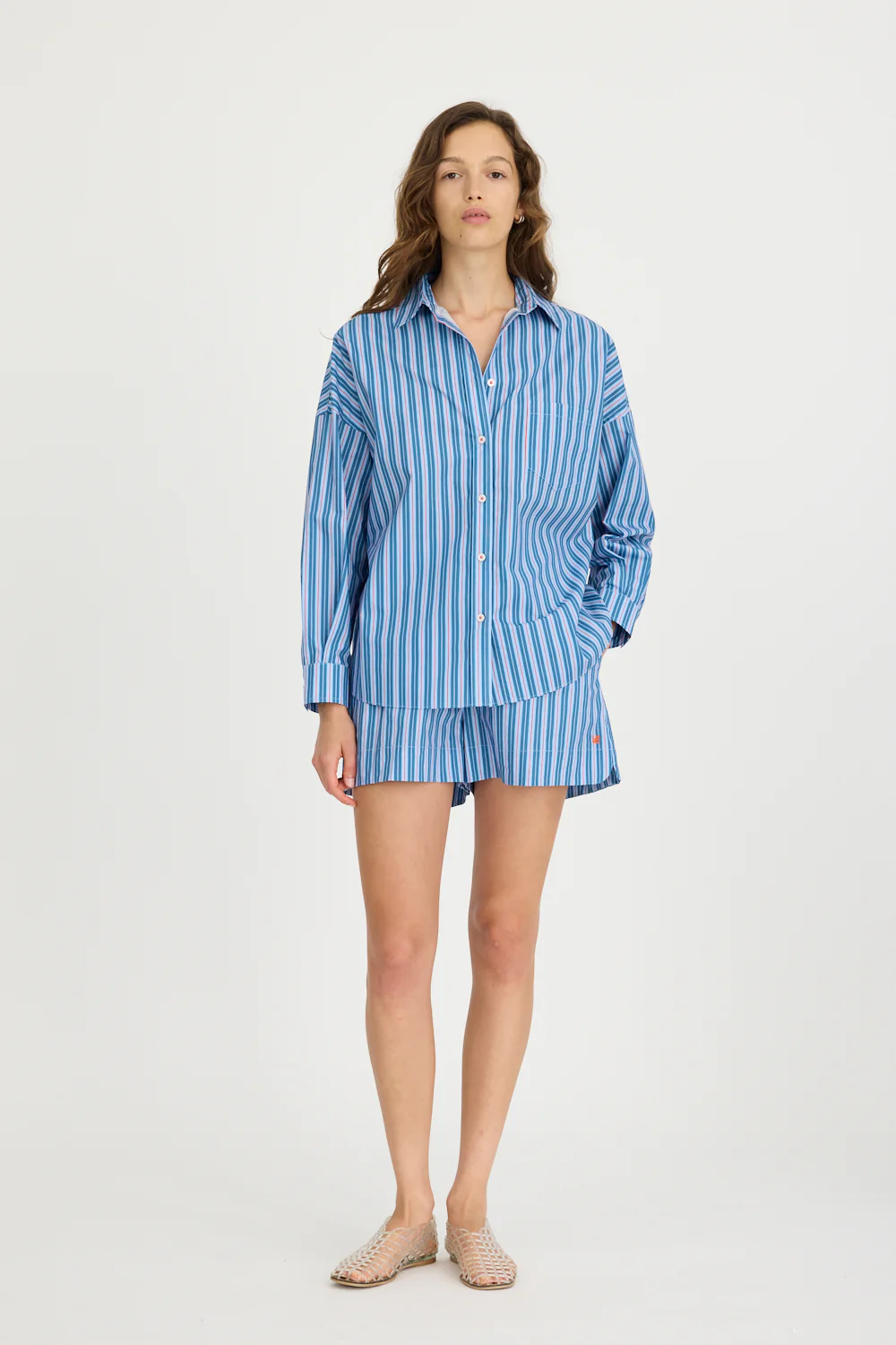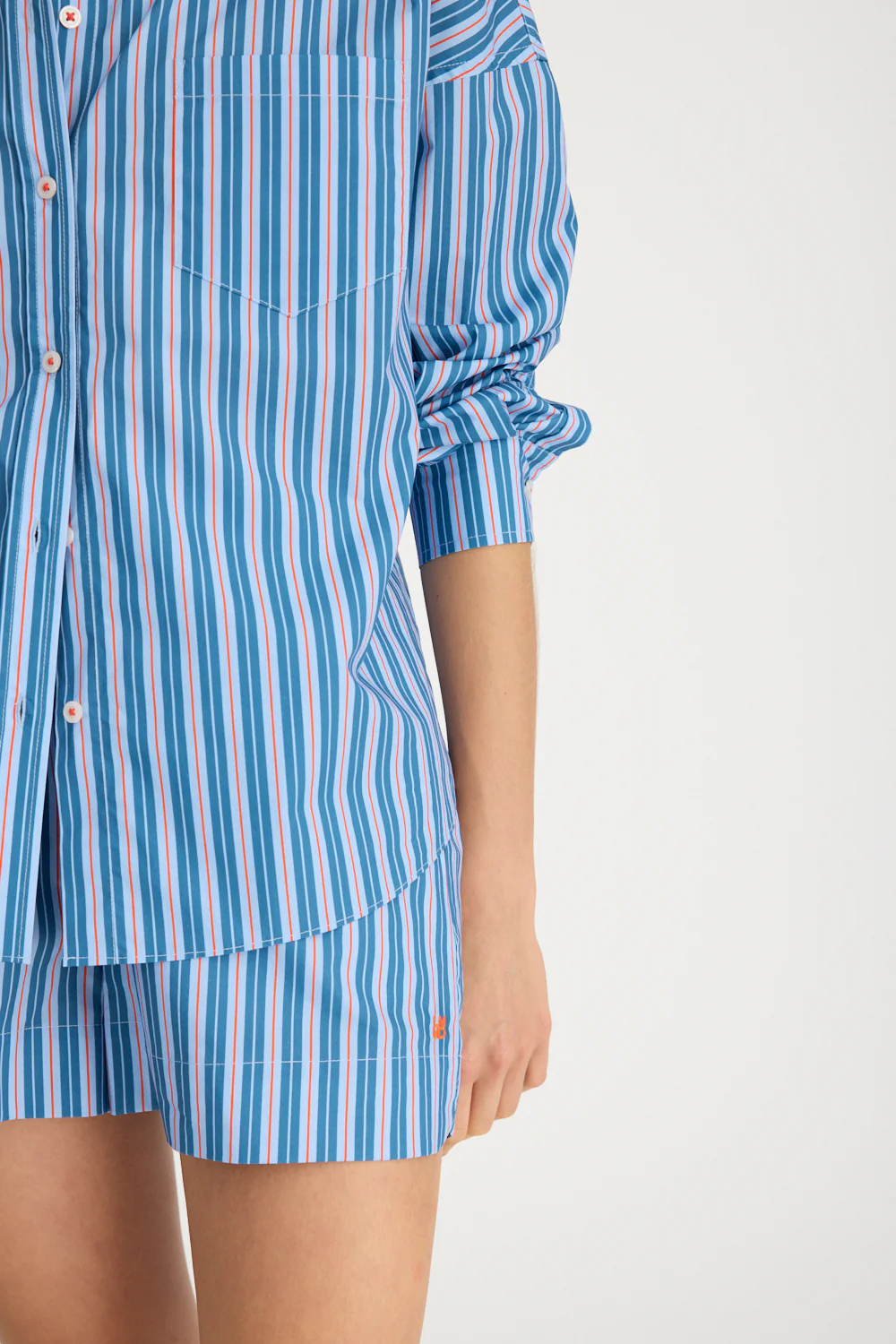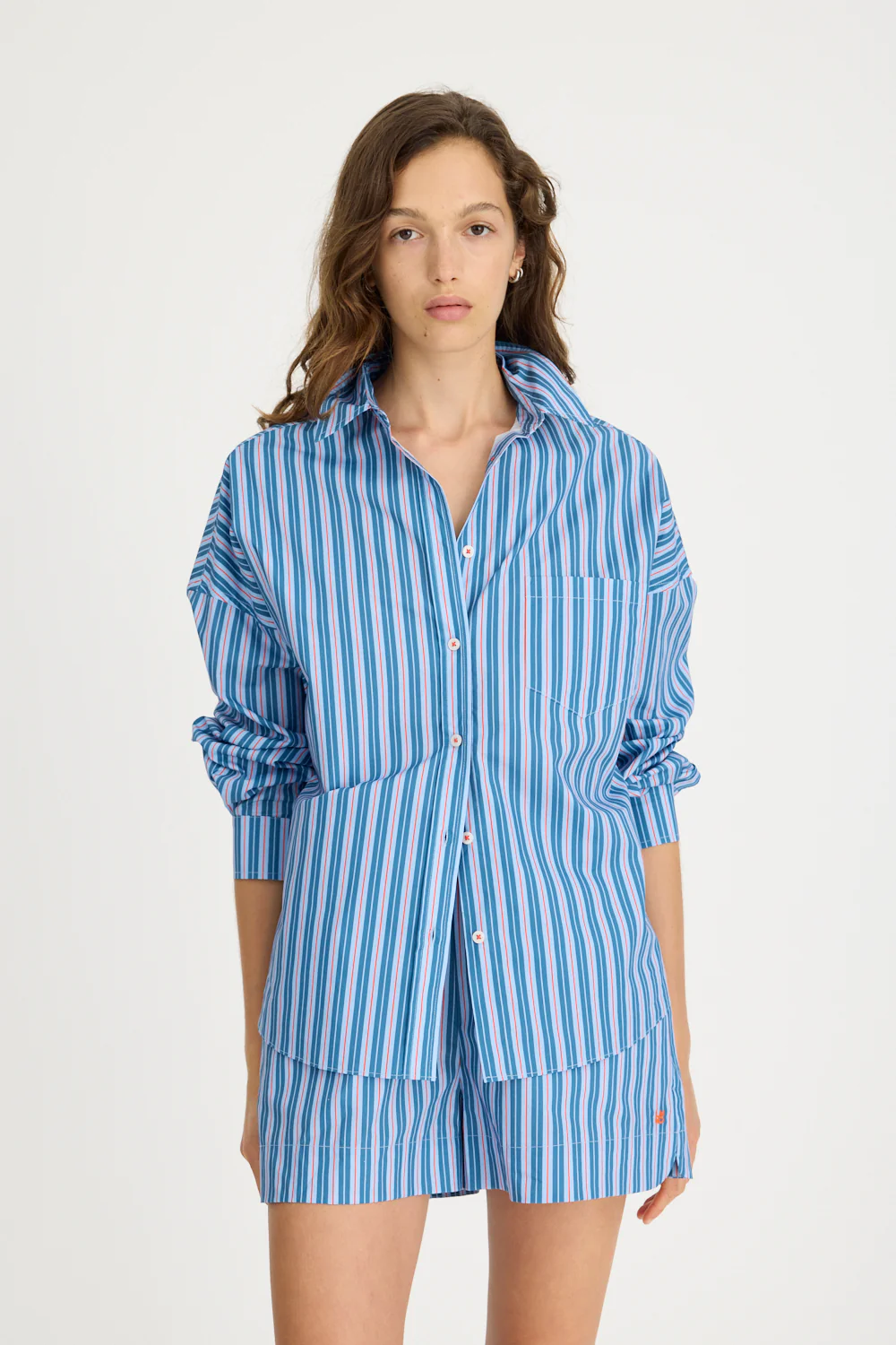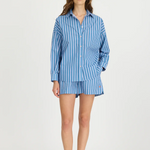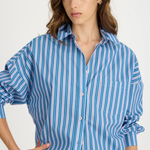 Introducing our Signature Classic Button-Up Shirt, featuring a stripe detail. Expertly crafted from 100% yarn-dyed cotton, this shirt effortlessly combines style and comfort. The design includes a practical chest pocket and our signature drop shoulders, creating a slightly loose silhouette perfect for layering under cozy knitwear or pairing with your favourite Chiara shorts.