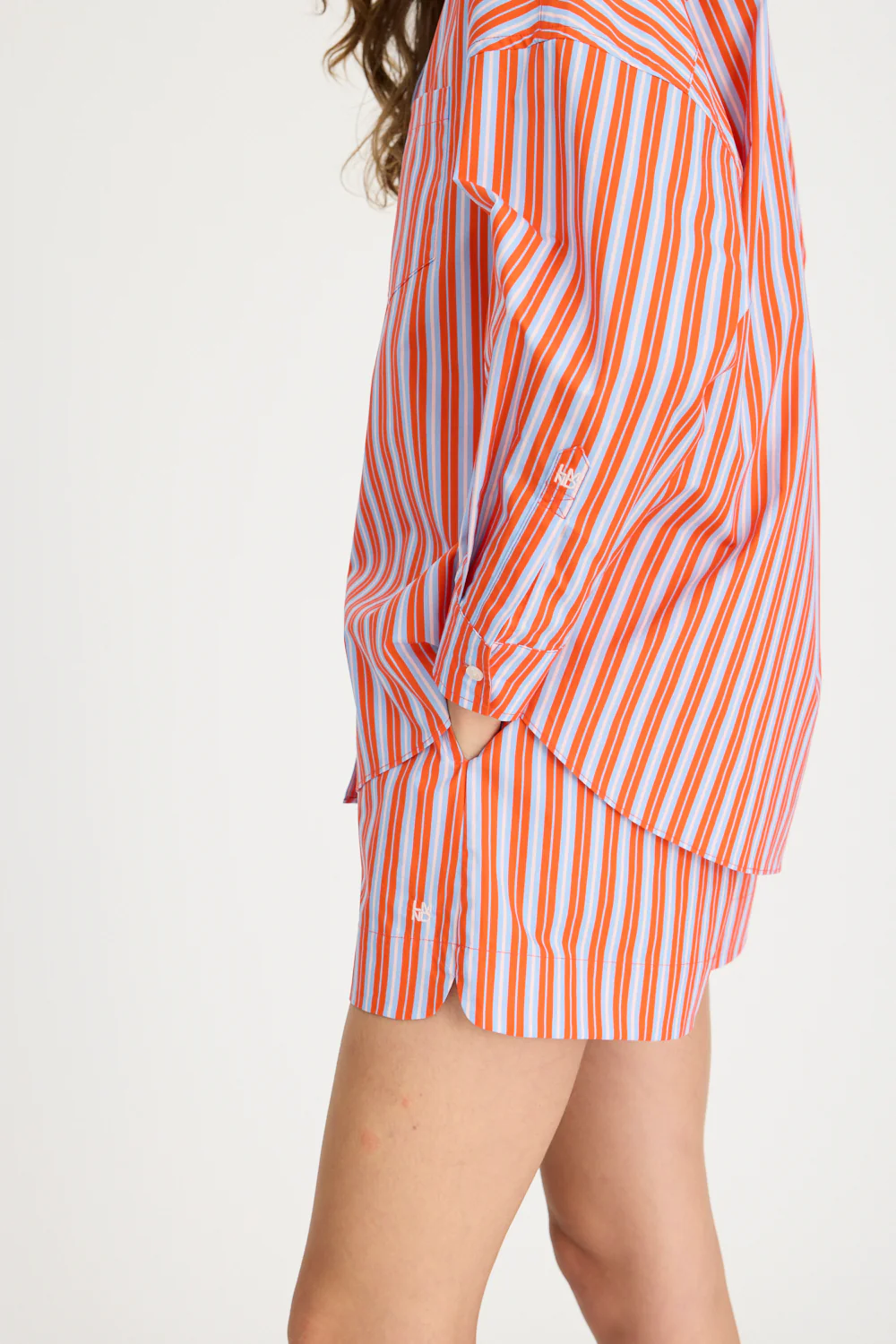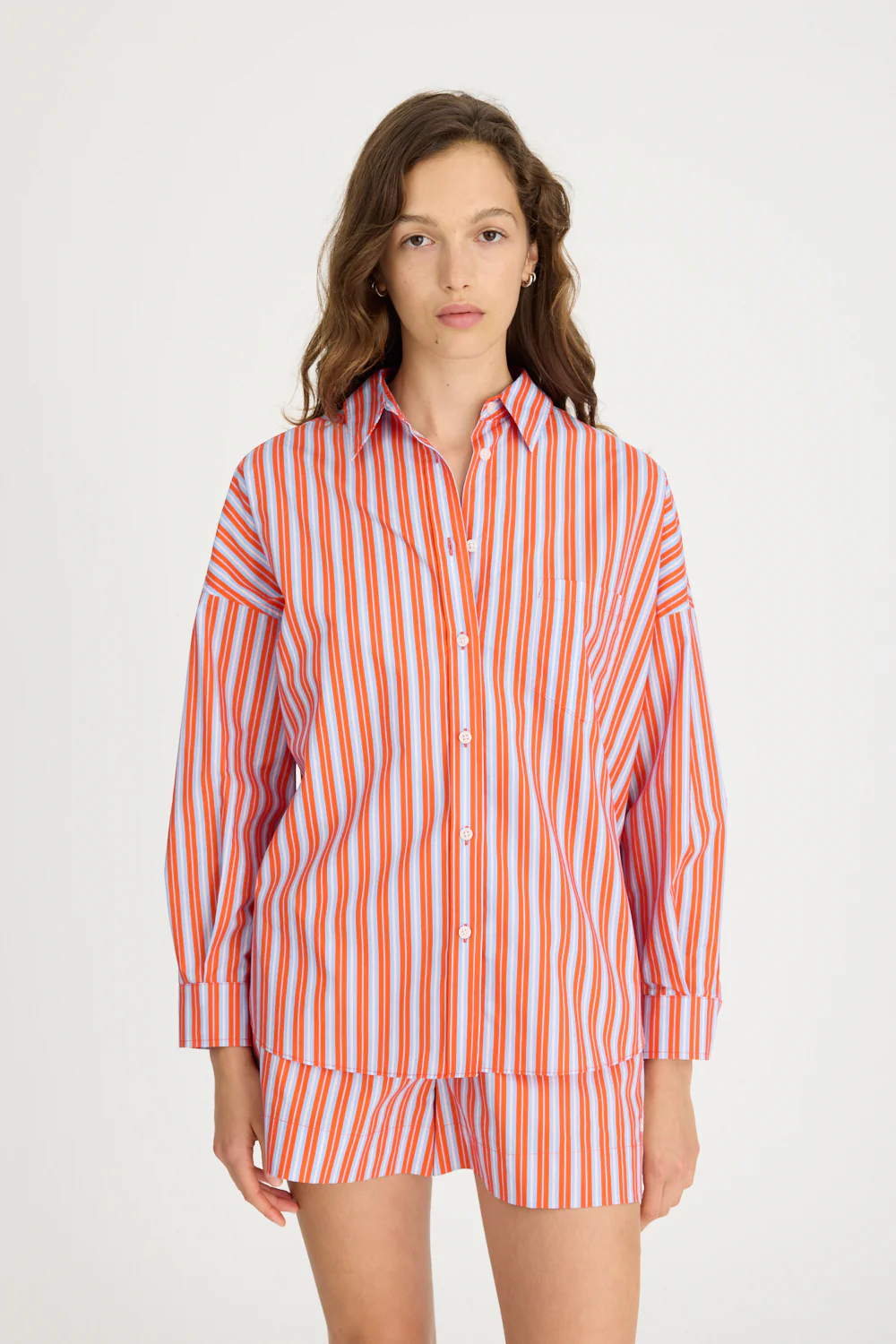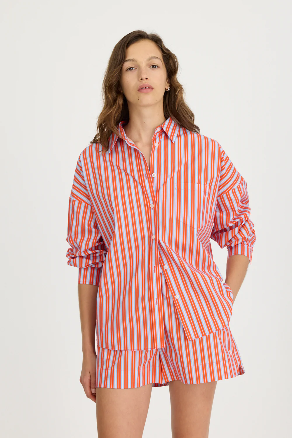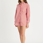 Introducing our Signature Classic Button-Up Shirt, featuring a stripe detail. Expertly crafted from 100% yarn-dyed cotton, this shirt effortlessly combines style and comfort. The design includes a practical chest pocket and our signature drop shoulders, creating a slightly loose silhouette perfect for layering under cozy knitwear or pairing with your favourite Chiara shorts.