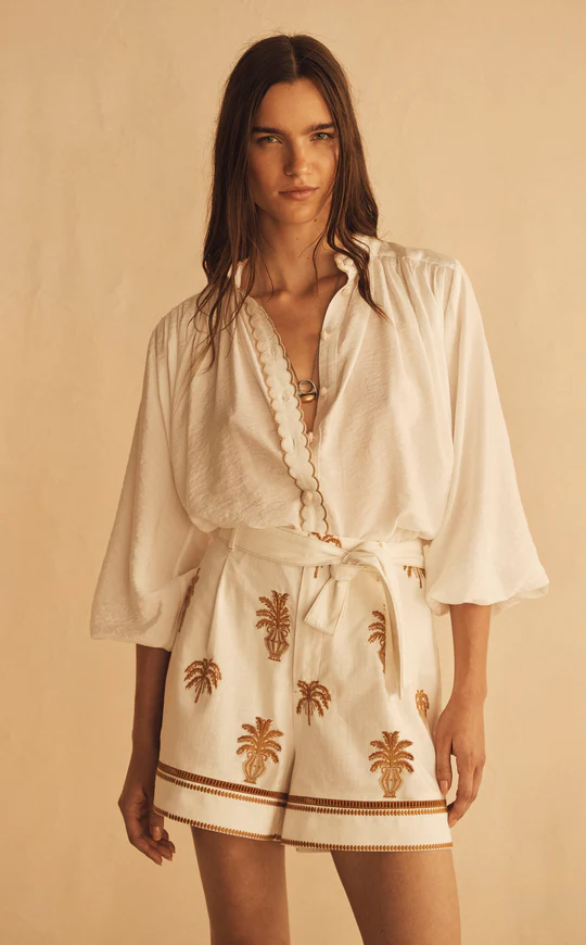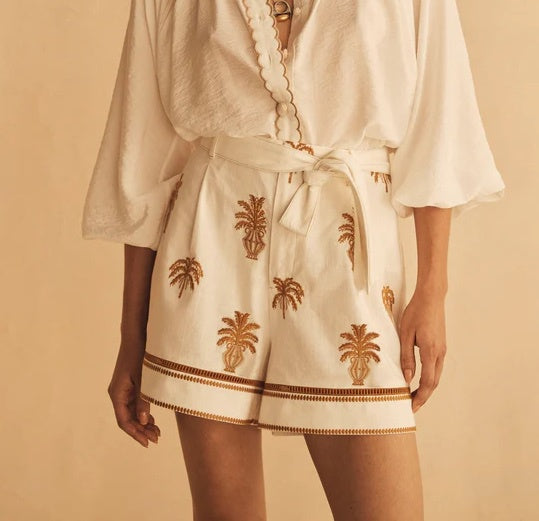 Effortlessly chic, the Resort Short is cut in a relaxed belted silhouette. Embroidered palm-tree inspired motifs and trim add an artisanal touch. The Resort Short features pleat detail, front zip opening and bordered hem with ladder trim accents. Style with matching Cuffed Short Sleeve Shirt or wear over this season’s favourite swim.