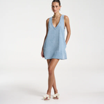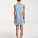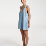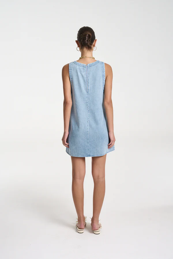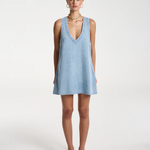 The Denim V-Neck Shift dress presents a relaxed fit that ends at a flattering mini length. Made from soft washed cotton denim, it boast front pockets and can be styled alone or layered with a shirt underneath for an elevated look.