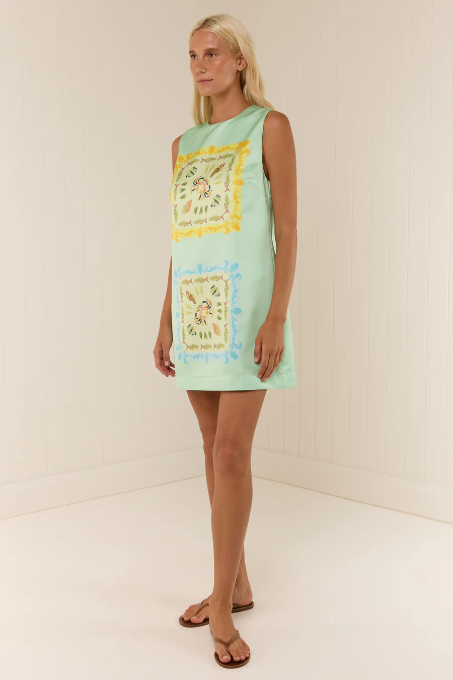 The Ella Mini Dress in Palm Noosa's exclusive Saya Shells is a mini silhouette, crafted in a premium heavyweight Satin. Offering a straight silhouette, the Ella Mini dress is a shift shape with a rounded neckline and a luxurious sheen perfect for dressing up or down.