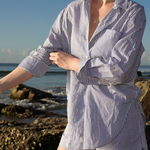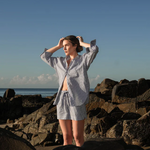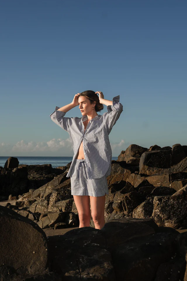 The Harvey Short in Neelam Stripe features an elasticised waist with contrasting tie detail and curved wide stitched hem detail.