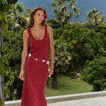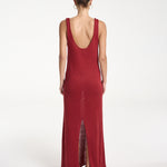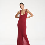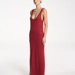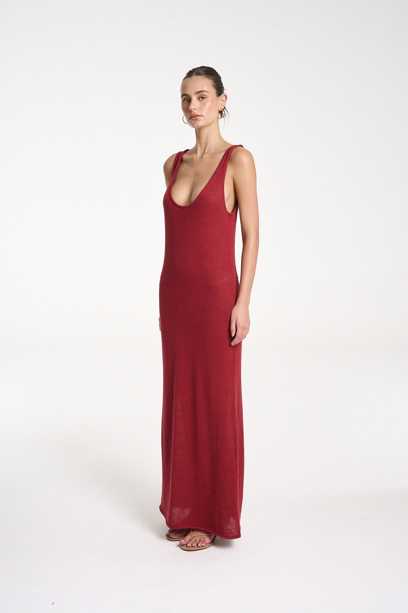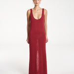 The Knit Maxi Dress in classic carmine red has been crafted from a linen/cotton blend with a scoop neckline and relaxed silhouette that falls all the way to the ankles.
