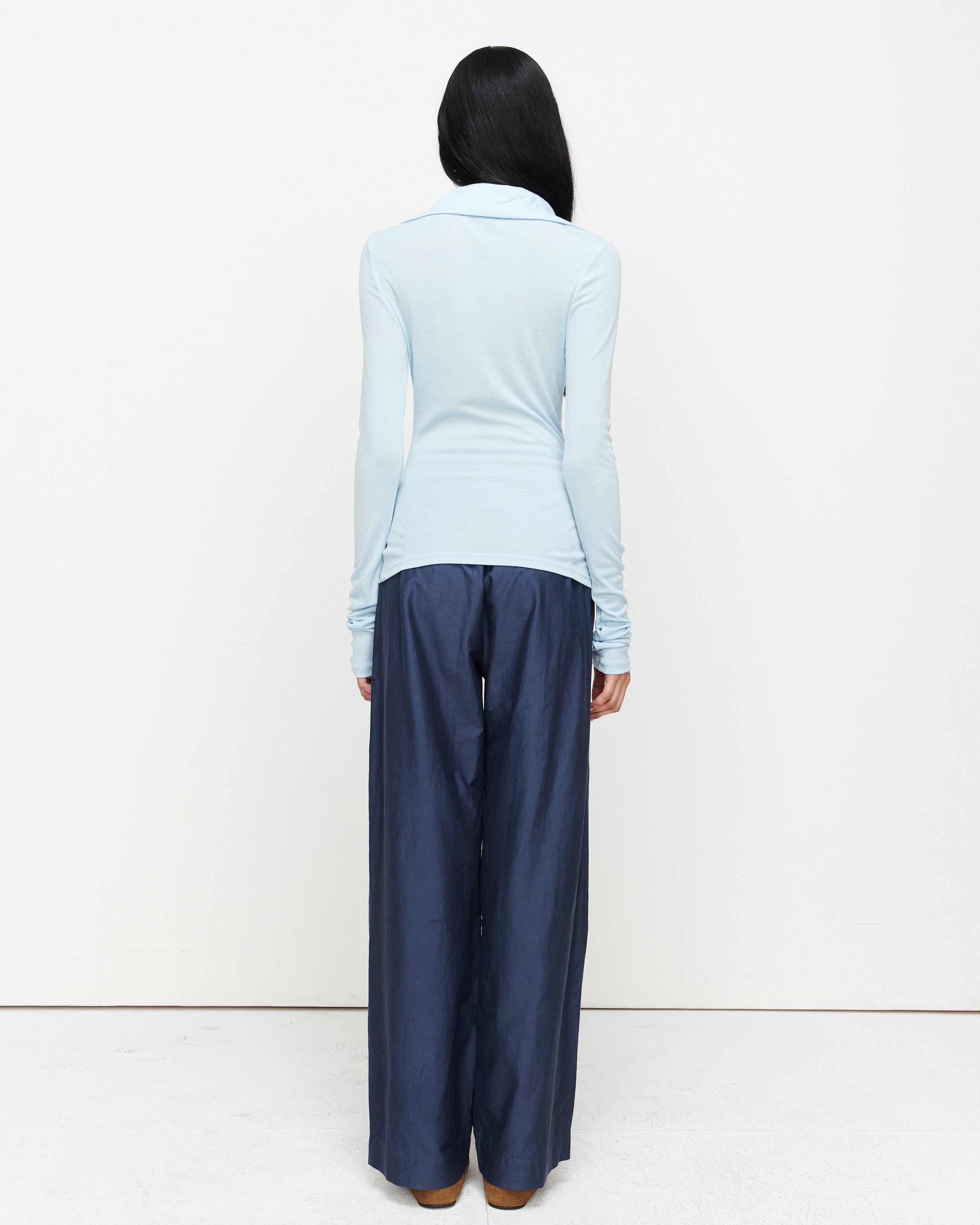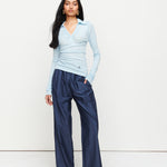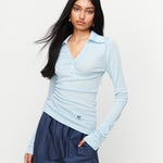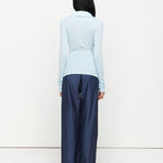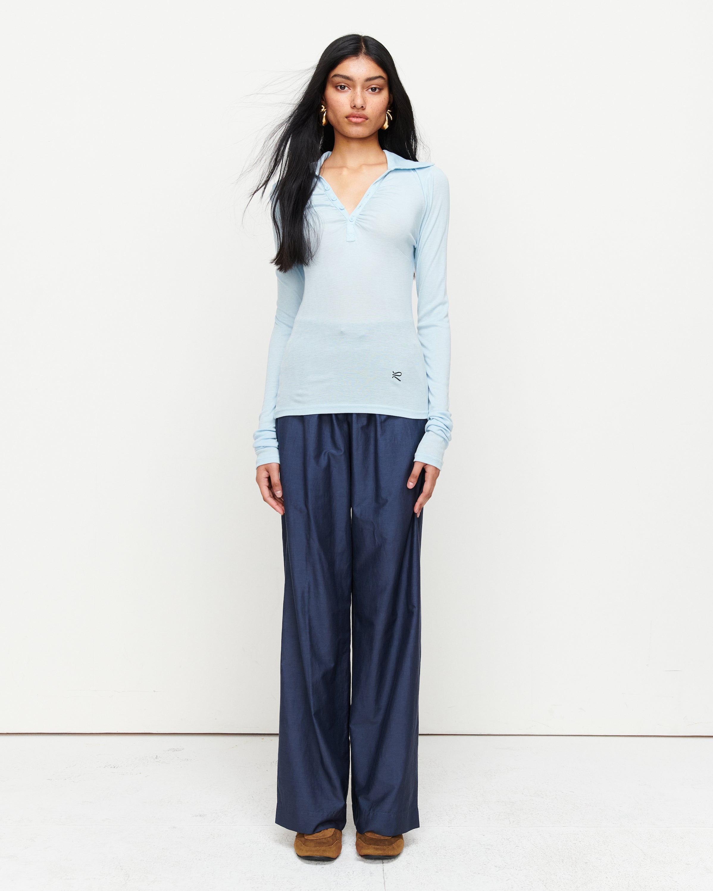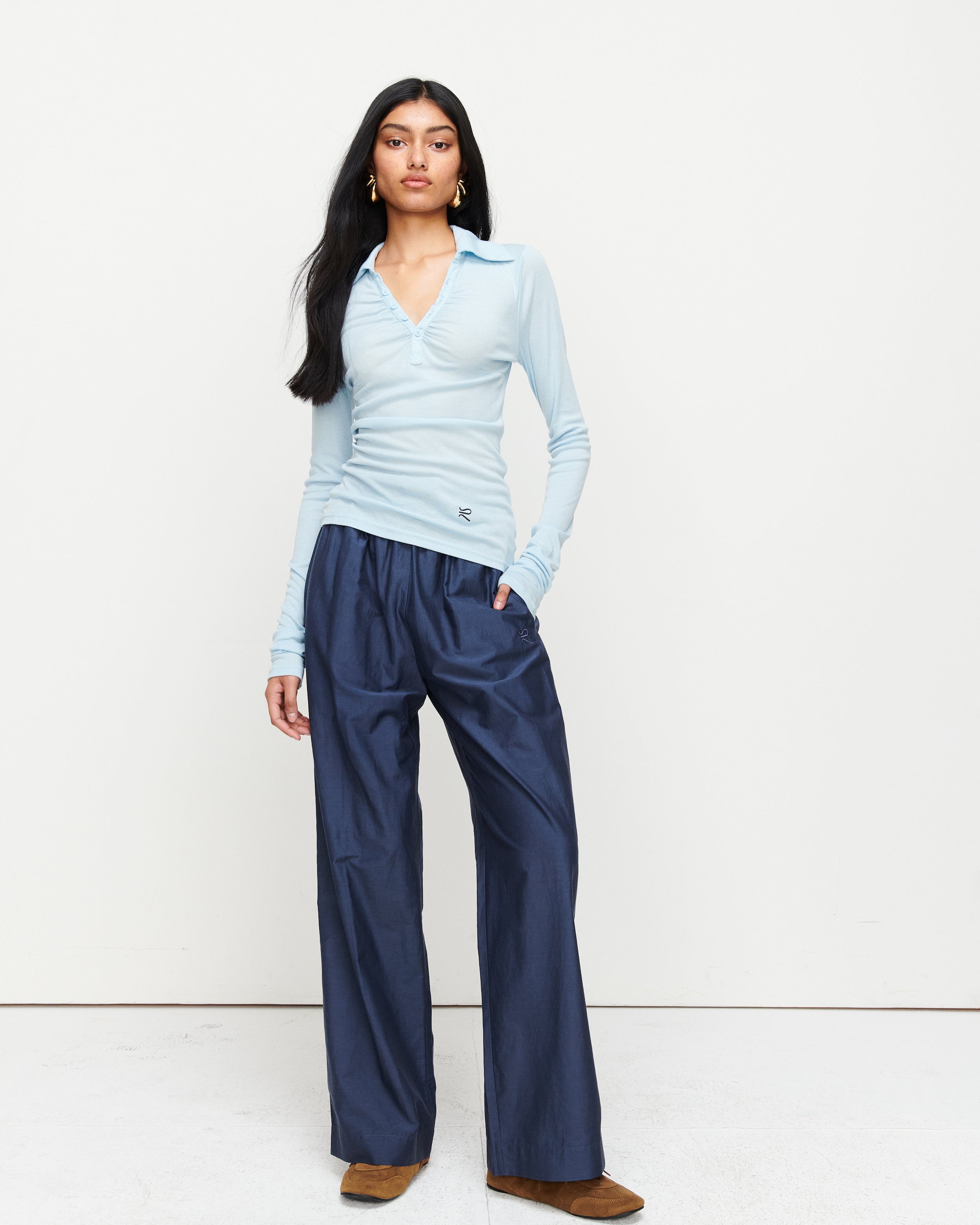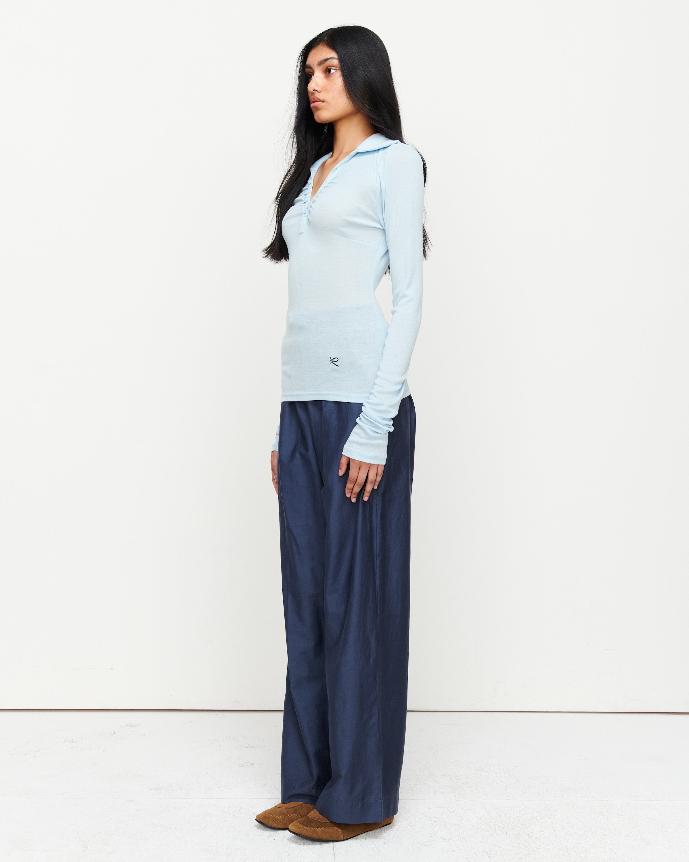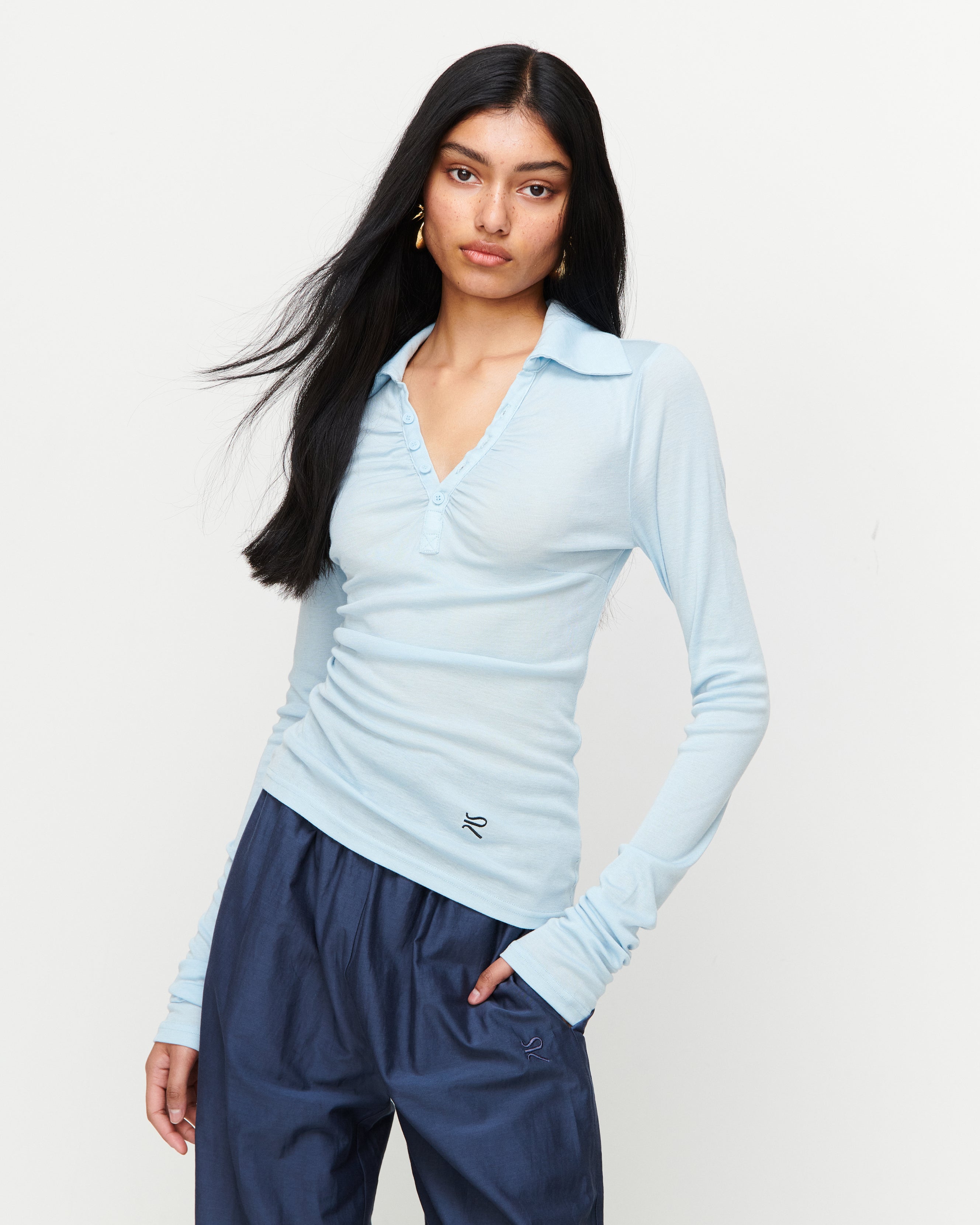 A collared Henley-style top with soft gathers over the bust and elongated sleeves for effortless layering under blazers. Finished with ROMY's signature ‘R’ embroidery.