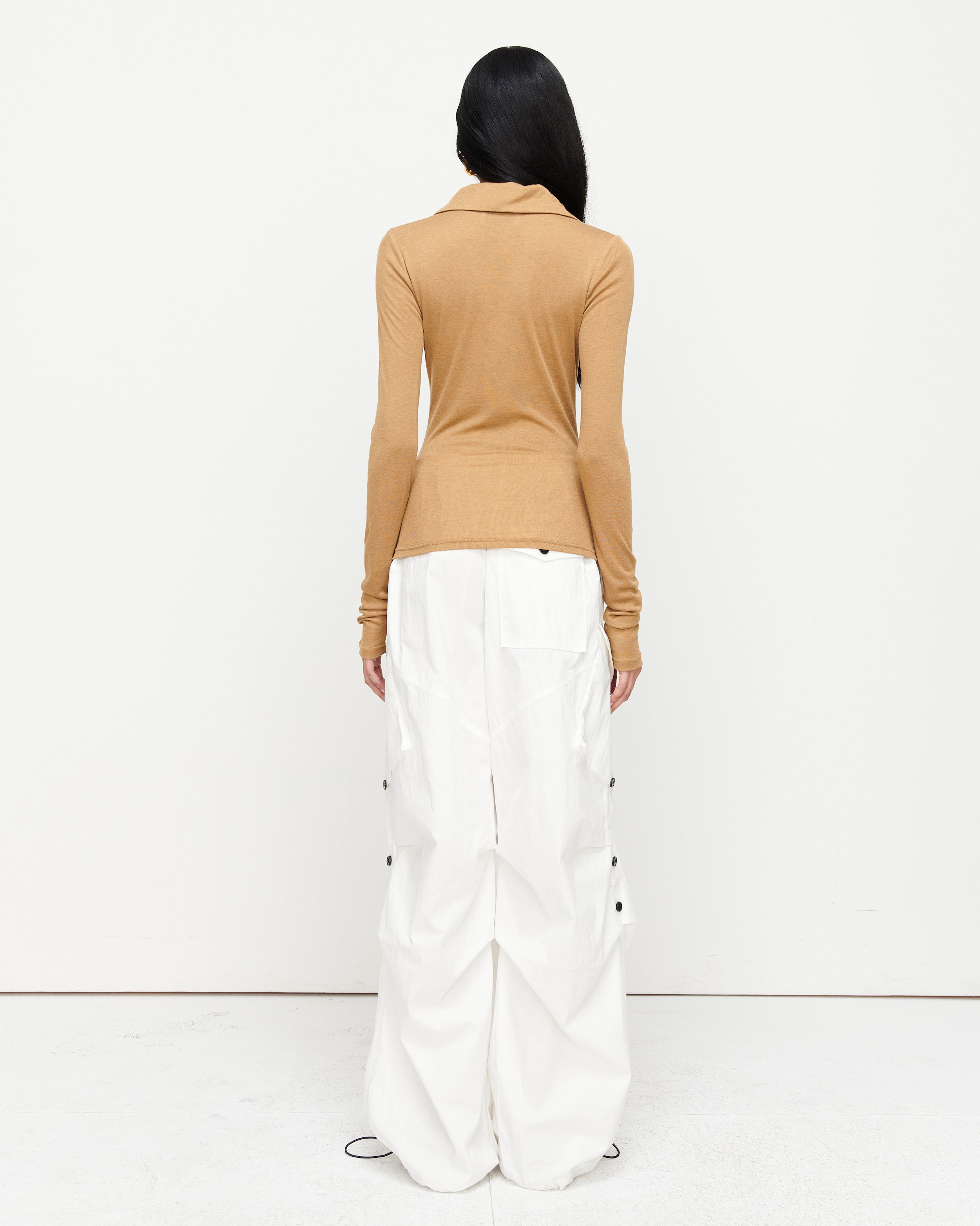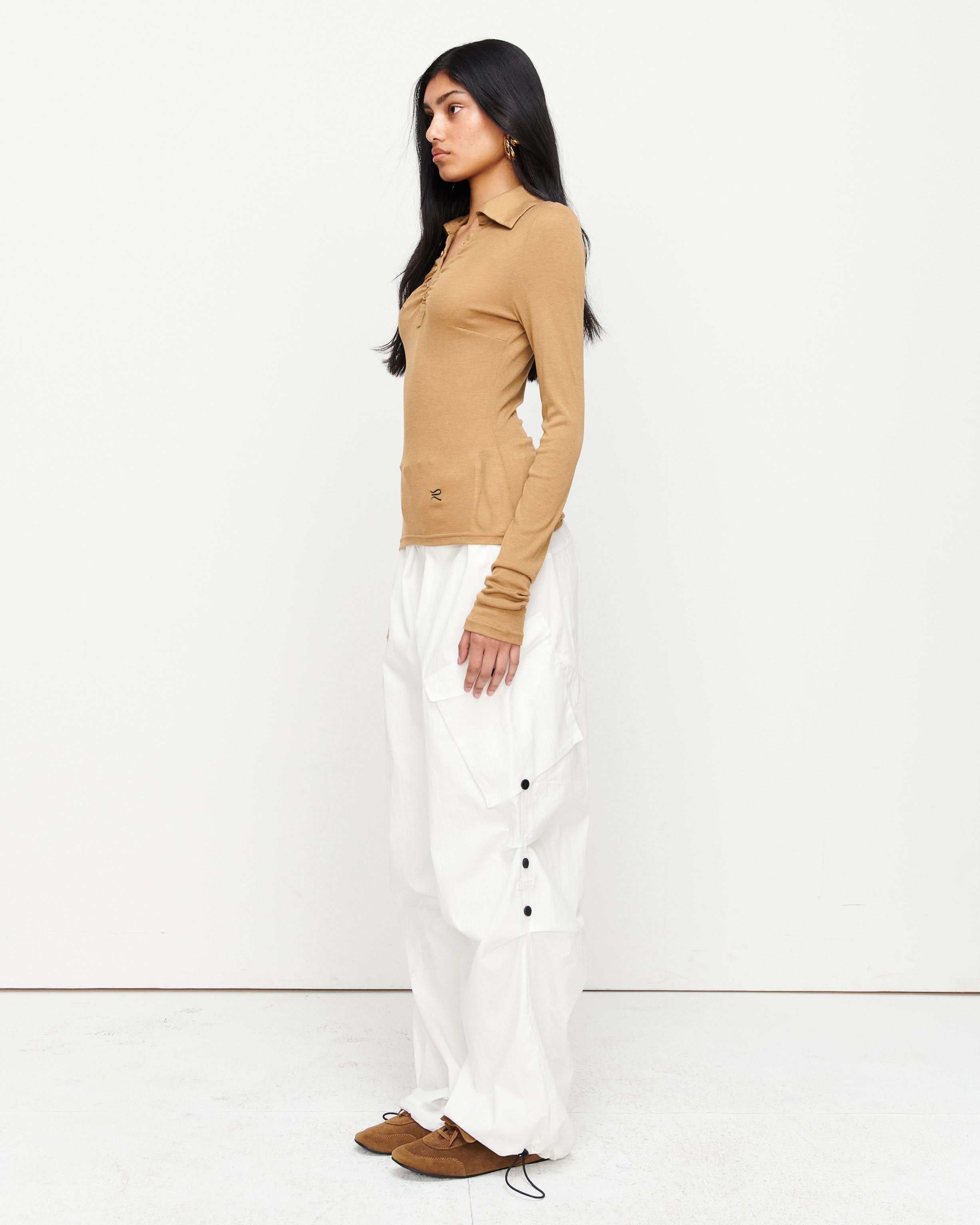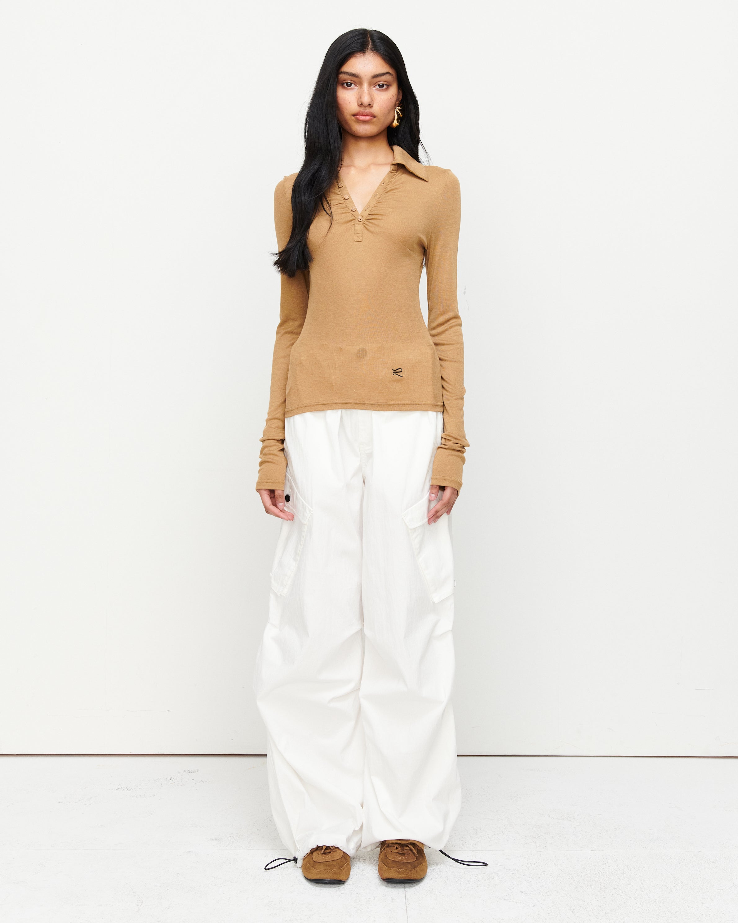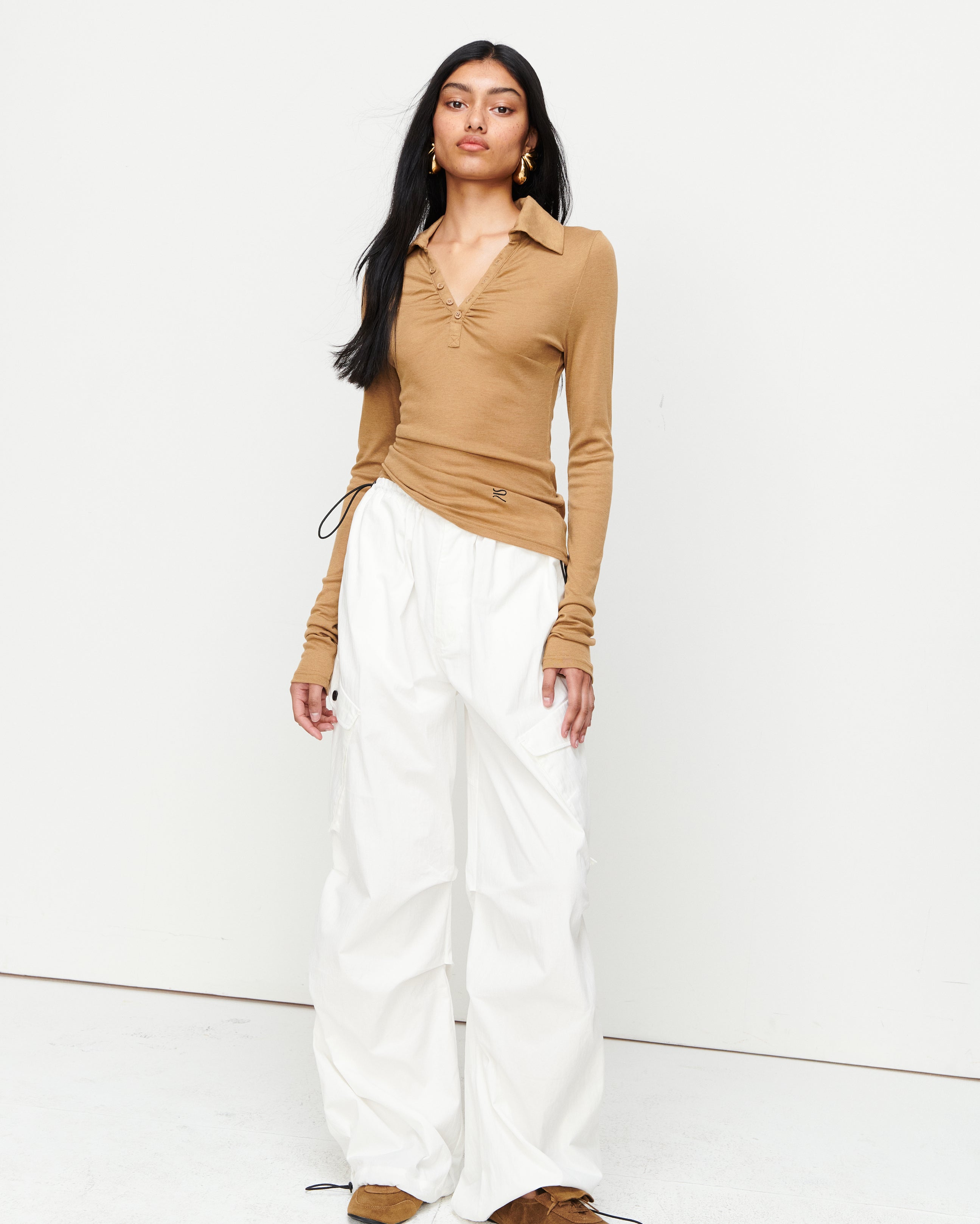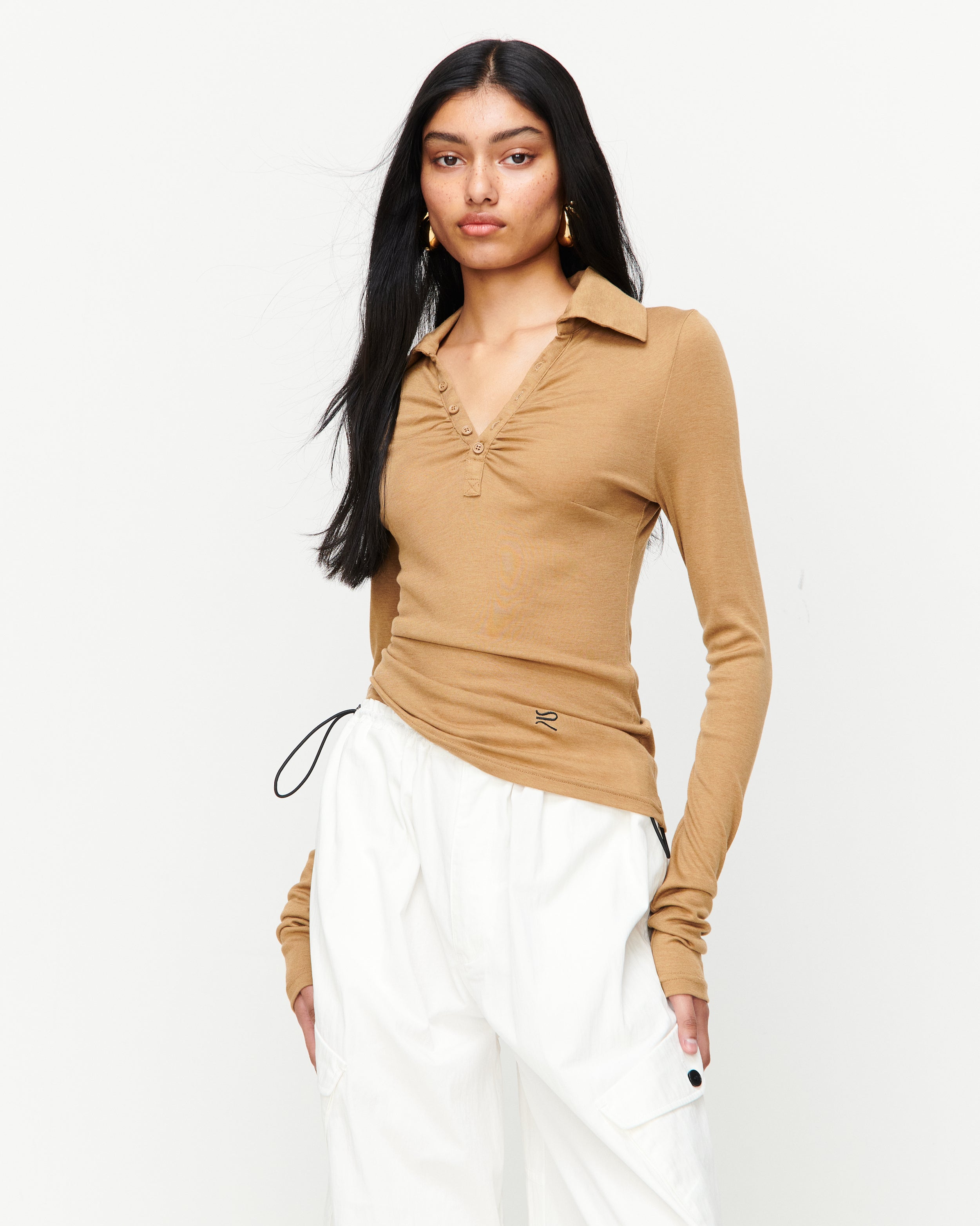 A collared Henley-style top with soft gathers over the bust and elongated sleeves for effortless layering under blazers. Finished with ROMY's signature ‘R’ embroidery.