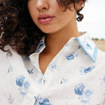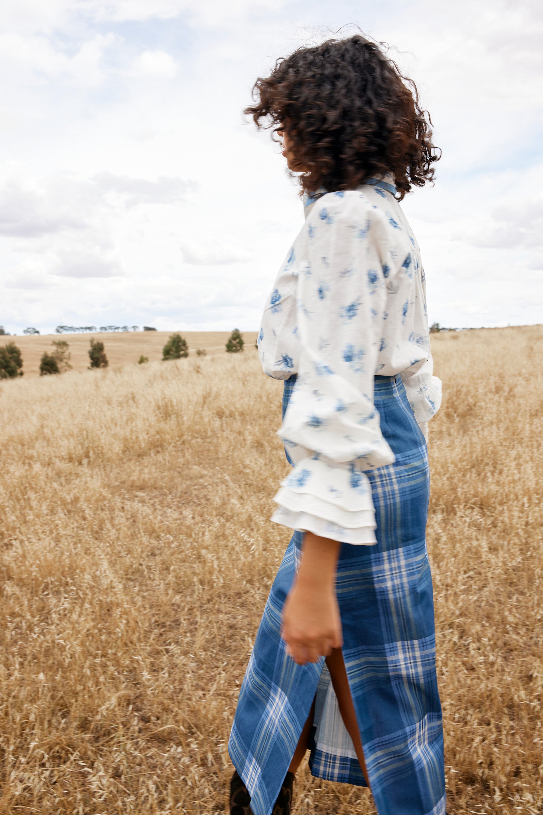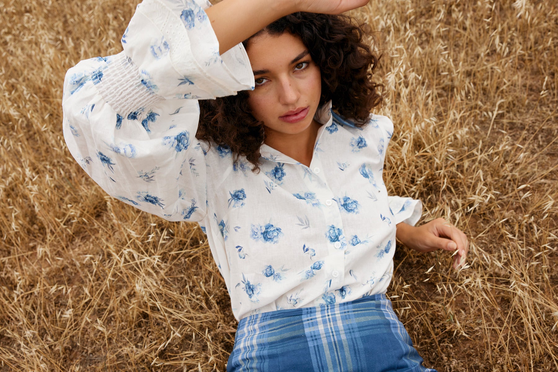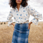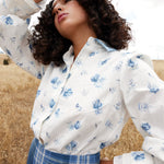 This delicate floral blouse brings a touch of romance to any look. Crafted from lightweight fabric, it features a soft white base adorned with charming blue floral prints. The structured collar and button-down front add classic sophistication, while the voluminous sleeves with layered cuffs create a statement finish.