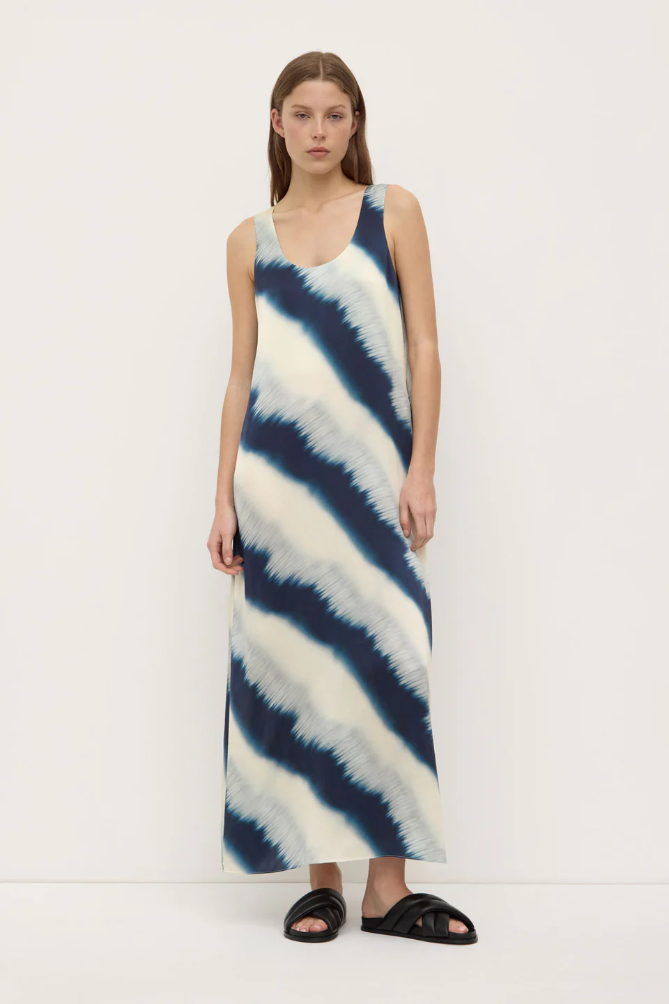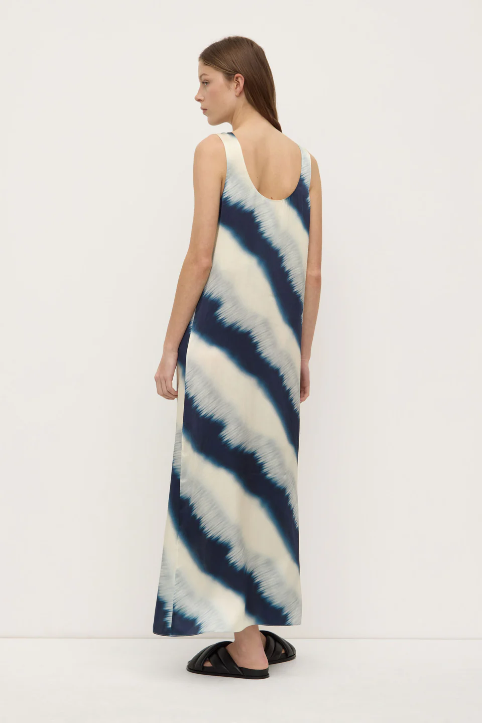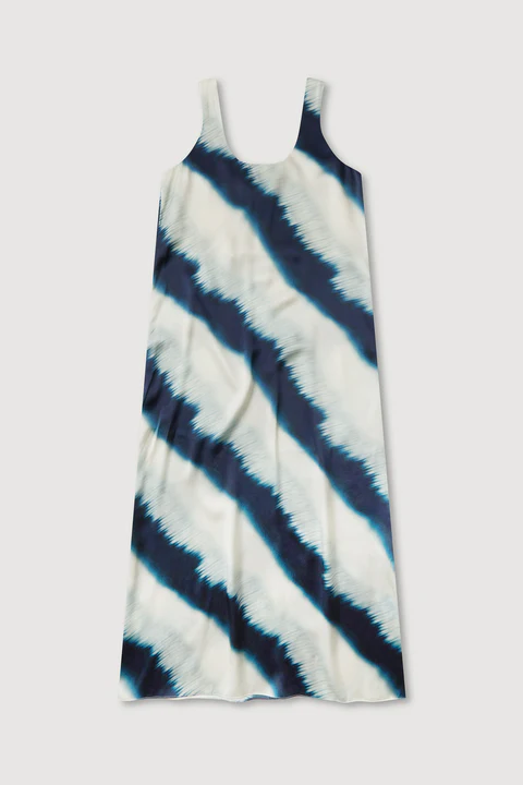 Crafted from a premium satin silk, this maxi dress features a statement tie dye print. Cut for a relaxed silhouette, it offers a gentle drape on the body.