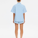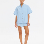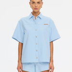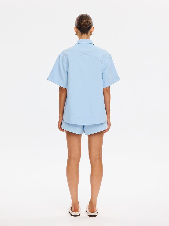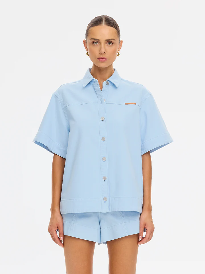 Our Signature Marla Denim Shirt in a sky blue colourway is a boxy, oversized top. Featuring a short sleeves, a button-through front complete with signature brass hardware, this top offers a considered contrast to its relaxed form. Laid-back in shape, elevated in detail the Marla is designed to be worn on repeat, solo or styled as a set.