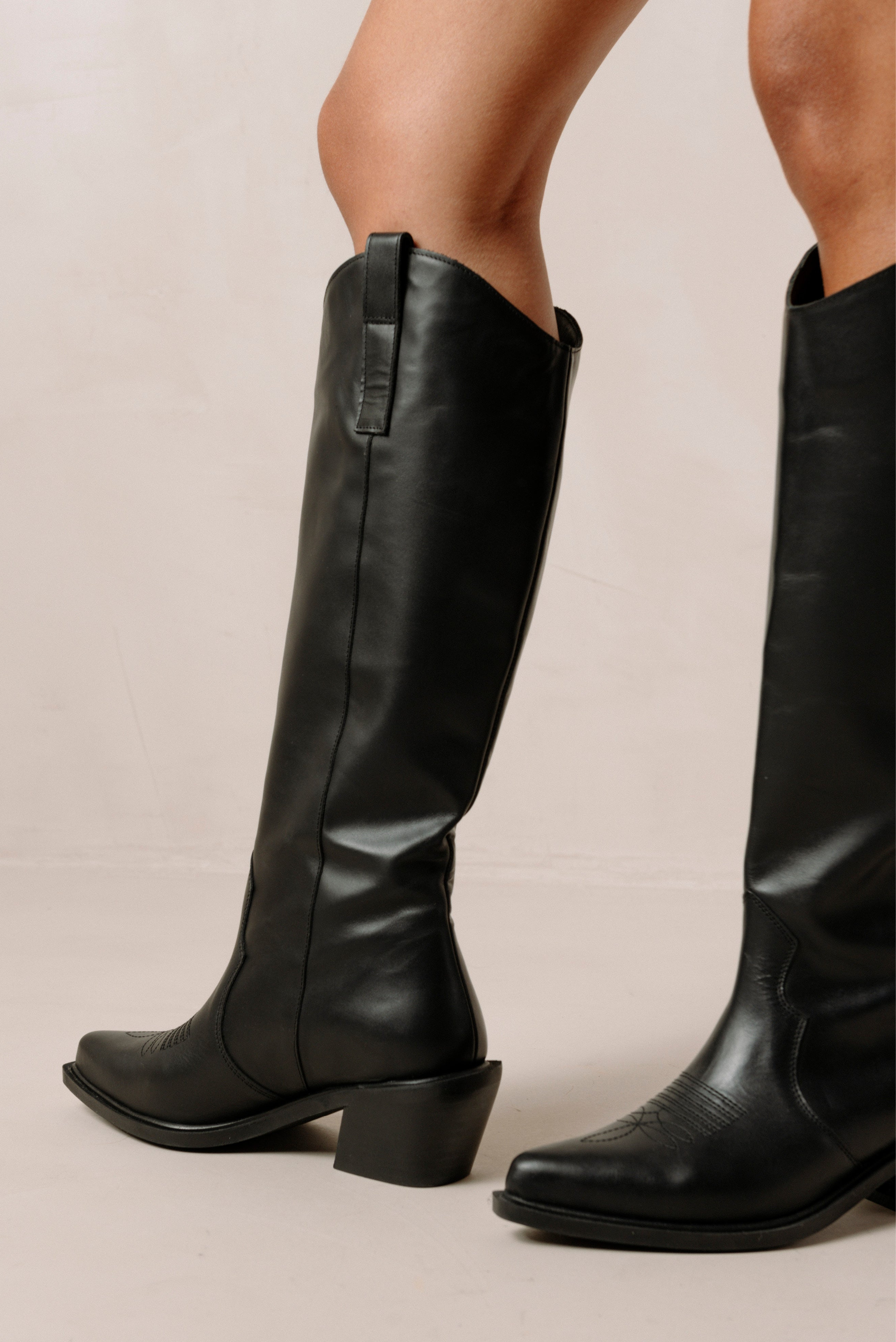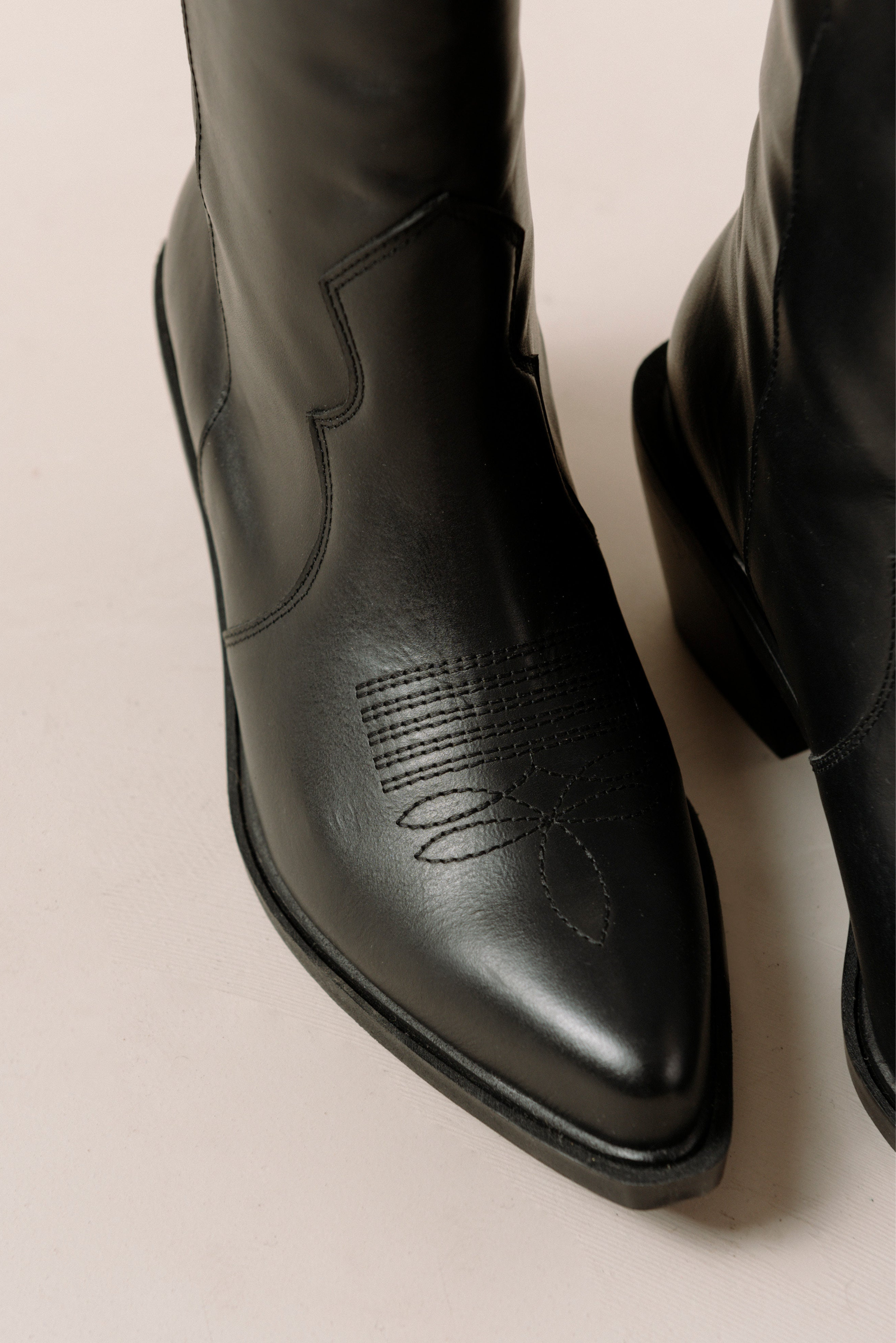 Giddy up, girls! Cowboy boots are back and they are not going anywhere. Inspired by the iconic Western style, this pair is crafted from black leather with subtle embroidery along the pointed toe and classic pull tabs. Swap out your sandals for a pair of these to ride fall season's biggest trend like a pro.