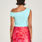 The Off Shoulder Tank in Aqua has been constructed from a stretchy cotton blend, featuring a ruched midsection for a flattering fit.