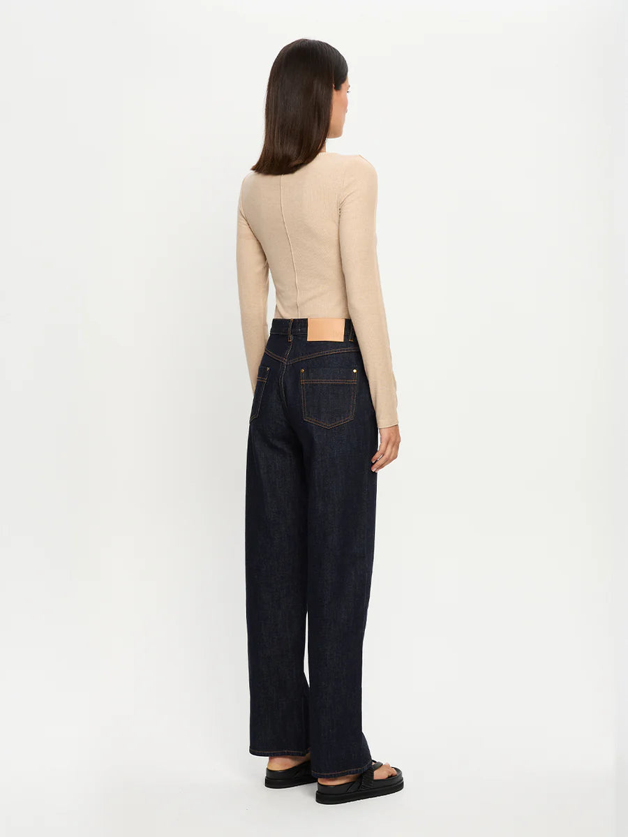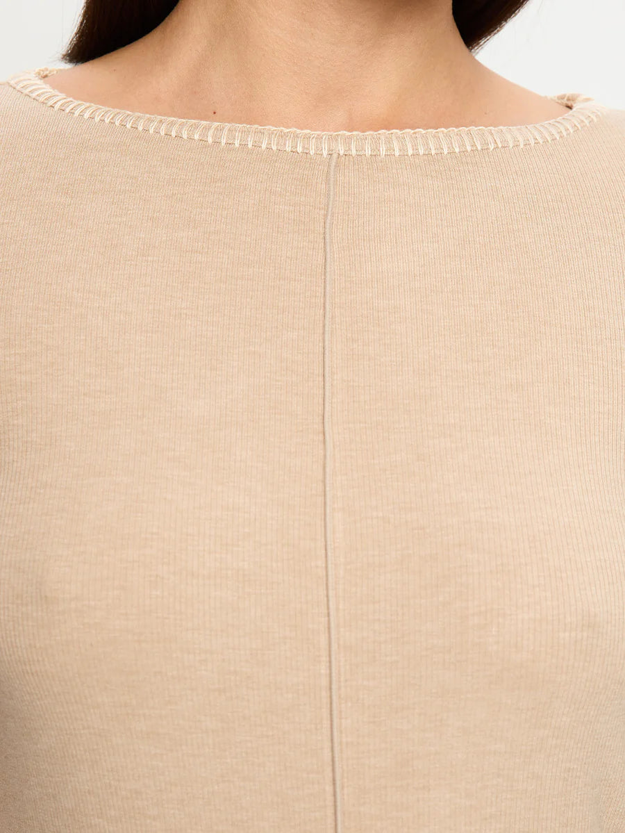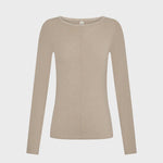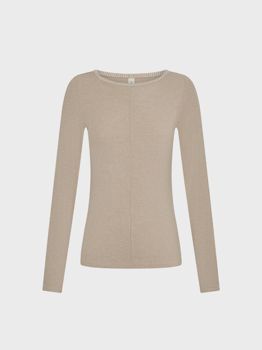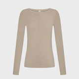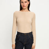 The Quinn Knit Top in taupe is a fitted silhouette featuring a boat neckline with blanket stitch detail, long sleeves and complete with pin tuck seam detail down centre front.