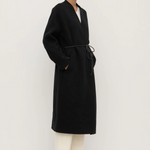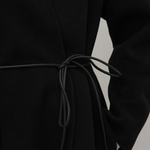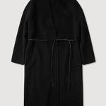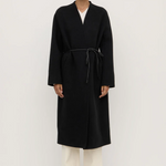 A modern outerwear staple. The Rhea Coat is a collarless coat style crafted from 100% wool, featuring concealed snap metal closures and a 100% leather cord belt for versatile styling.