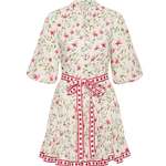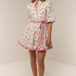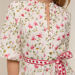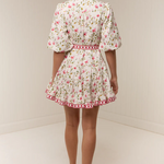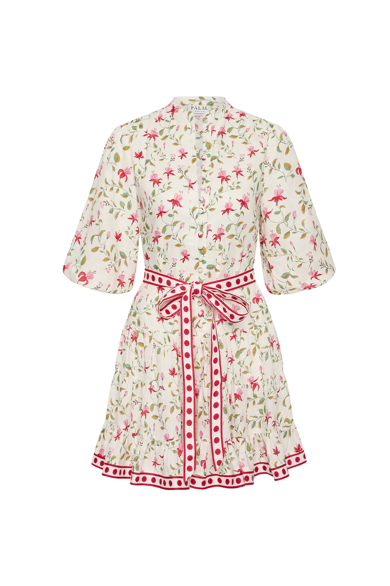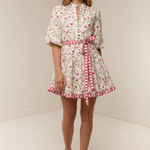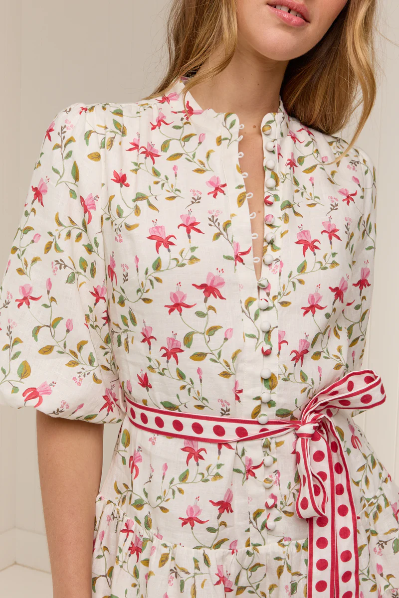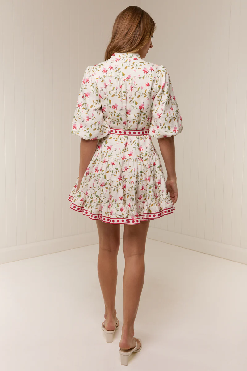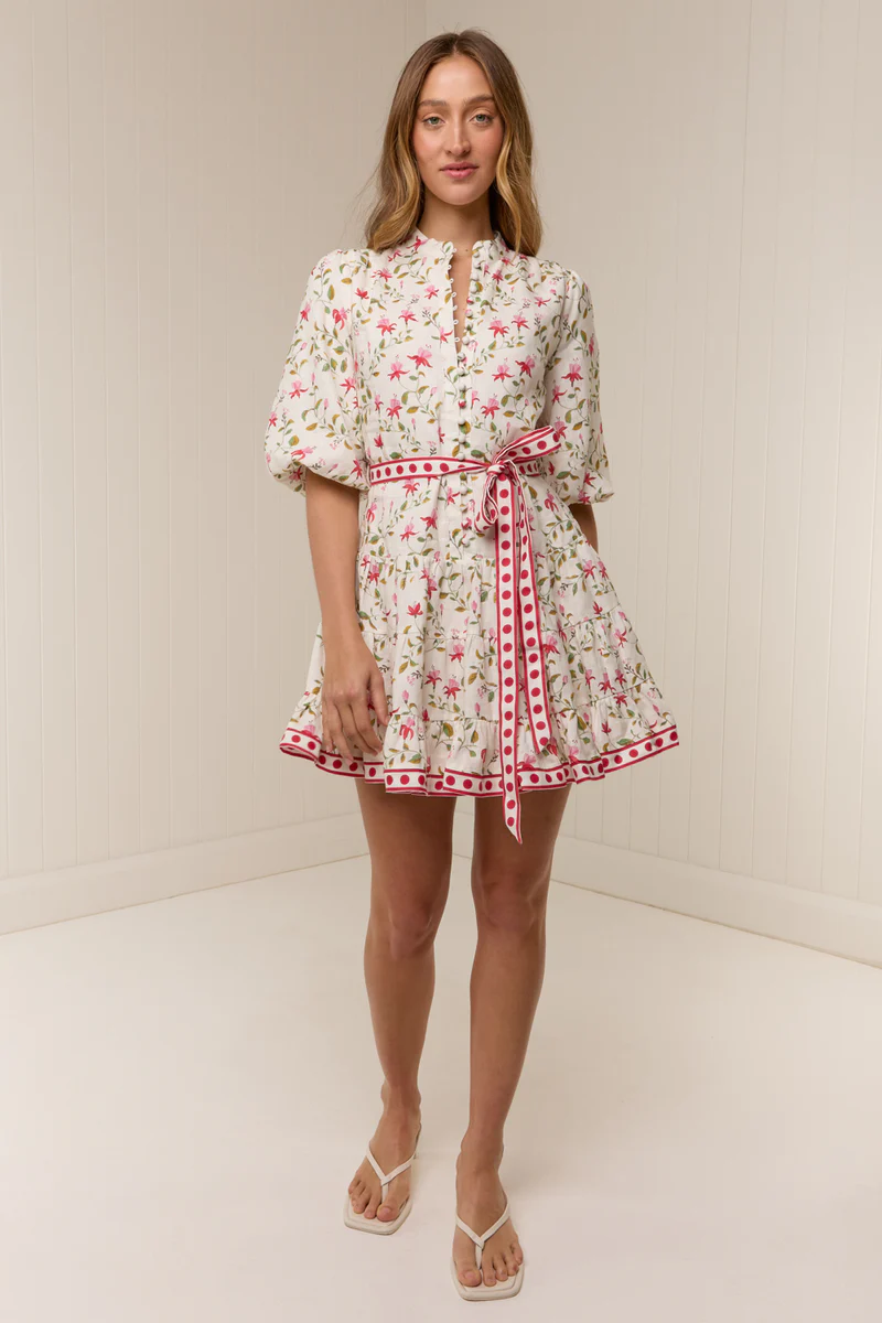 The Ruba Mini Dress in our exclusive Pink Petals print is crafted in a premium Linen. Designed to be fitted across the shoulders, then loosely sit off the body through the bust and waist, the Ruba Mini Dress features a centre front functional button detailing, blouson half sleeve, drop waist tiered mini skirt and a sash belt to cinch the waist for an elevated feminine fit.