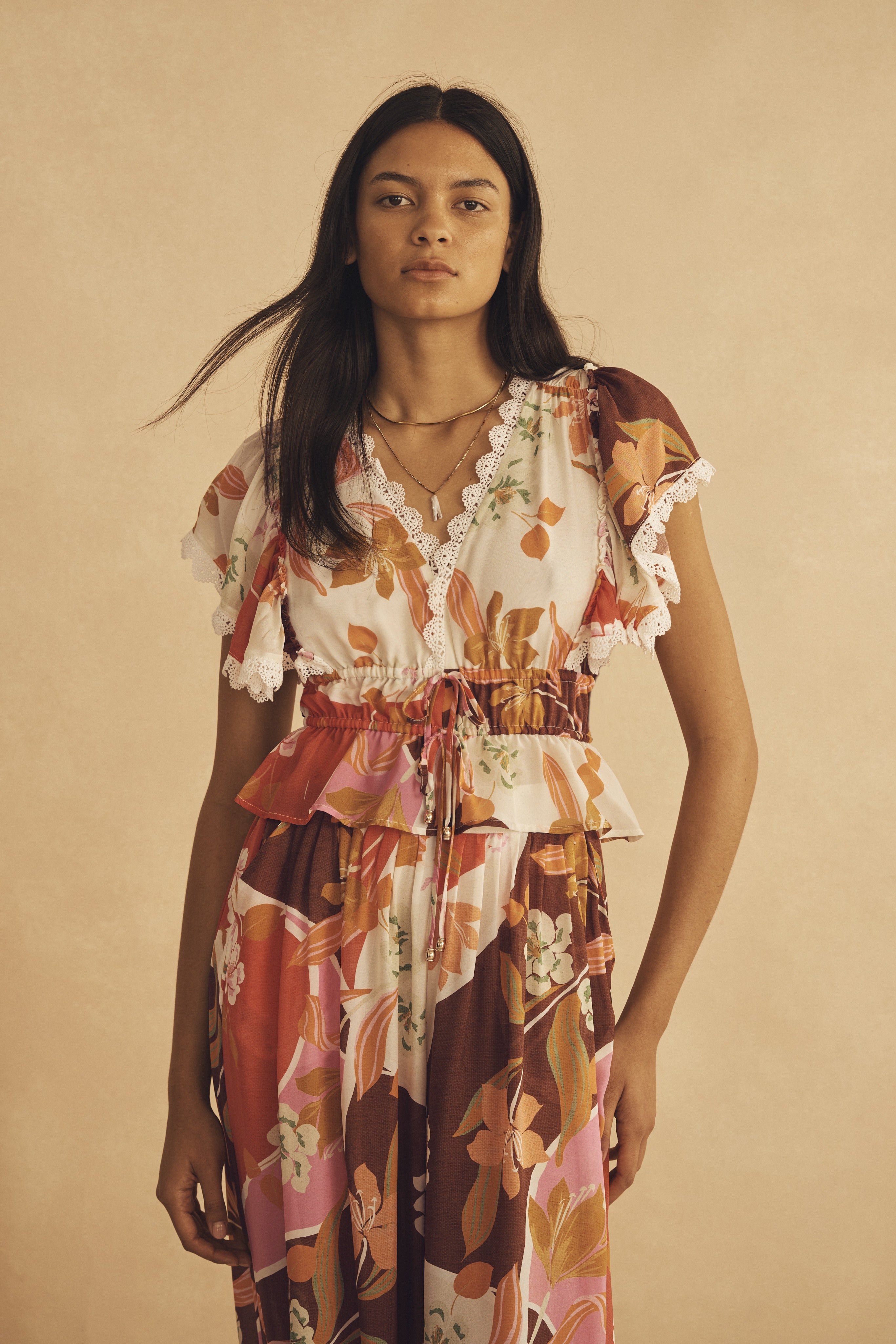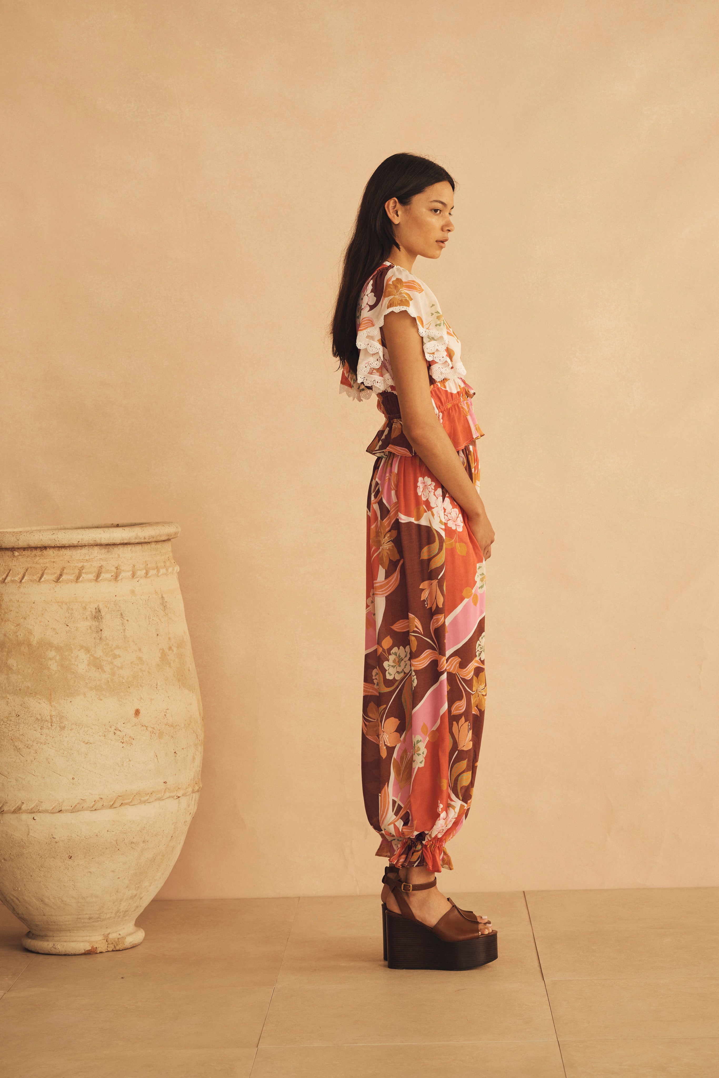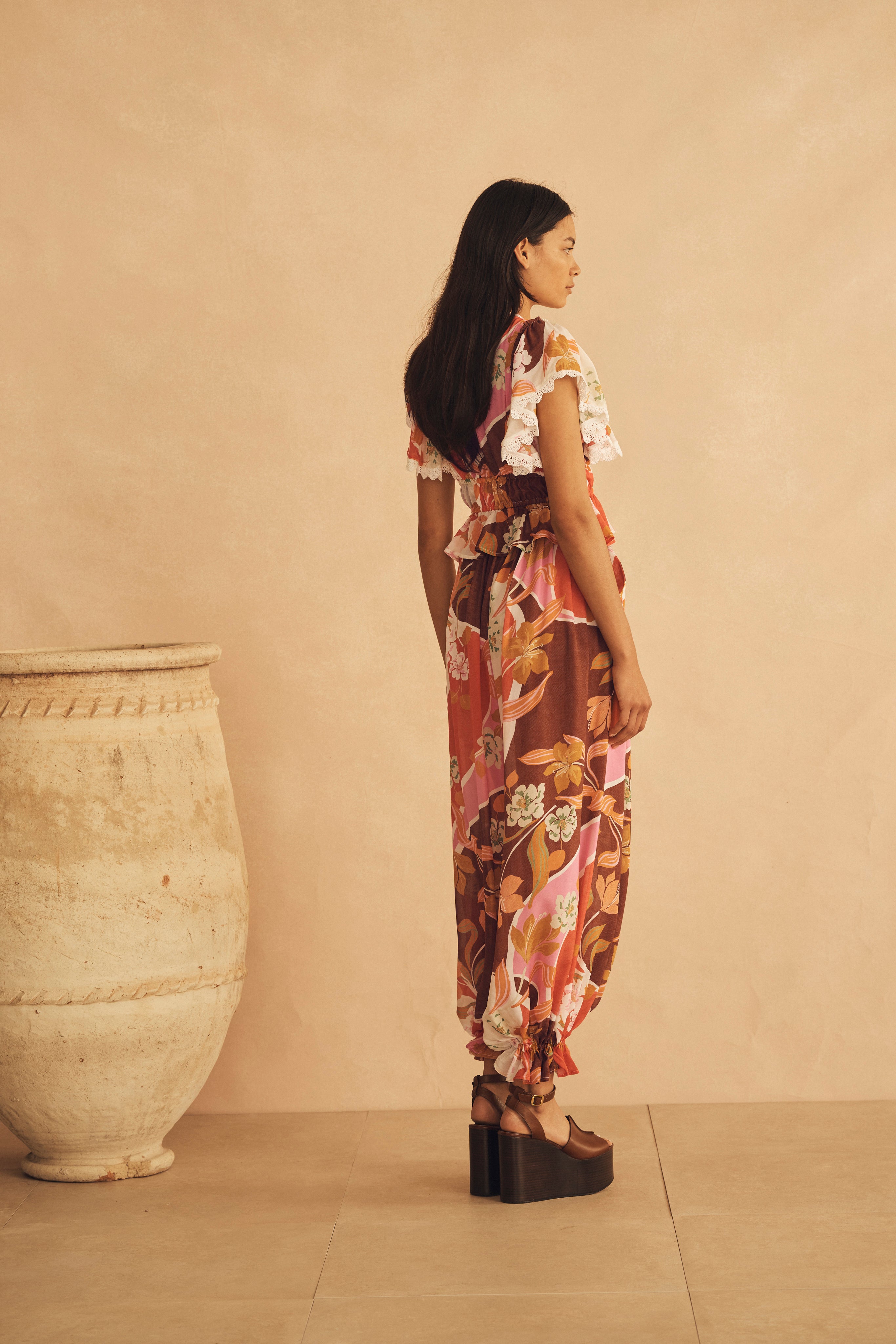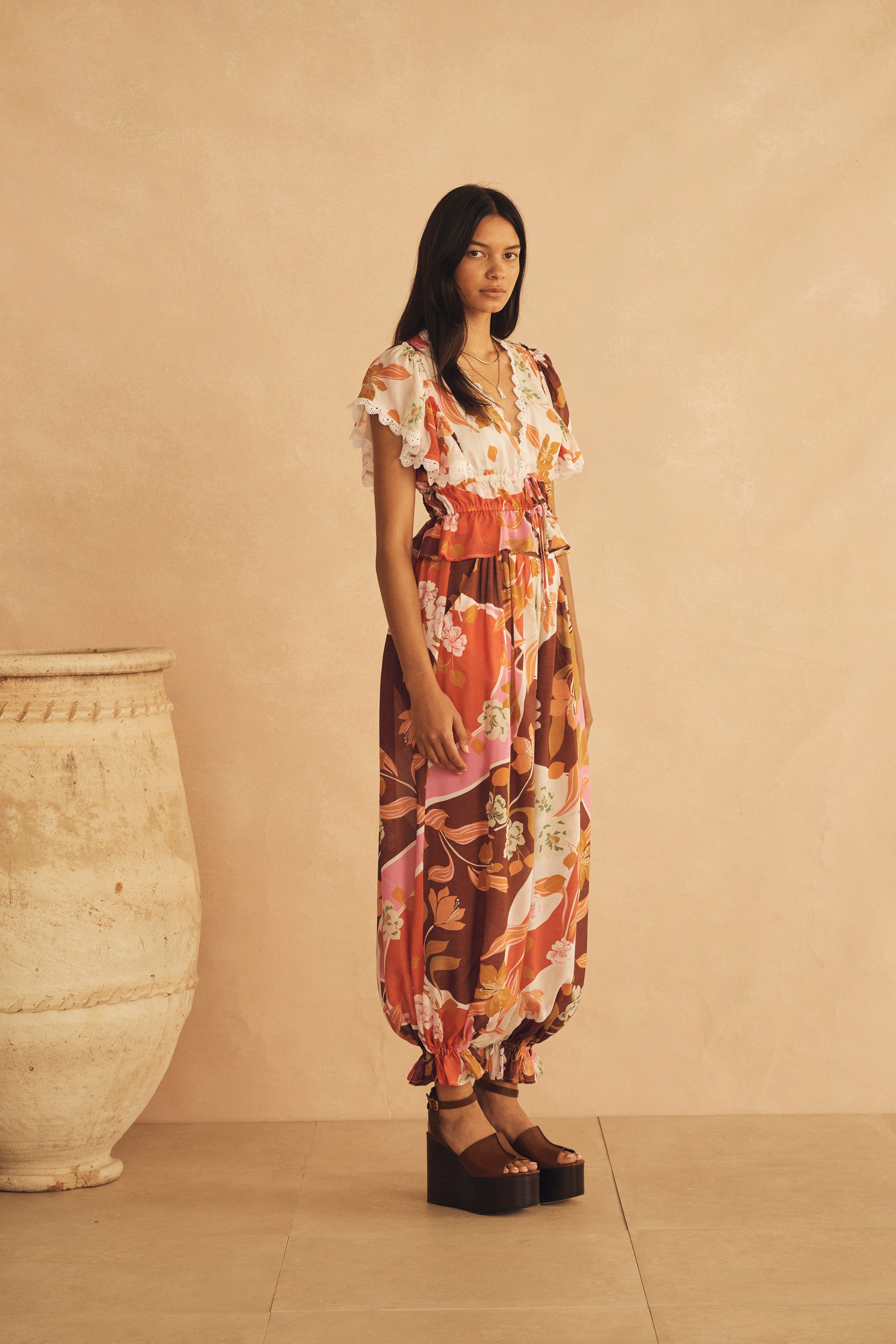 LUCCA is an exquisite floral garden motif, harmonizing rose hues with muted greens, a rich earthy brown, and vibrant accents of pink. Inspired by the serene elegance of Italian landscapes.