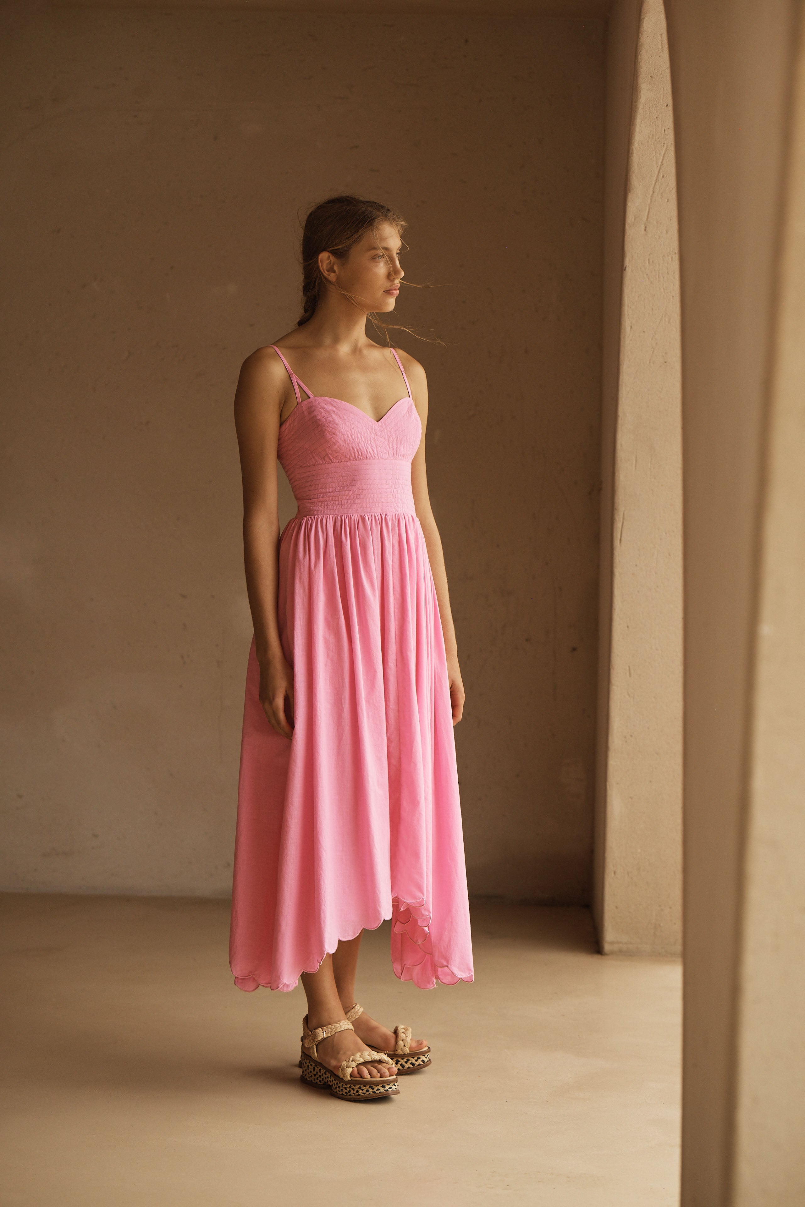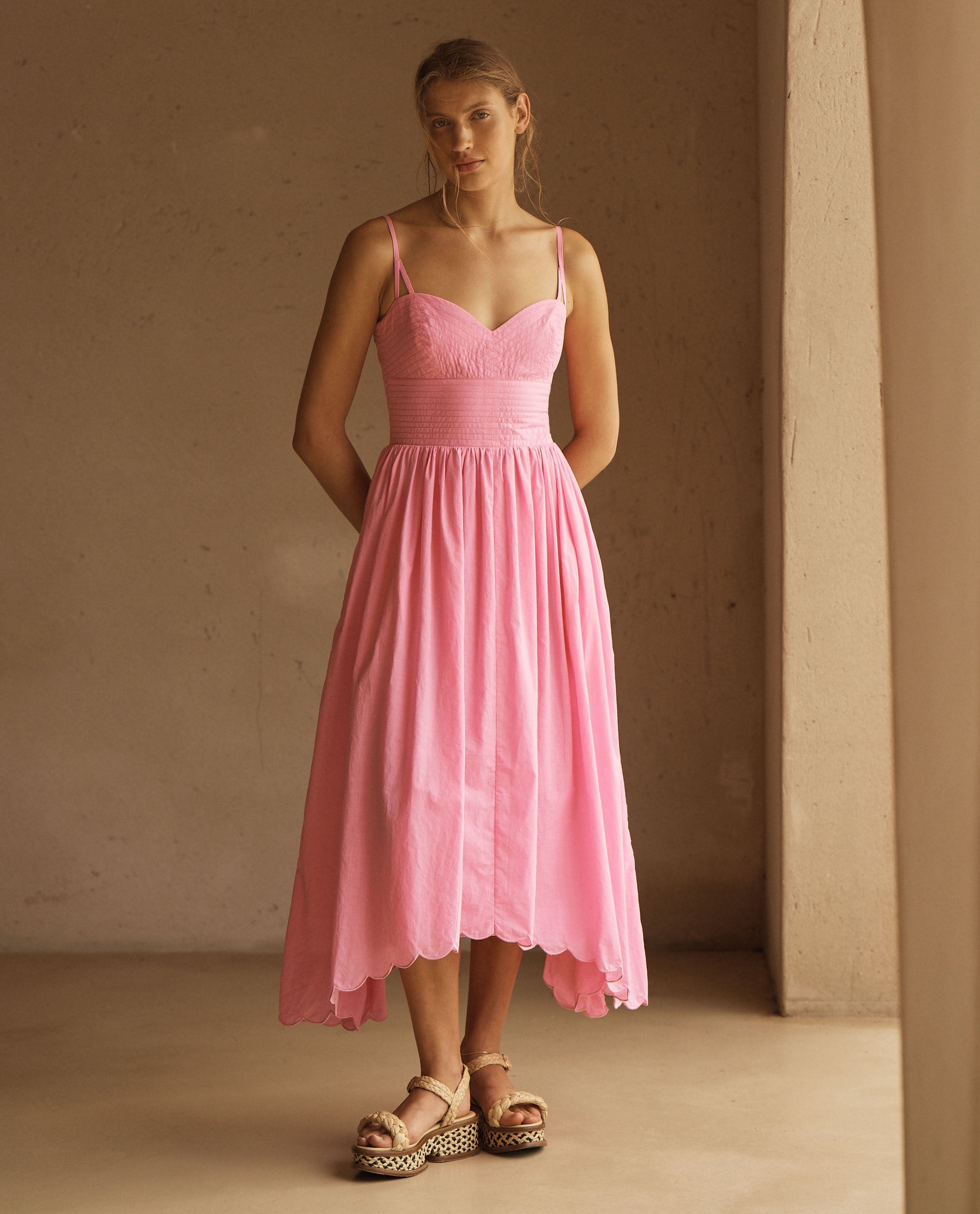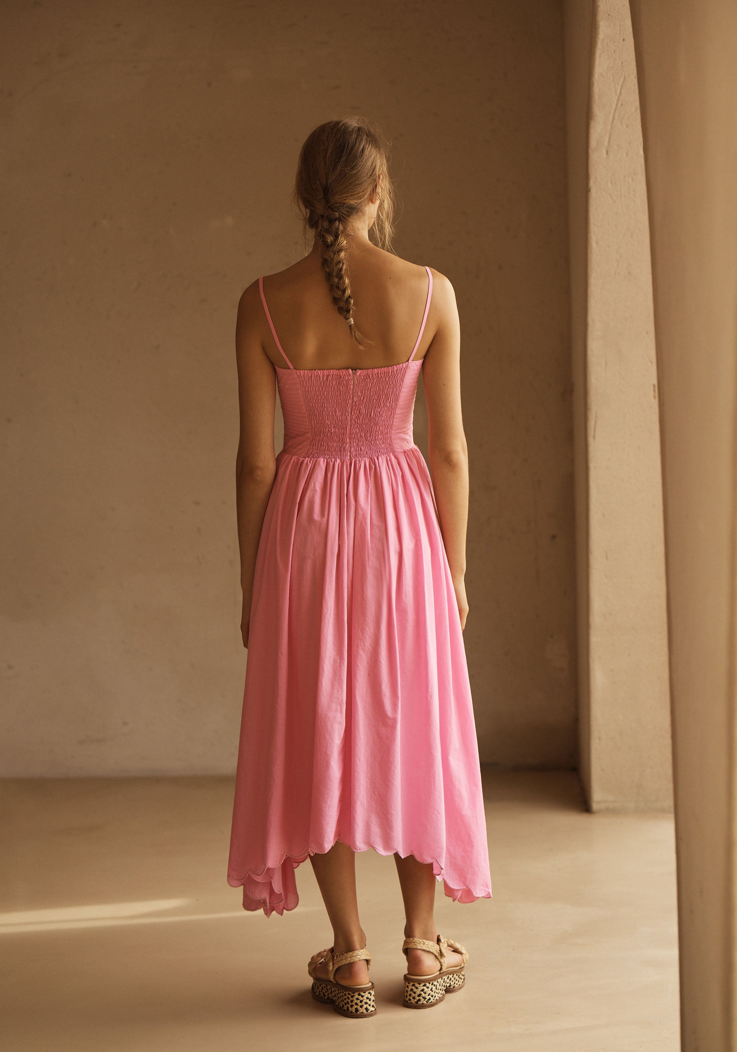 A feminine midi dress with a fitted, stitched bodice and gathered skirt. Scallop detailing decorates the scooped asymmetrical hem. An effortlessly elegant silhouette that can equally take you from brunch to a special occasion. This design features removable thin straps, adjustable in length. Style with a simple sandal or block heel.
