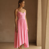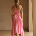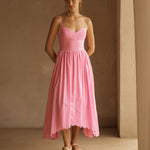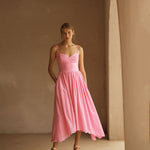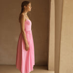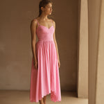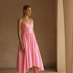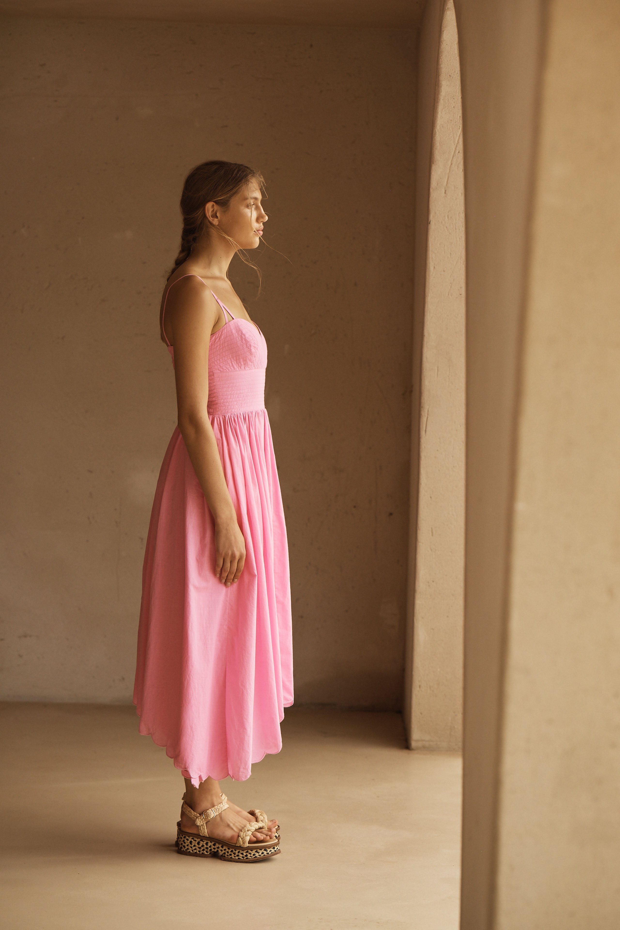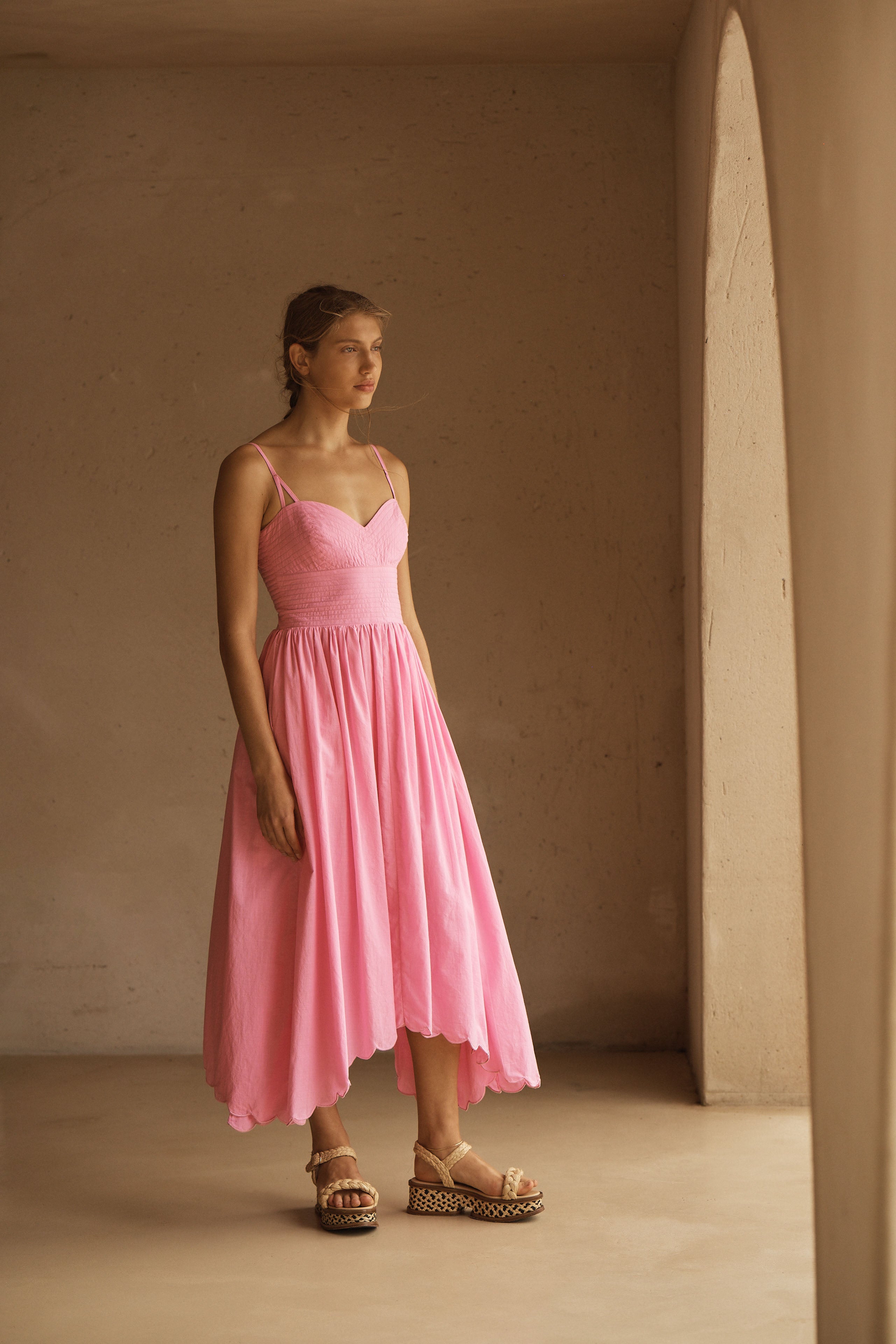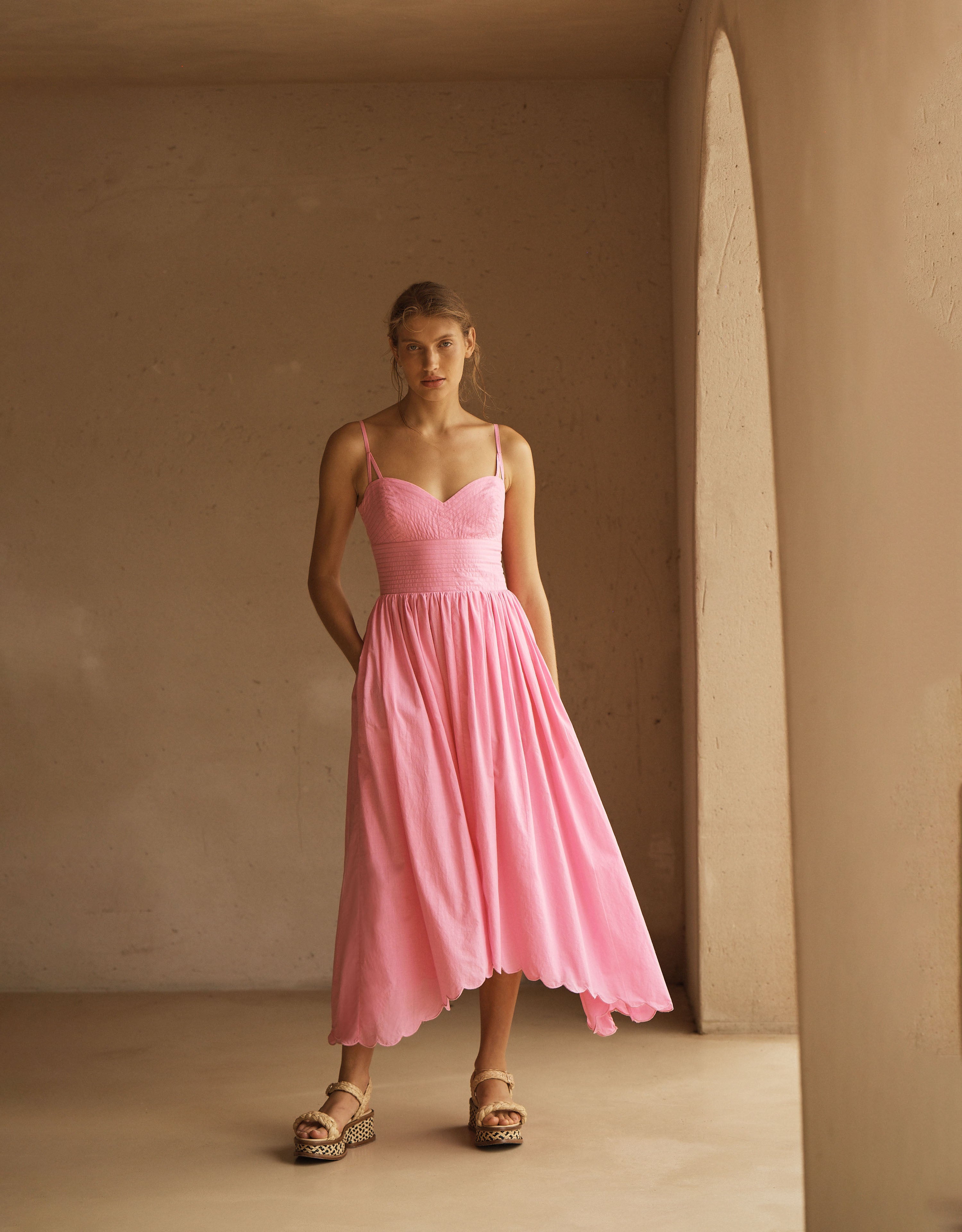 A feminine midi dress with a fitted, stitched bodice and gathered skirt. Scallop detailing decorates the scooped asymmetrical hem. An effortlessly elegant silhouette that can equally take you from brunch to a special occasion. This design features removable thin straps, adjustable in length. Style with a simple sandal or block heel.