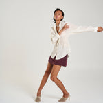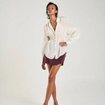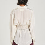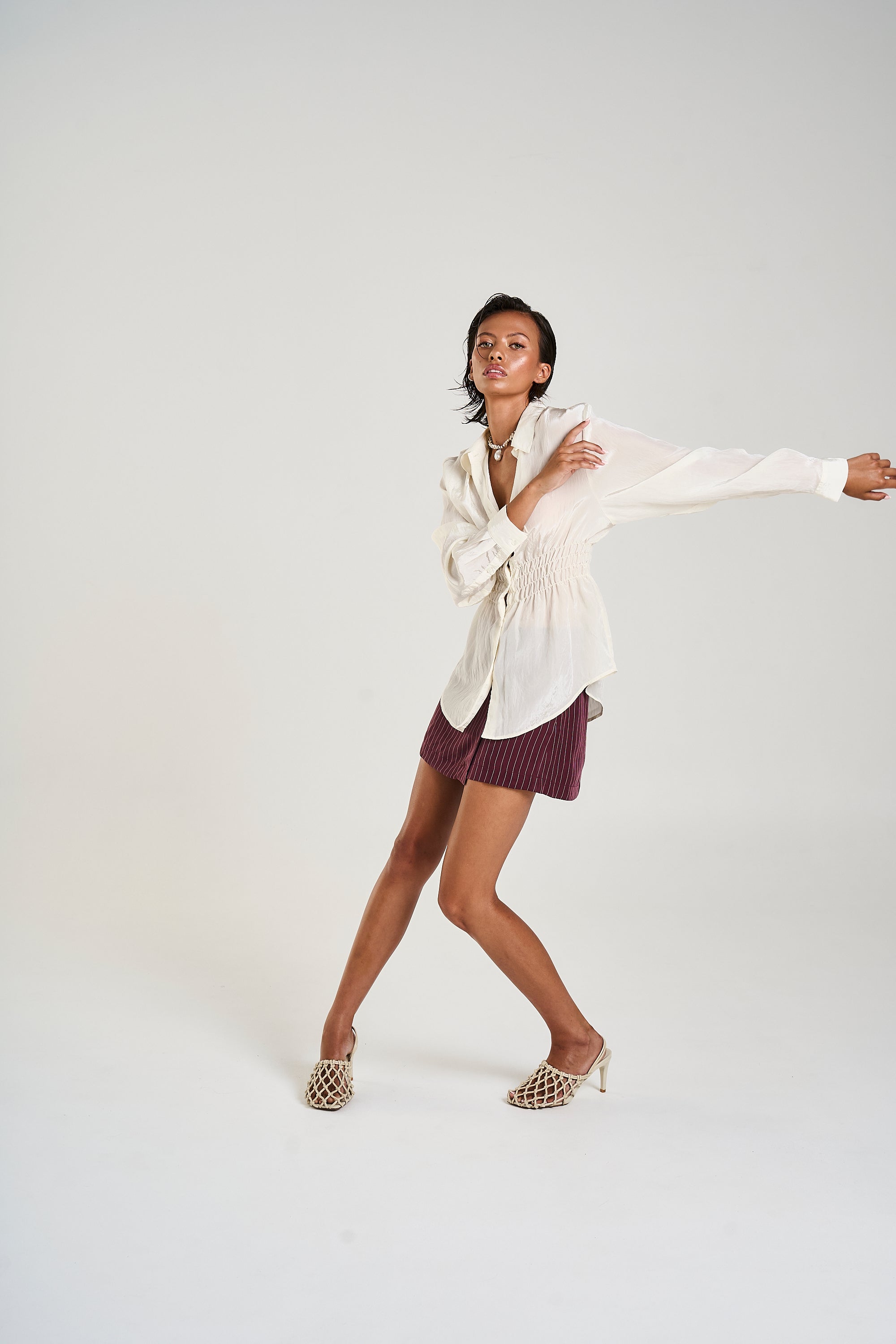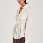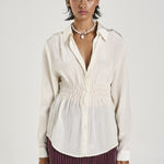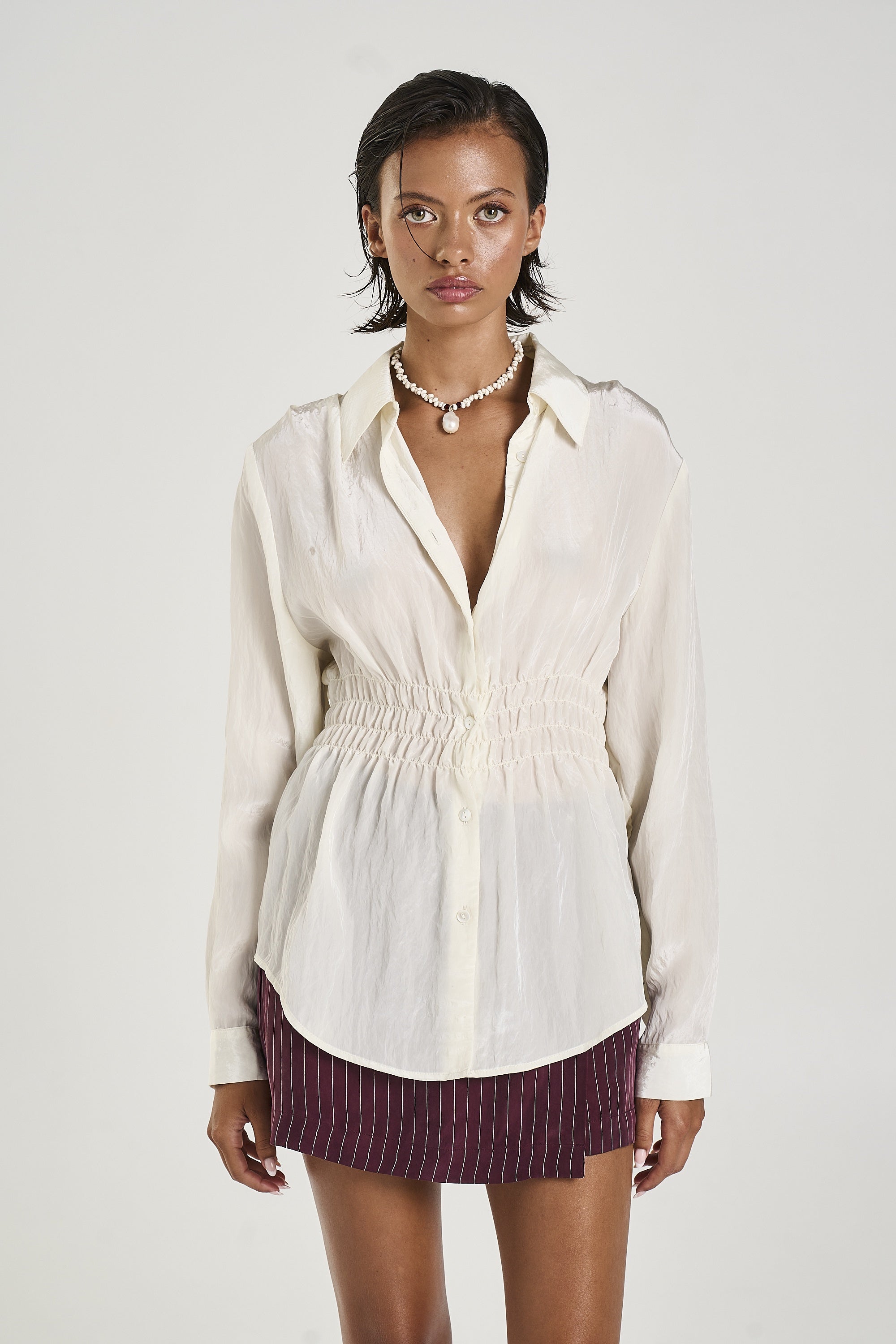 The Shirred LS Shirt in Sand is made from a viscose blend featuring a textured, crinkled effect. It offers a tailored yet gently draping shape, highlighted by a shirred, cinched waist for a refined fit.