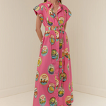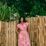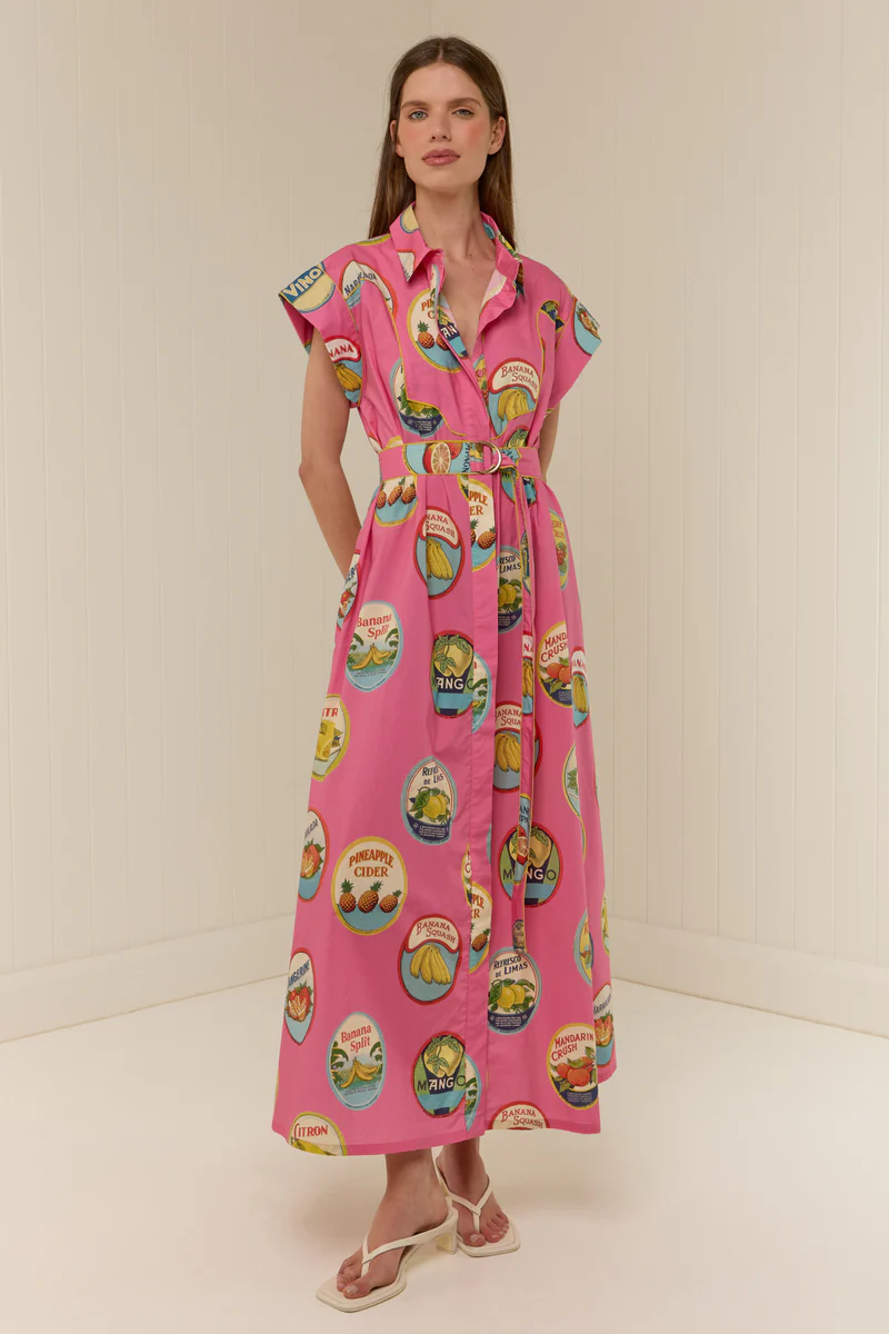 The Siren Dress is crafted from a premium Cotton Poplin in Palm Noosa's exclusive La Fruta print. Featuring a structured point collar and adjustable D-ring belt, the Siren Dress offers a crisp silhouette, finished with a western-style yoke and contrast piping for a relaxed yet elevated look.
