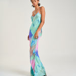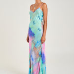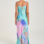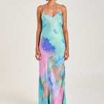 The Siren Dress showcasing the hand-painted abstract artwork H2O is a classic and flattering full length maxi dress with a v-neck and adjustable straps.