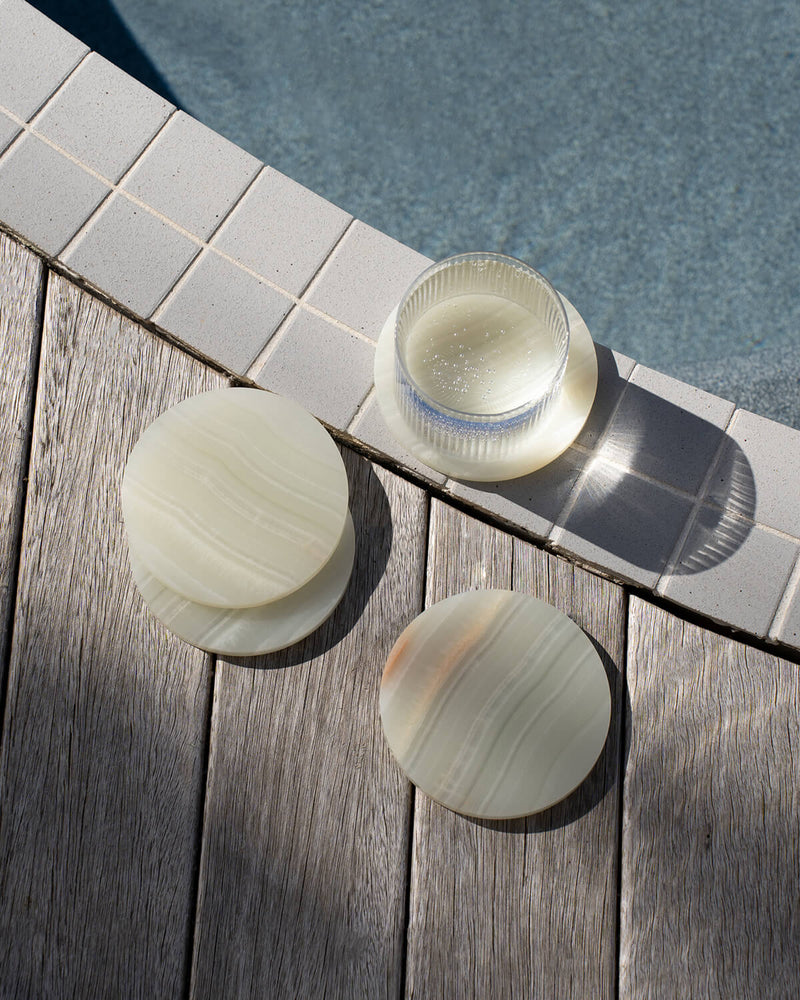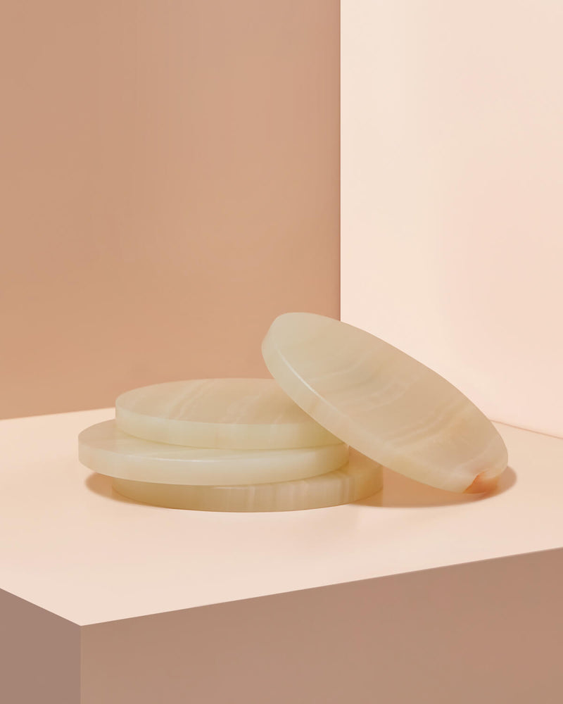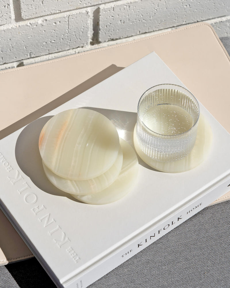 Hand crafted with precision in three versatile shades, these stunning coasters showcase the timeless beauty and earthy tones of natural travertine and the captivating allure of green onyx. The coasters' classic, slim-line design will fit seamlessly into any setting, making them perfect for entertaining or everyday use. Treat yourself or surprise a loved one with a stylish and practical gift that is guaranteed to elevate any interior space or entertaining experience. Constructed of either natural travertine or onxy with a honed, smooth finish, natural variations in the stone make each piece distinctive and unique.