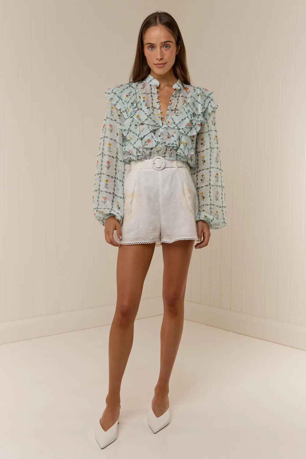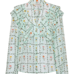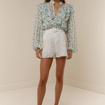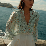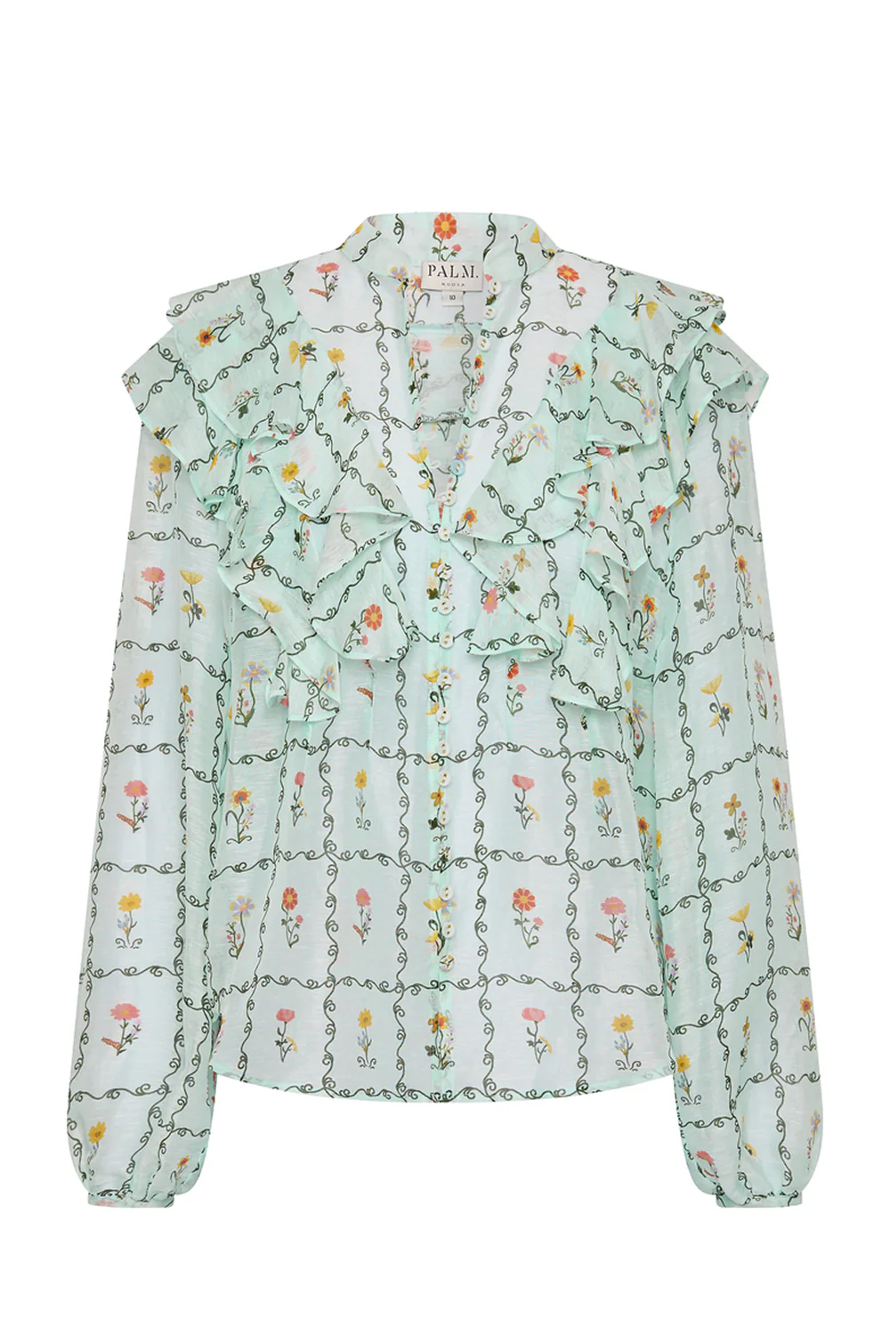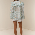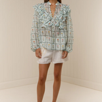 The Suki Blouse in Palm Noosa's exclusive Calypso Tile is crafted from a Premium Silk Linen blend. With a sheer finish, the Suki Blouse features blouson long sleeves, centre front button detailing and a double flounce frill providing additional coverage.