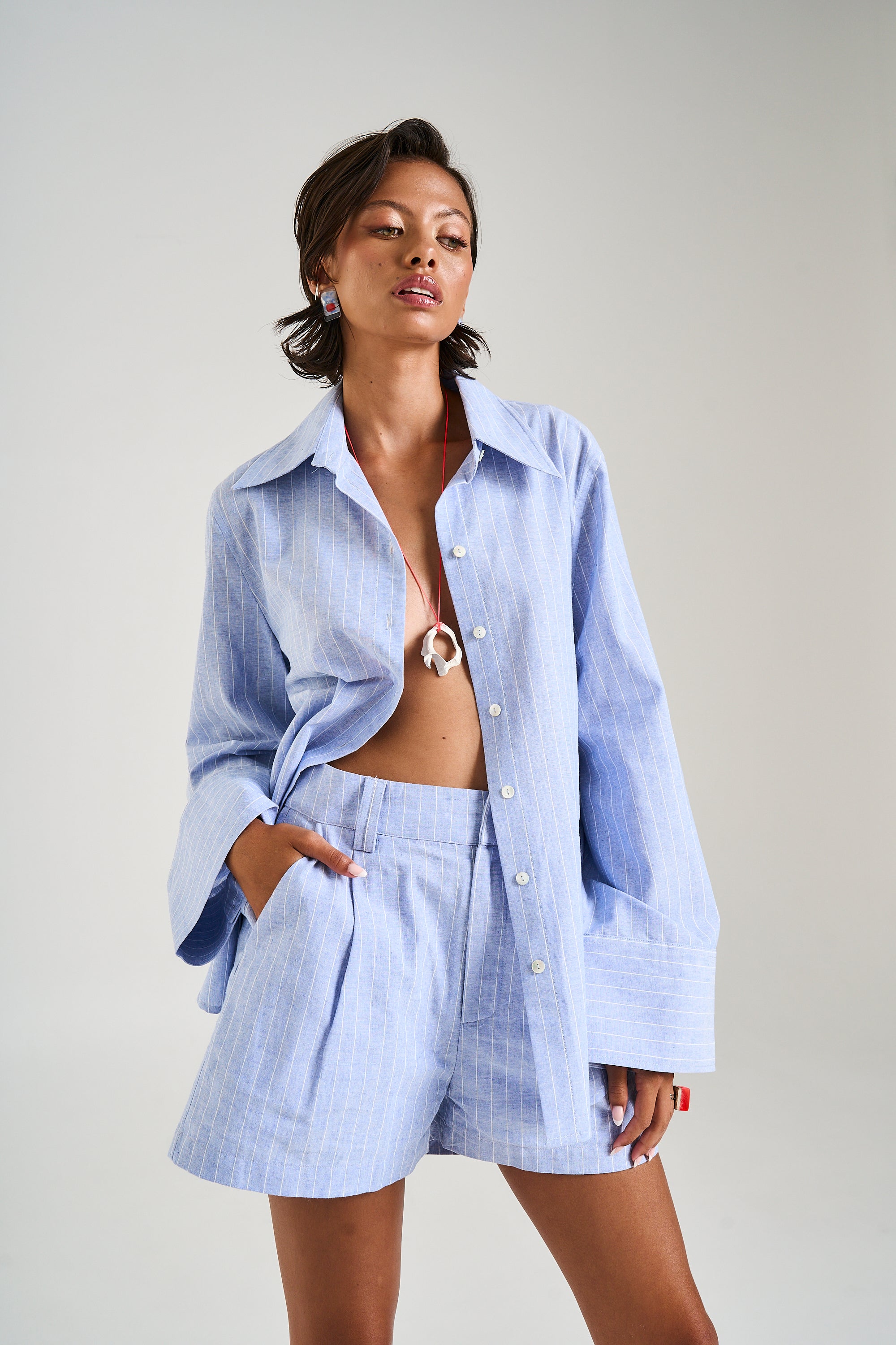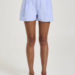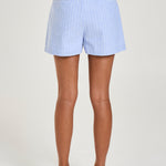 Expertly crafted from a cotton and rayon blend in Sea Stripe, these classic tailored shorts feature a concealed front zipper, belt loops, and pockets. Designed to sit high on the waist, with the option to size up for a relaxed, low-waisted fit.