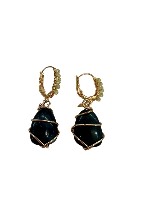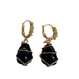 Gold plated earrings with fine gold, composed of a hard stone wrapped by hand with golden threads and mounted on a sleeper adorned with colored pearls.