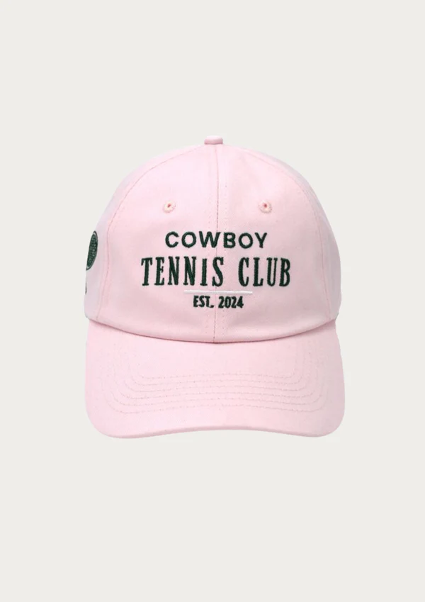 Embroidered Cowboy Tennis Club branding on pink cotton.