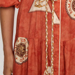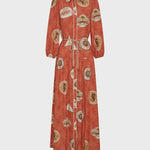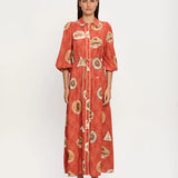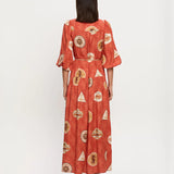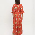 Vacanza is vintage motifs set against a rich, warm red base. The Vacanza Maxi Dress features a slight blouson sleeve, button down front, complete with a removable braided belt.