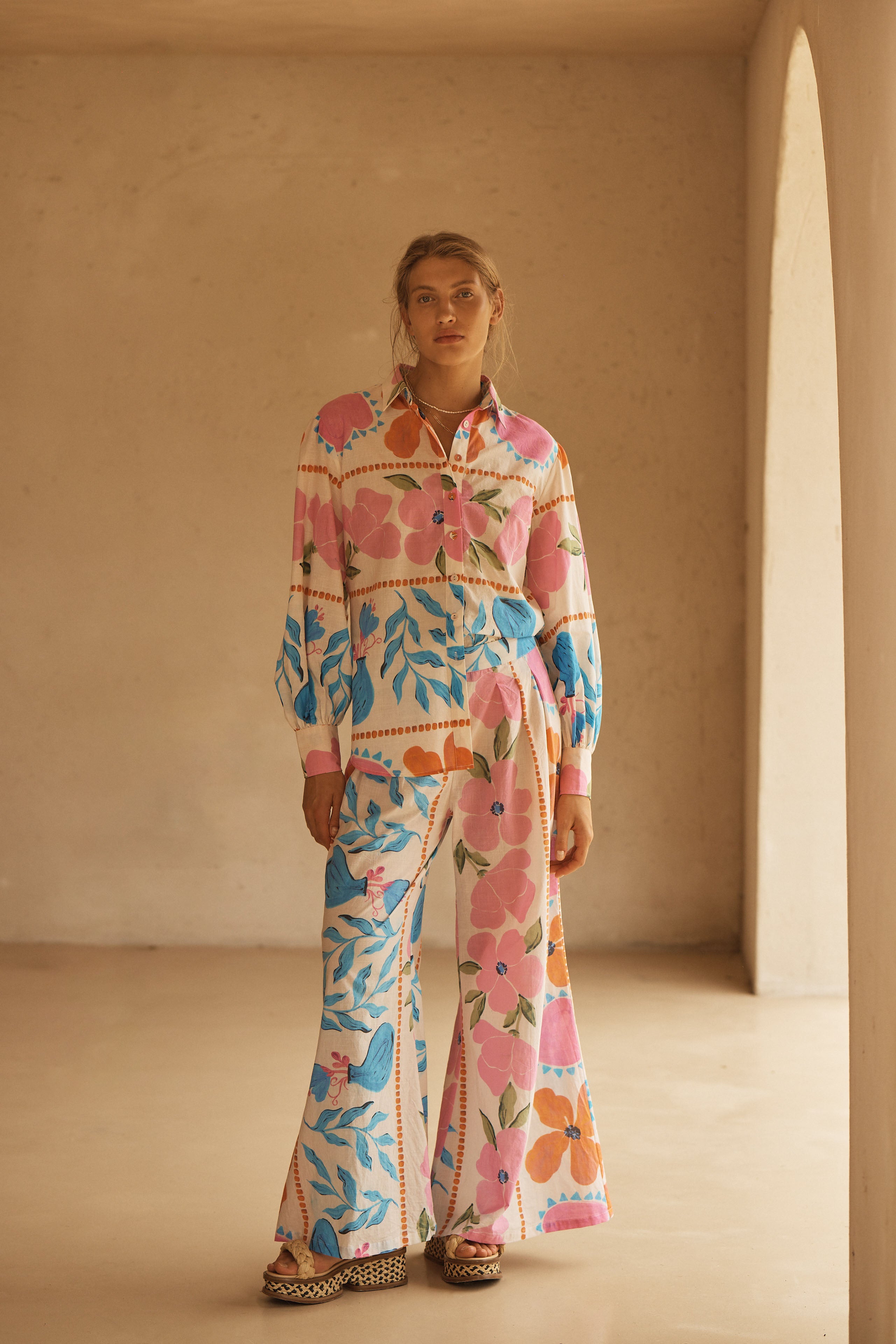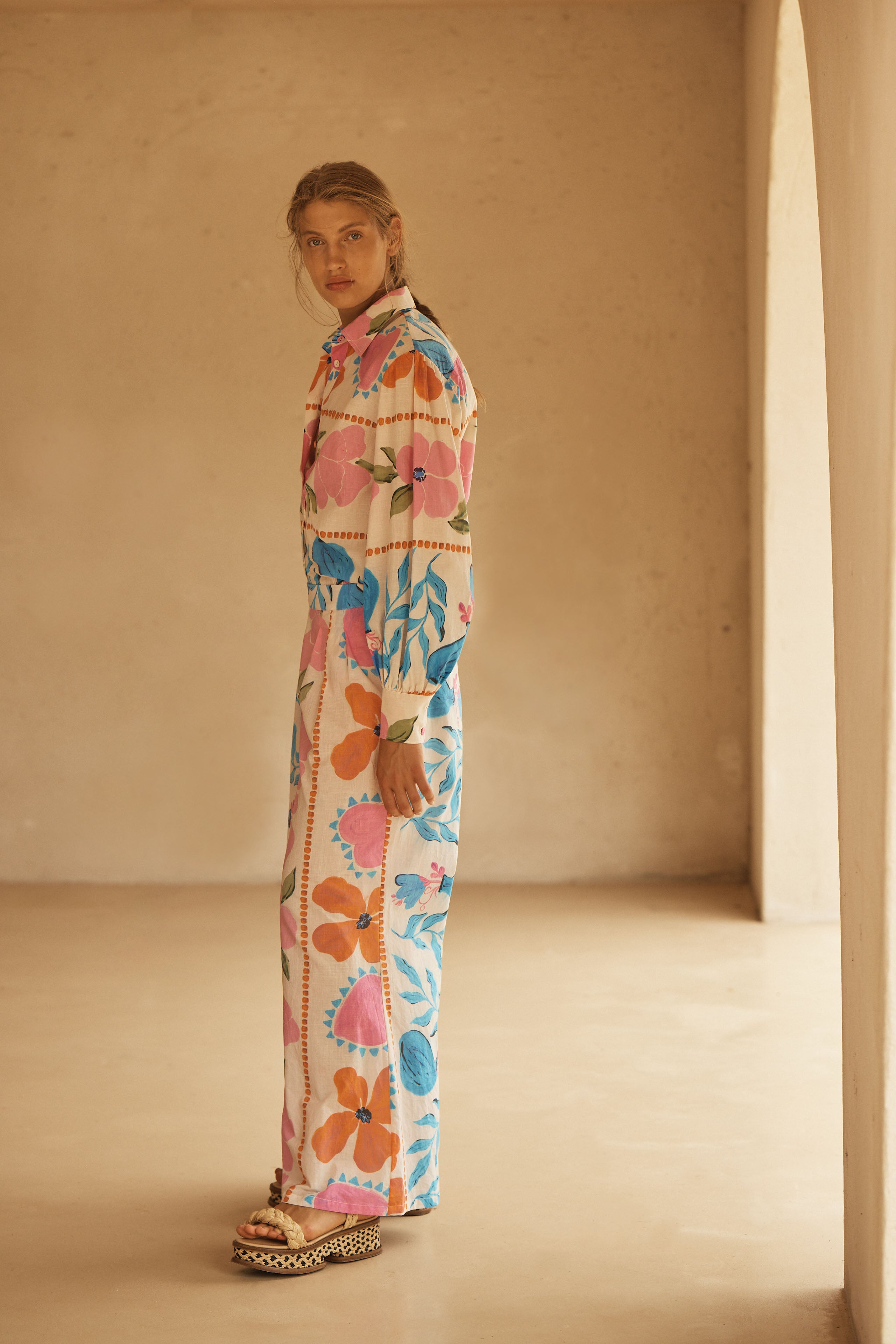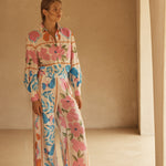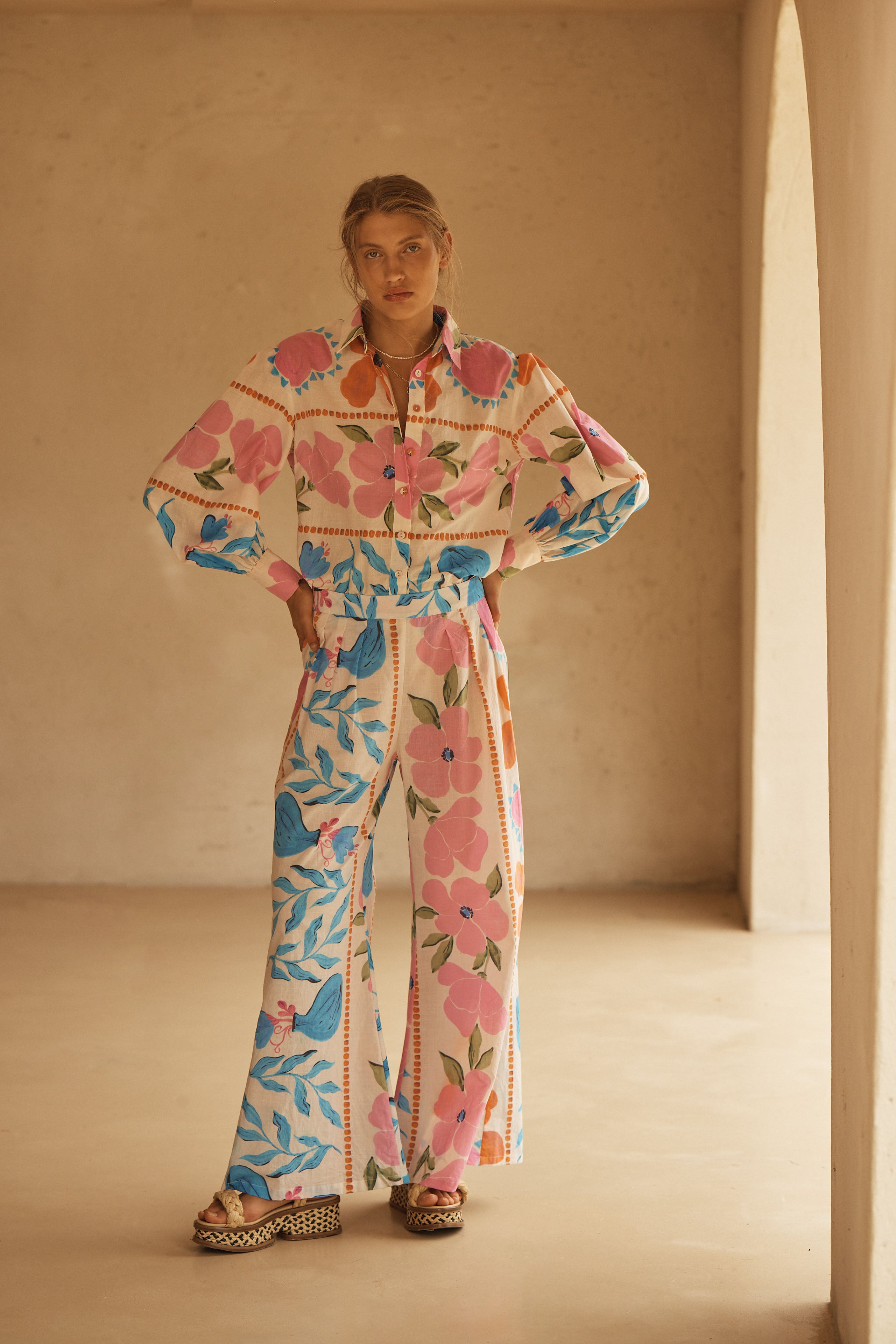 BOTANICO’s stunning display of exuberant florals feature a symphony of sky blue, pink and orange hues dancing on a coconut canvas, evoking the serene yet spirited energy of a sun-drenched European garden.