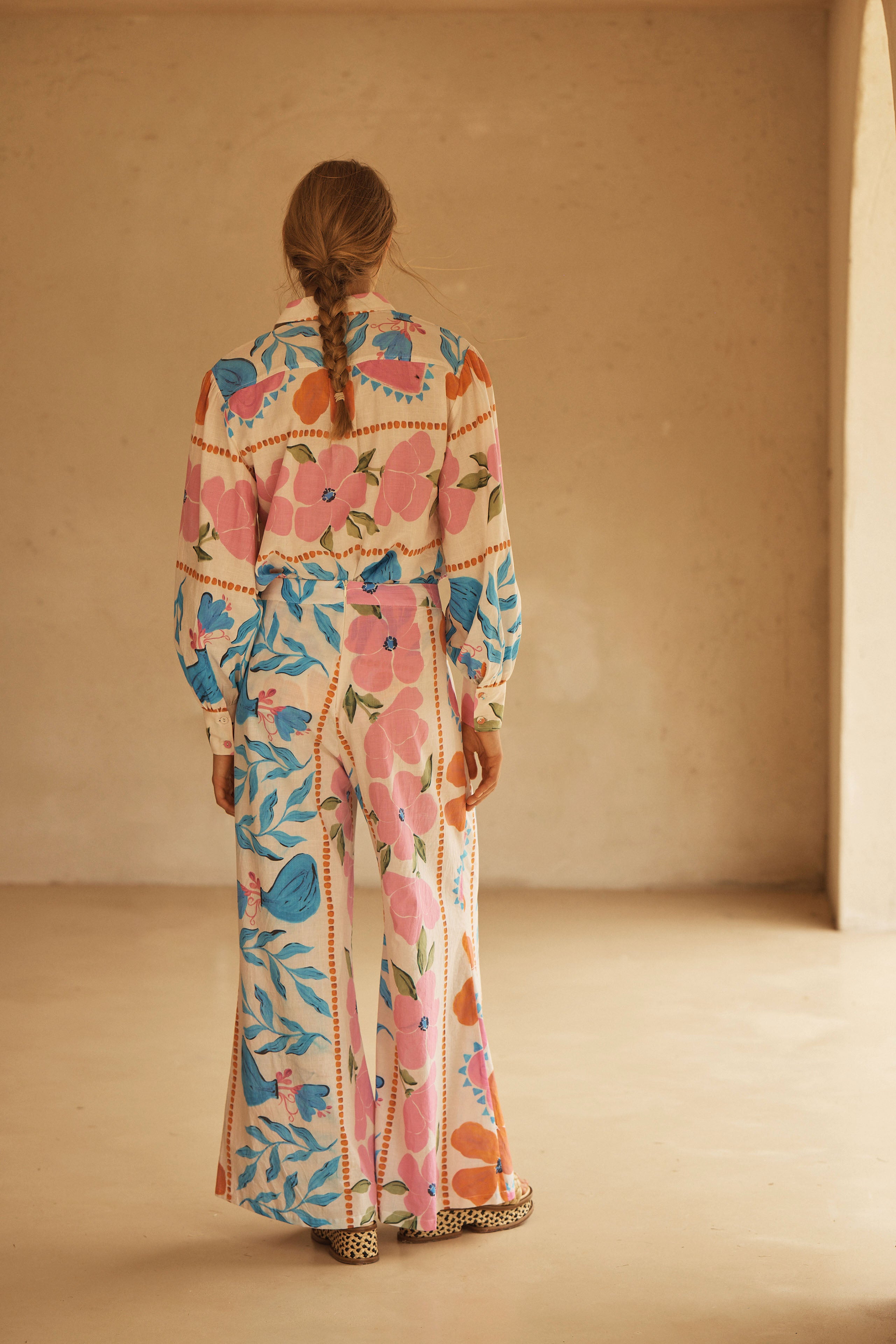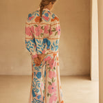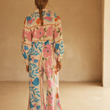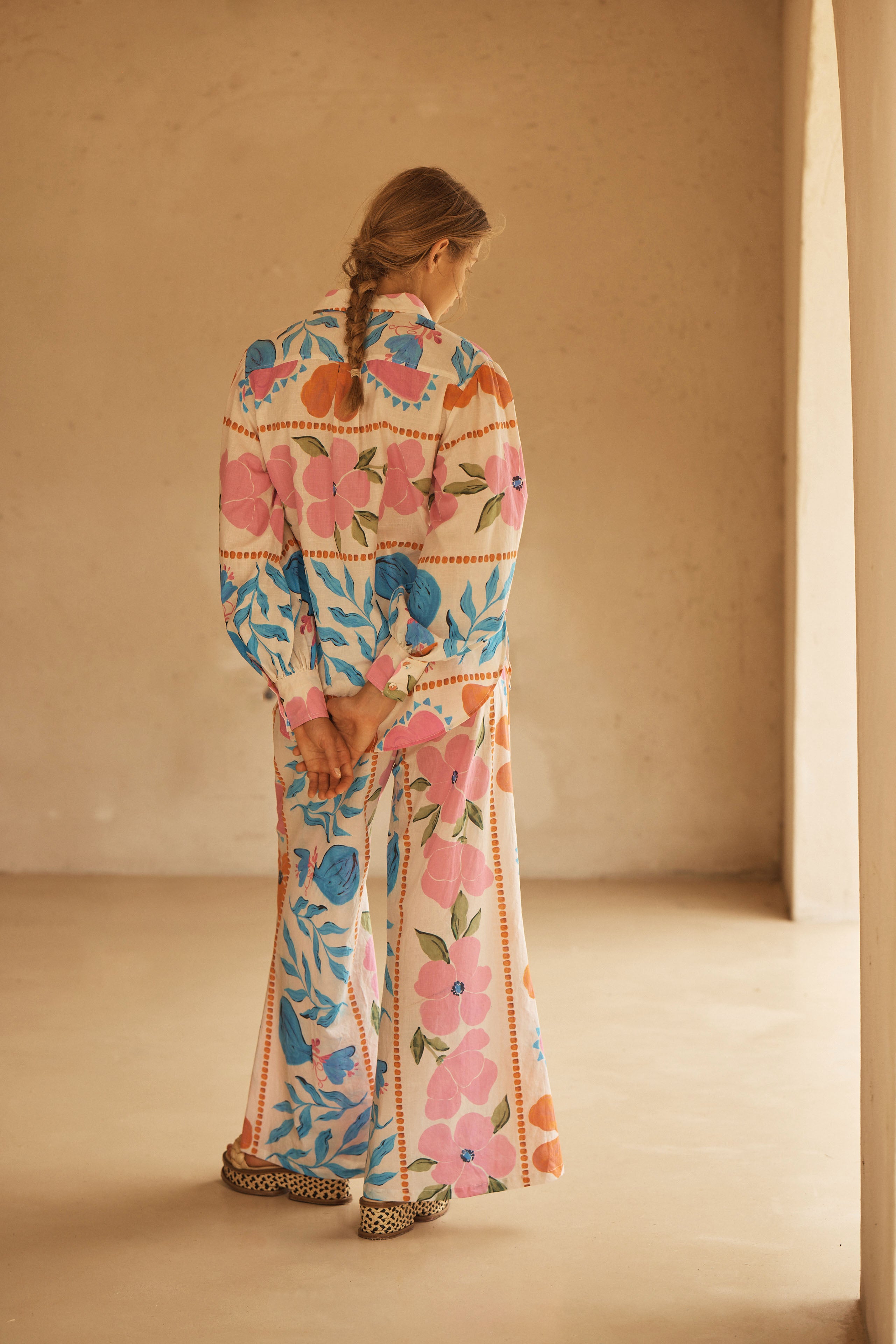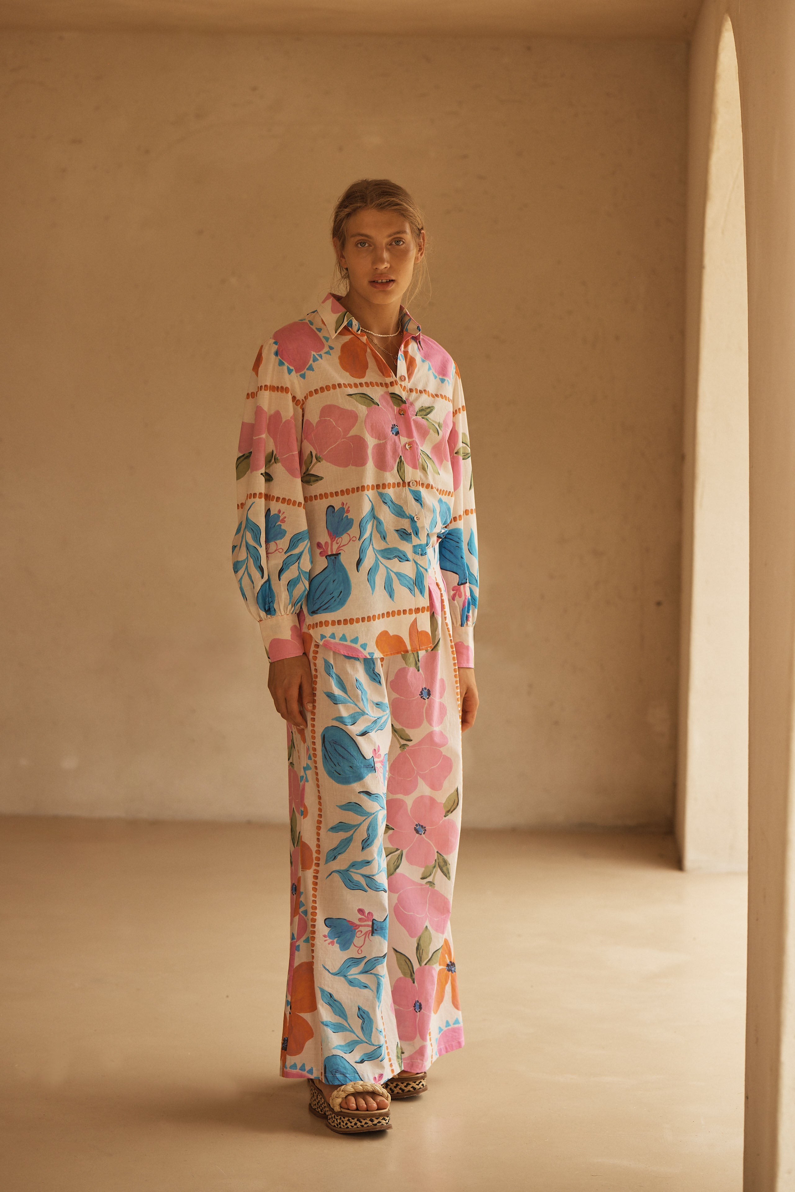BOTANICO’s stunning display of exuberant florals feature a symphony of sky blue, pink and orange hues dancing on a coconut canvas, evoking the serene yet spirited energy of a sun-drenched European garden.